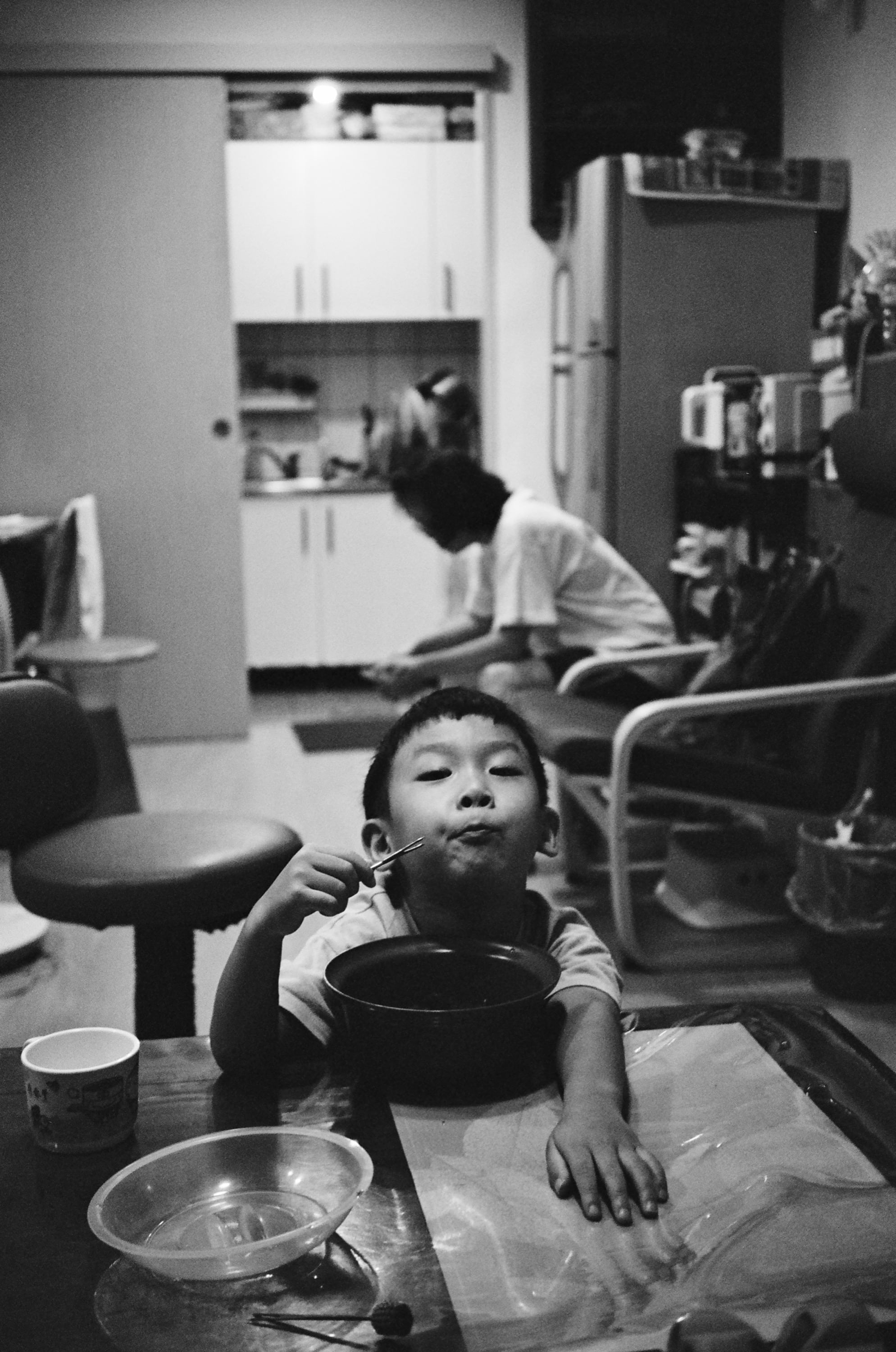 徐家日常,前方是正在吃飯後水果的孫子,後方是抓到時間稍微休息一下的阿嬤。