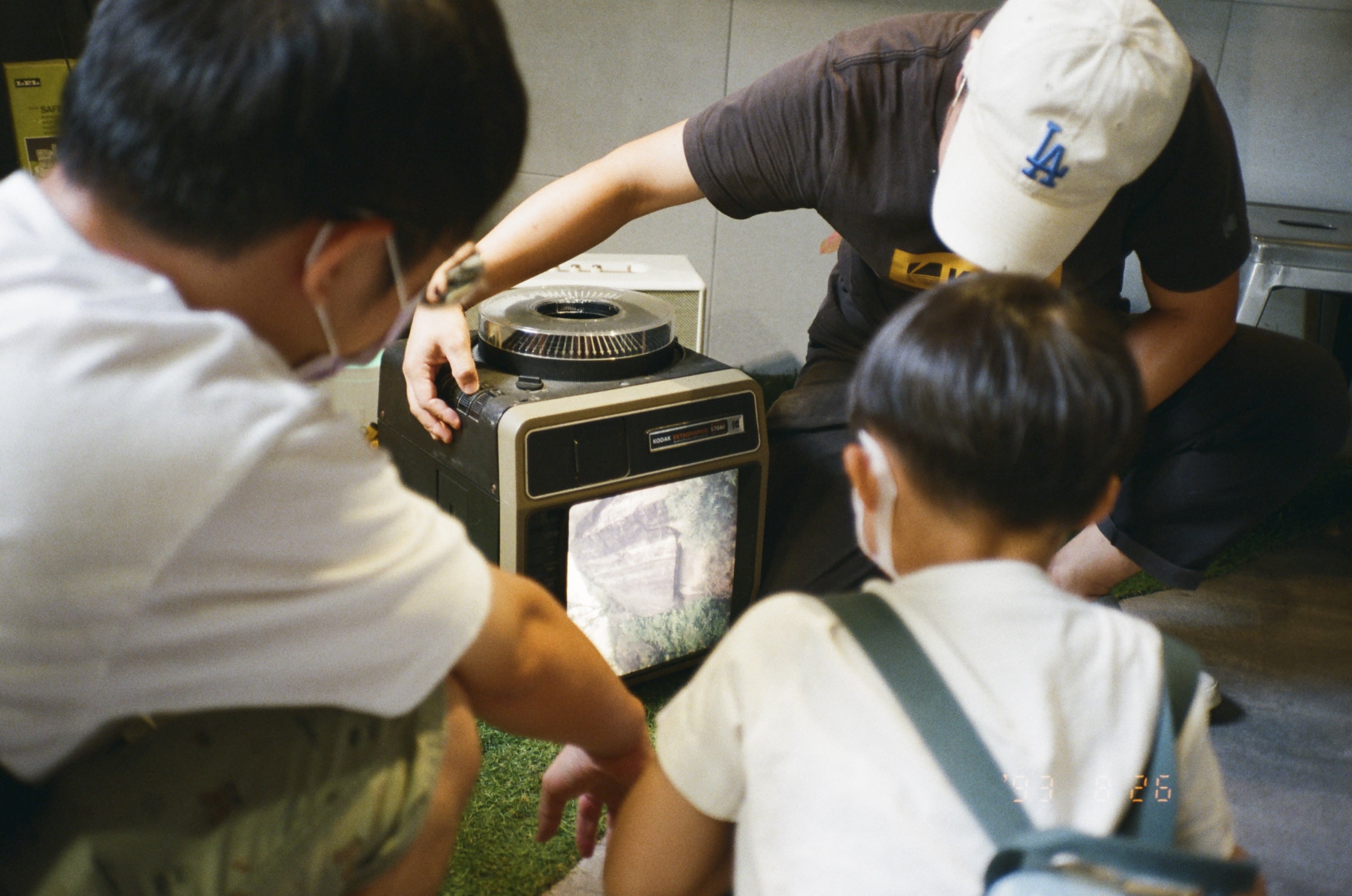 老師現場在研究一台自帶螢幕的 Kodak 幻燈機,現場我們有測試將我們自己沖好的底片放進去播放,真是一台超酷的古董。