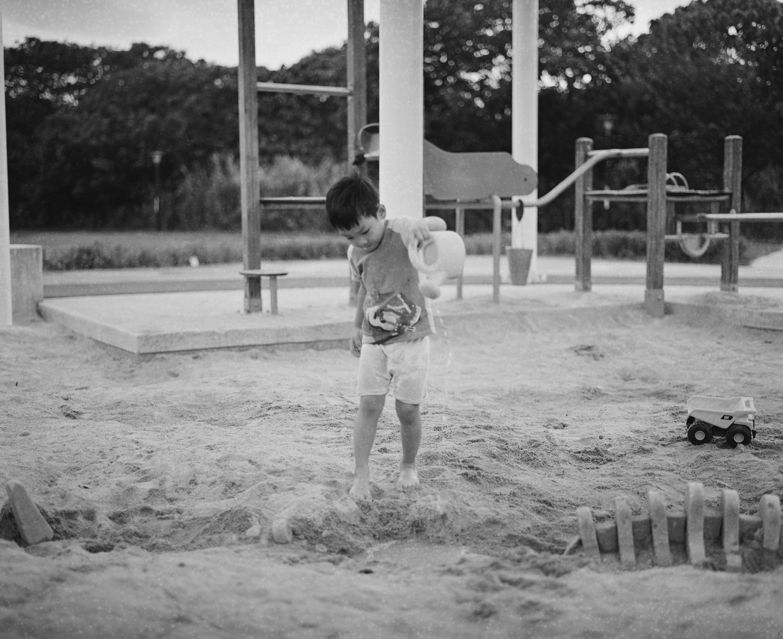 我覺得如果要讓底片徹底進入生活,把相機隨時帶在身邊是一個好方法,不過因為我背 Pentax 6x7 的那陣子,一整天的生活安排都一成不變,實在不知道要拍些什麼,也沒什麼好拍的。於是,有天兒子下課,我們一起去公園玩沙時,那個下午我就按了 7 張快門,因為好想把這卷底片拍完。