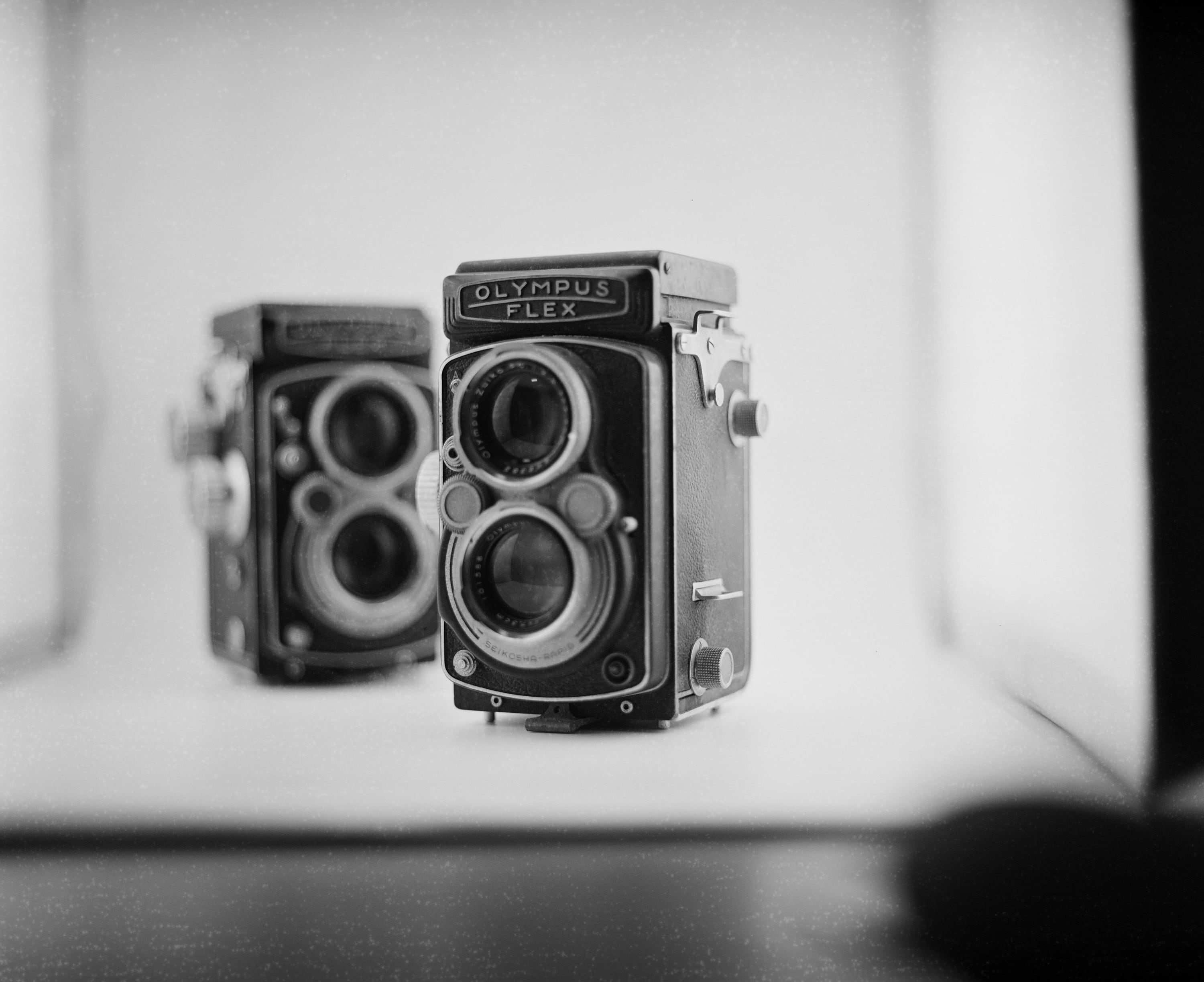 以 6x7 中片幅相機拍 6x6 中片幅相機,圖為兩台 1953 年發表的 Olympus Flex B II 75mm f2.8,我正在研究這兩台的機況哪裡不同。