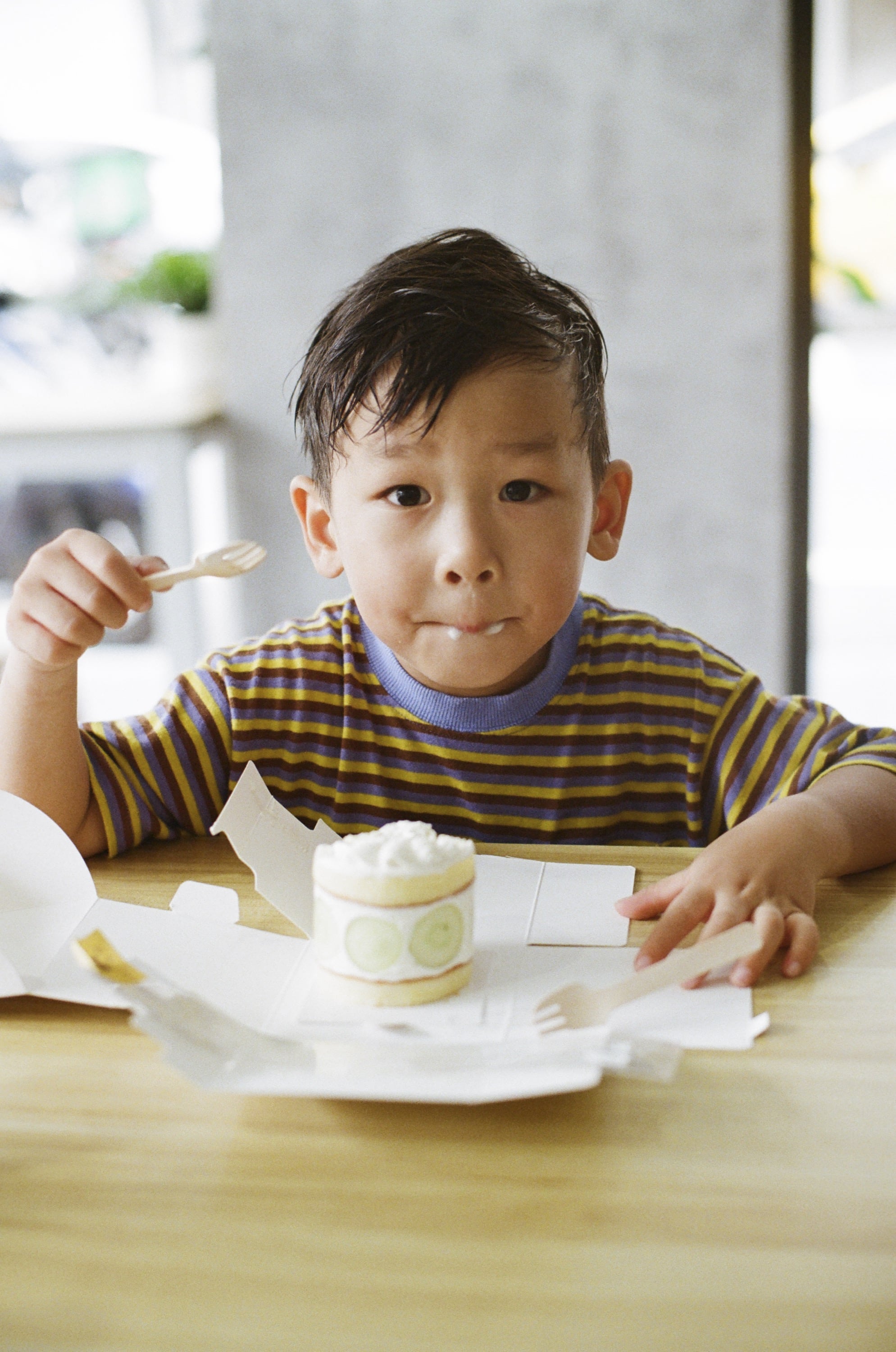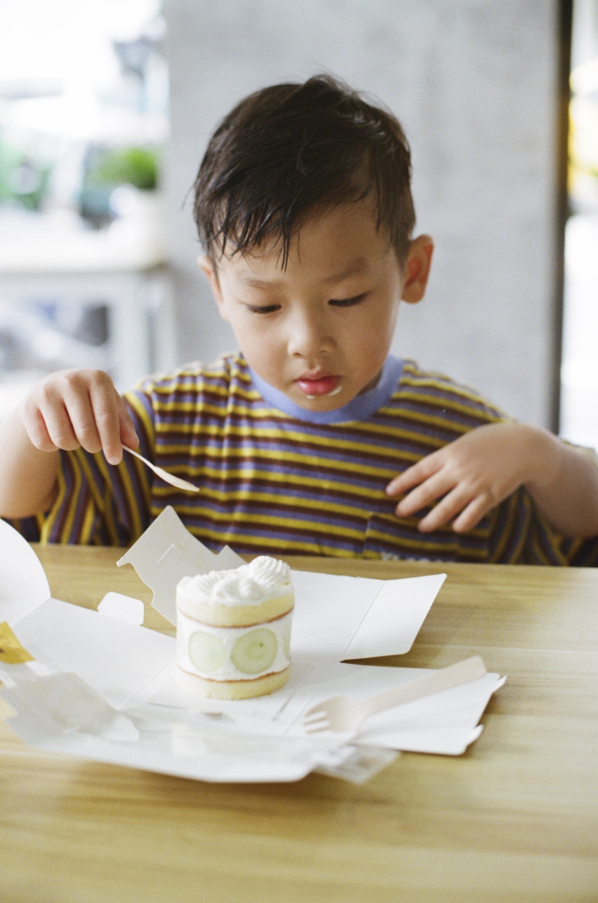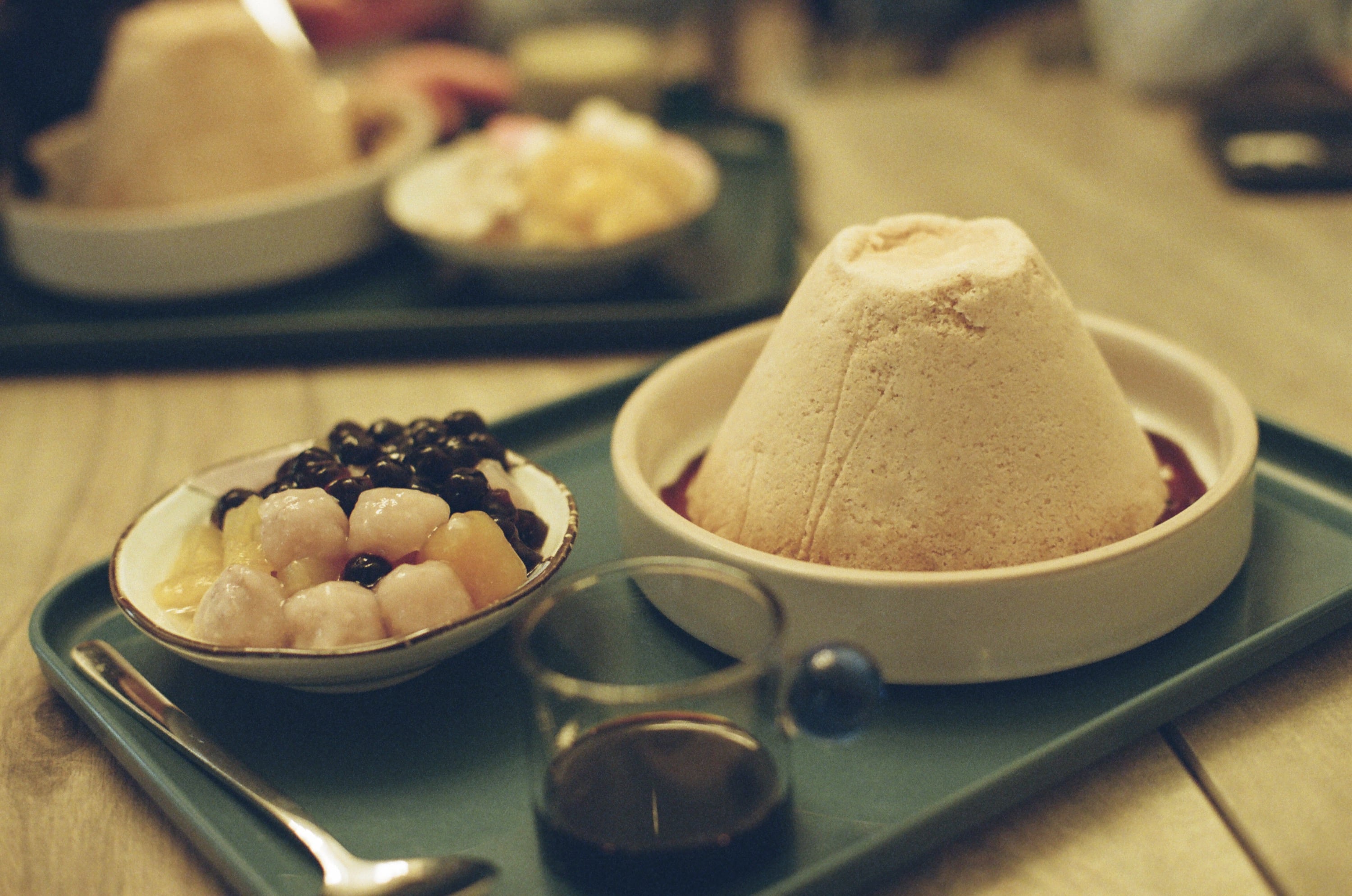 我們那天帶兒子去台灣昆蟲館上課,上完課後去對面的一間冰店吃冰(店名:醬吃冰)。這家冰店的老闆要求高(講好聽的龜毛),但東西好吃。以前拍這種照片一定是不假思索地最大光圈開下去然後直接拍,現在懂得要縮光圈,提高畫面清晰與模糊之間的層次變化,關於景深控制,受限於室內光源不足,我是直接用稍微旋轉盤子的方式調整食物角度,將冰與配料轉到同一個平面上,這樣兩個被攝物就會落在同樣的景深範圍內,就不用再縮光圈,並且讓兩者同時清楚合焦。因為光圈只用到 f2.8 的關係,讓前後景的都還是可以保有一定程度的散景模糊。