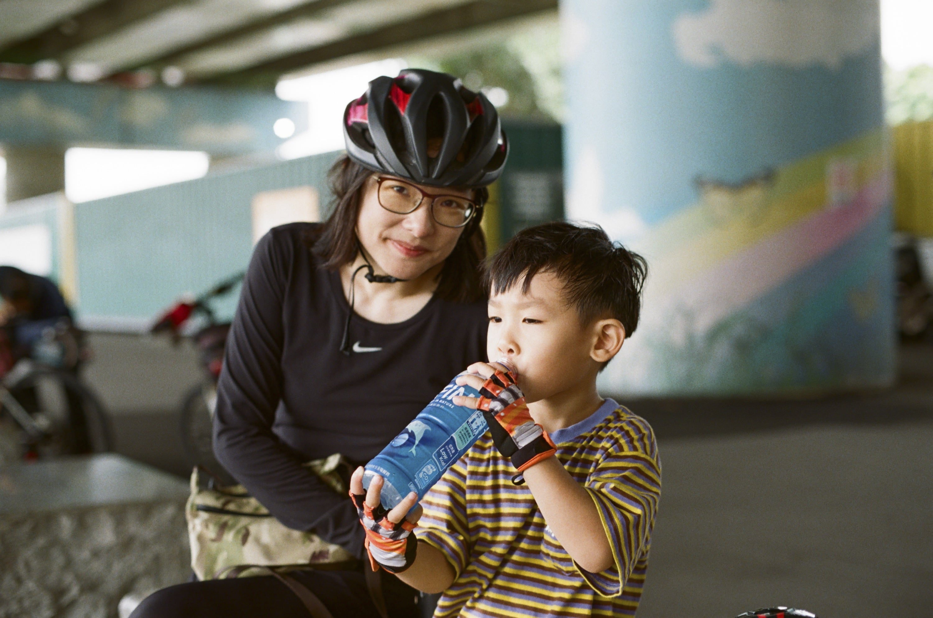 想不到兒子的體力竟然還行,此時我們已經騎到板橋這邊的華江橋下了,兒子正在喝 Fin。