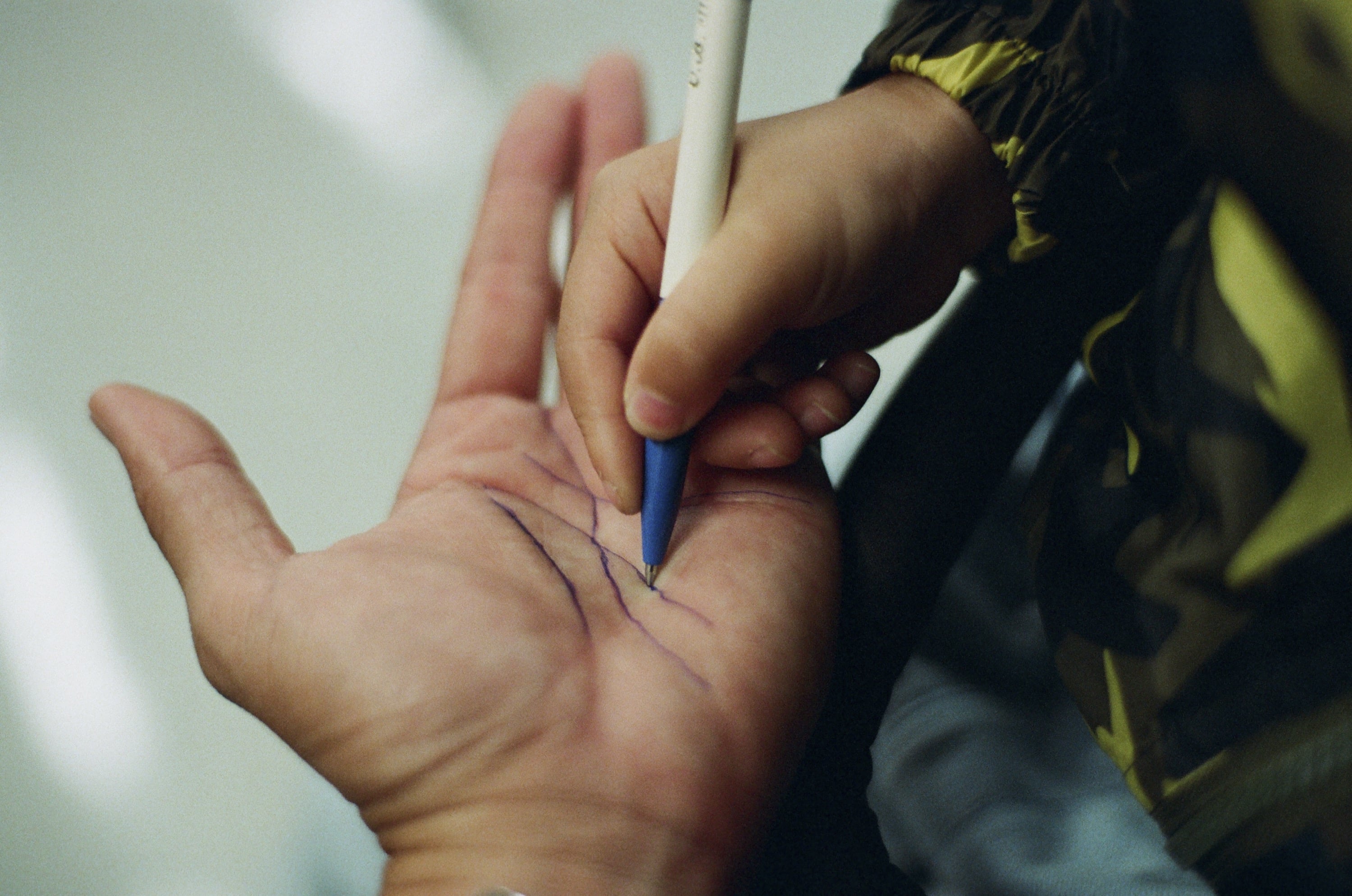 和兒子搭捷運不知道要幹嘛,我突然跟他介紹起「掌紋」這個東西,並告訴他說每個人的掌紋都不一樣,就像指紋一樣。為了有趣,我們互相拿原子筆畫對方的手掌。兒子畫我的左手時是用右手,畫我的右手時竟然可以切換到以左手執筆作畫,有點厲害。