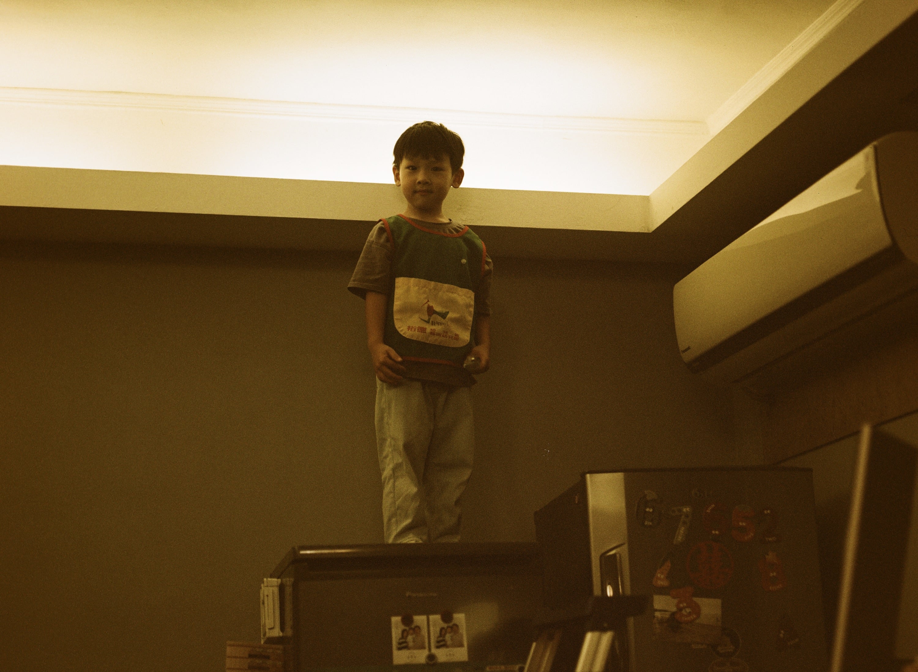 爬到冰箱上很得意的四歲小孩。通常只有爸爸帶小孩才會允許這種事情發生,然後還拍照留念,而且還中片幅底片。