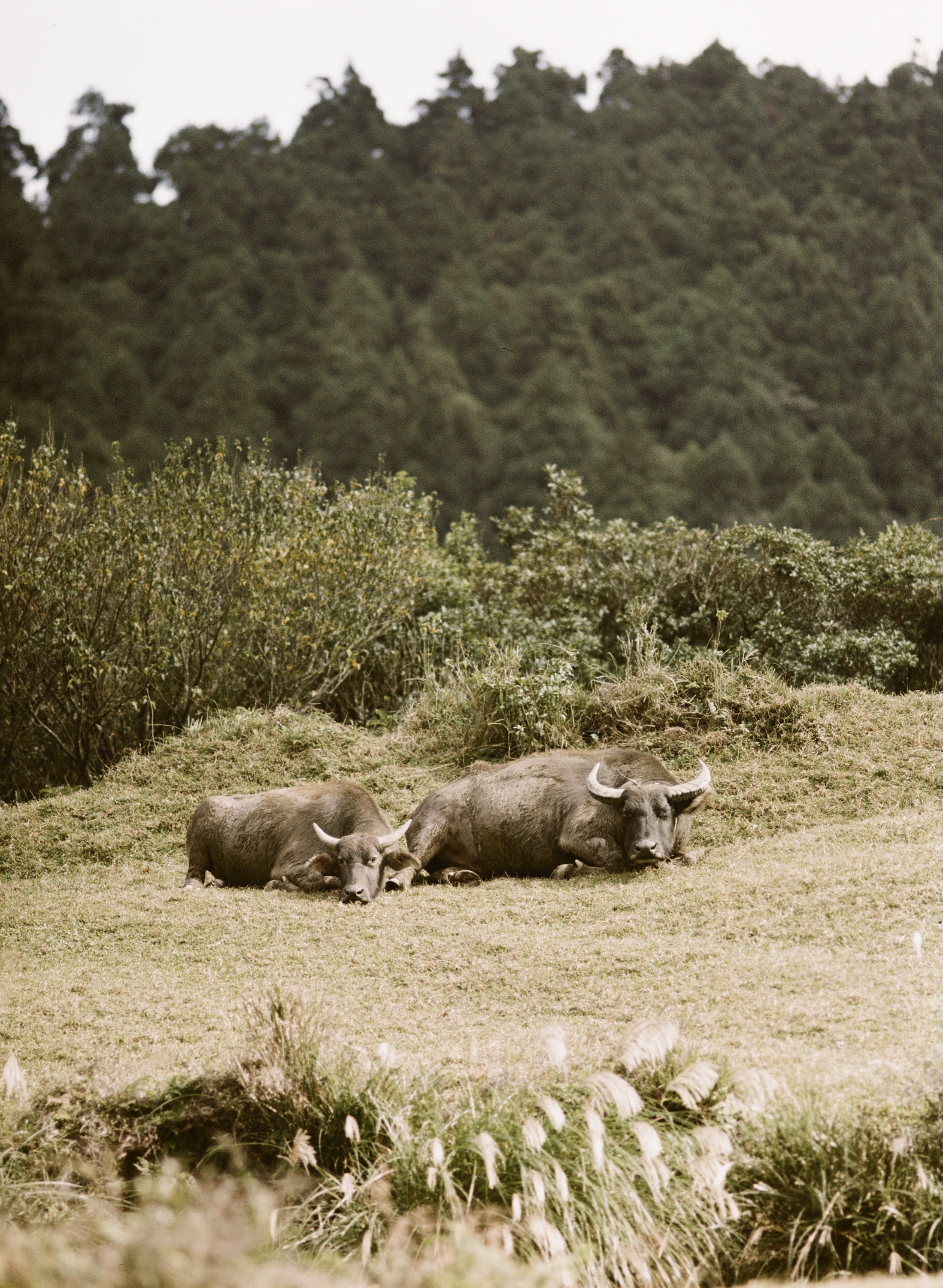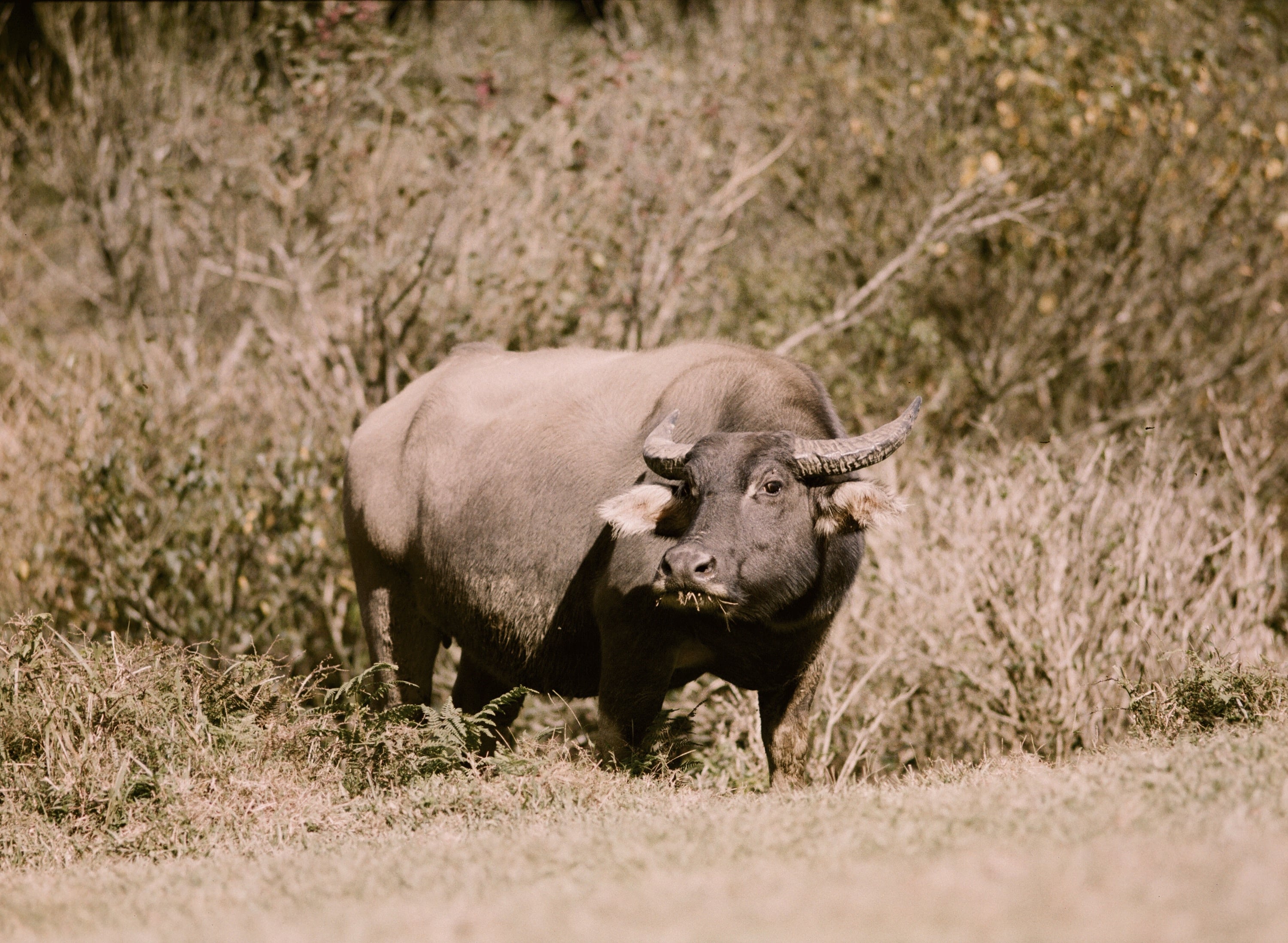 我覺得我都背 Pentax 67 300mm f4 上來了,如果沒拍到牛的話真的很可惜,因此就不放棄,繼續尋找。終於在不遠處的山谷中,看到有一個位置有幾隻牛,我們就走過去看看。在穿越樹林等重重障礙之後,就來到一個類似牛的家的地方,這裡大概有七、八隻牛,可能由兩、三個牛家庭所組成。我背著相機,躲在草堆中間,遠遠地拍攝,忽然自己很像土炮版的國家地理頻道攝影師。
