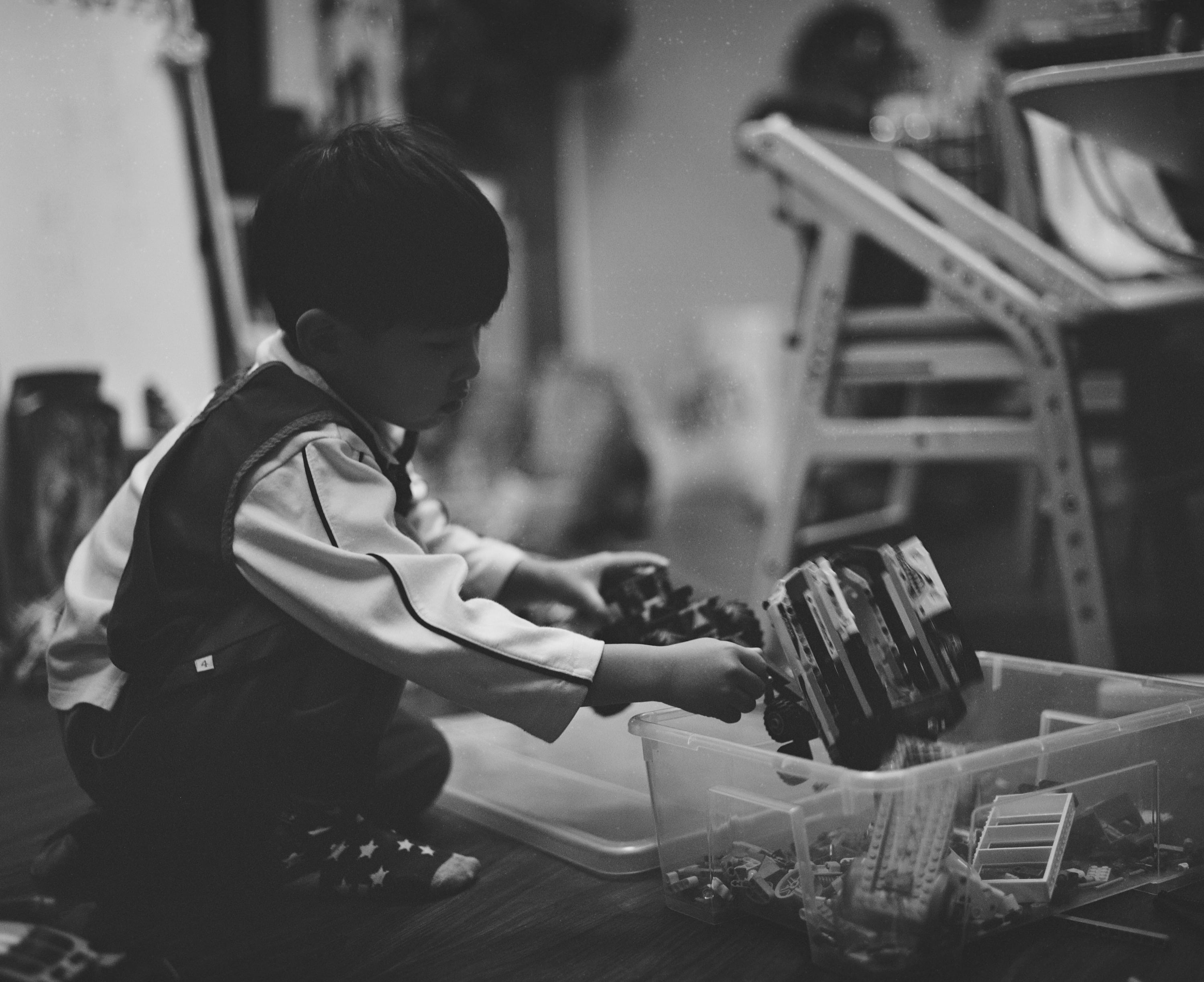 這張用感覺測光拍的,1/30 秒是我自己的安全快門極限,除了是確保自己手震看不太出來之外,是否能夠成功凝結被攝物的動態也需要考慮進去。1/30 秒,不能再慢了。這張是側拍和兒子正在玩樂高科技系列(Lego Technic)的時空切片。