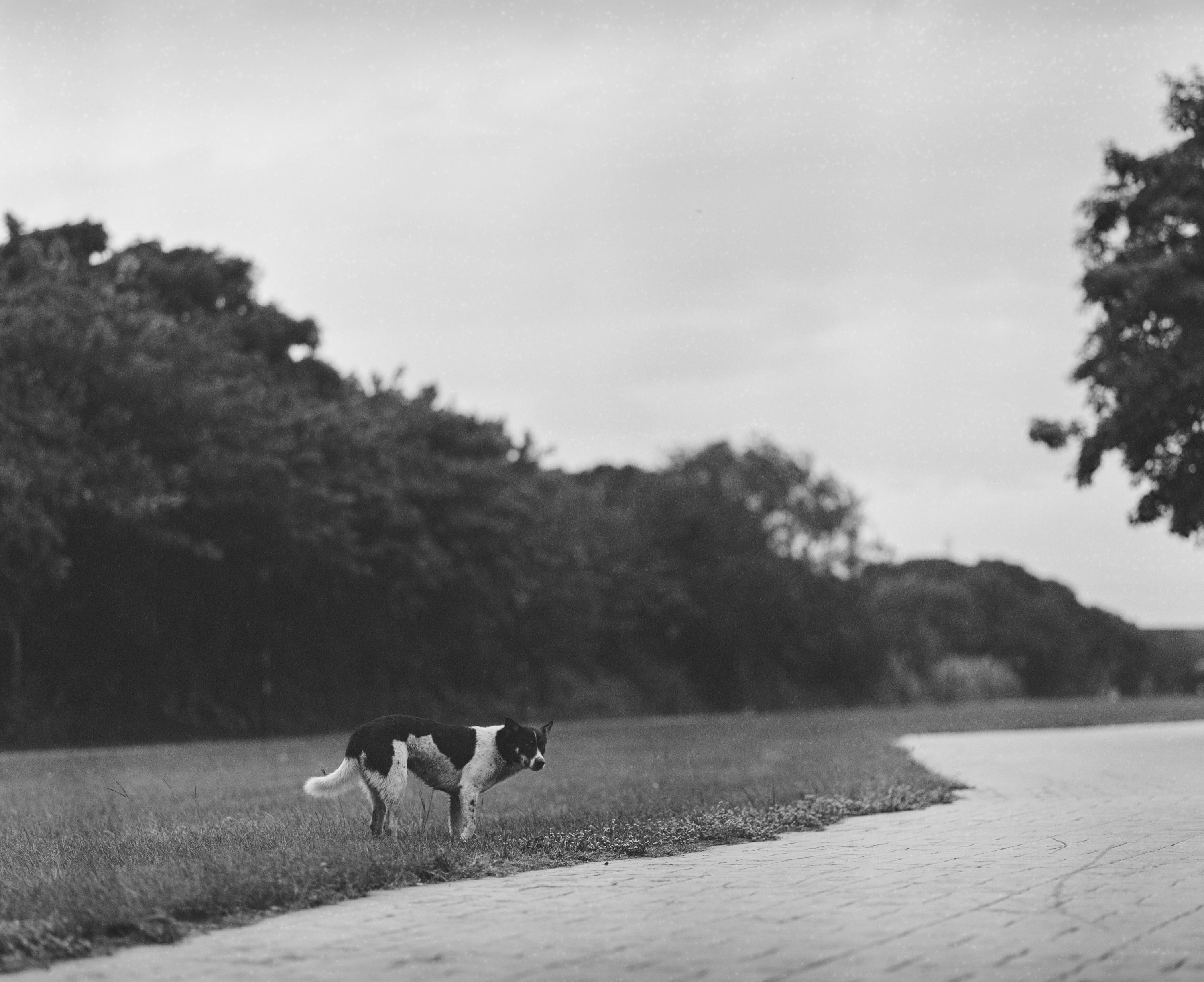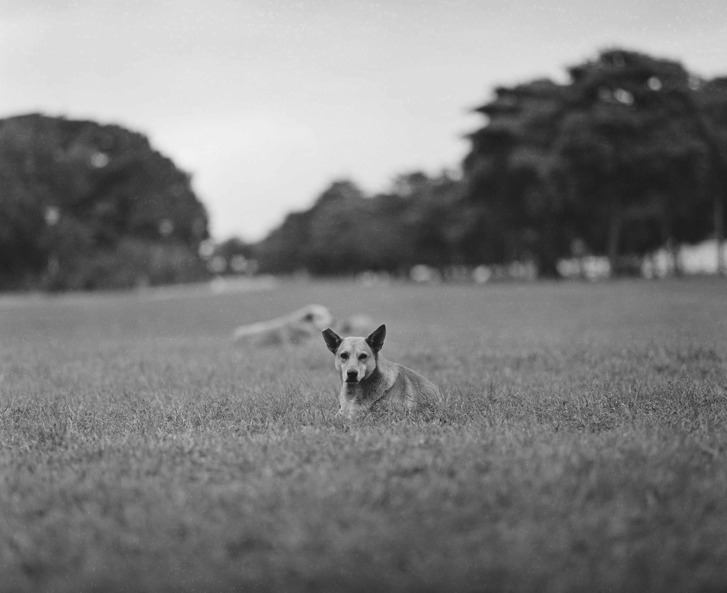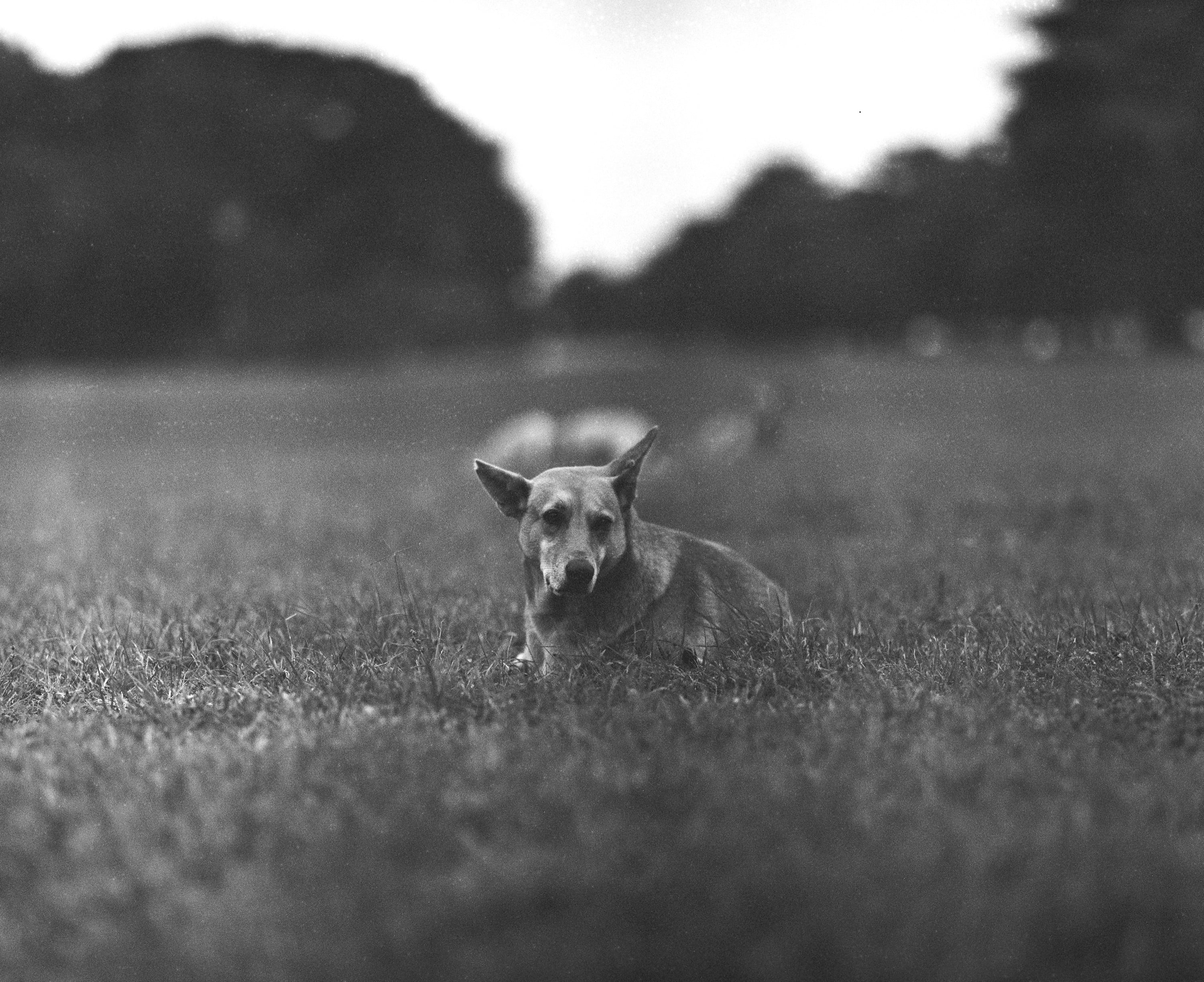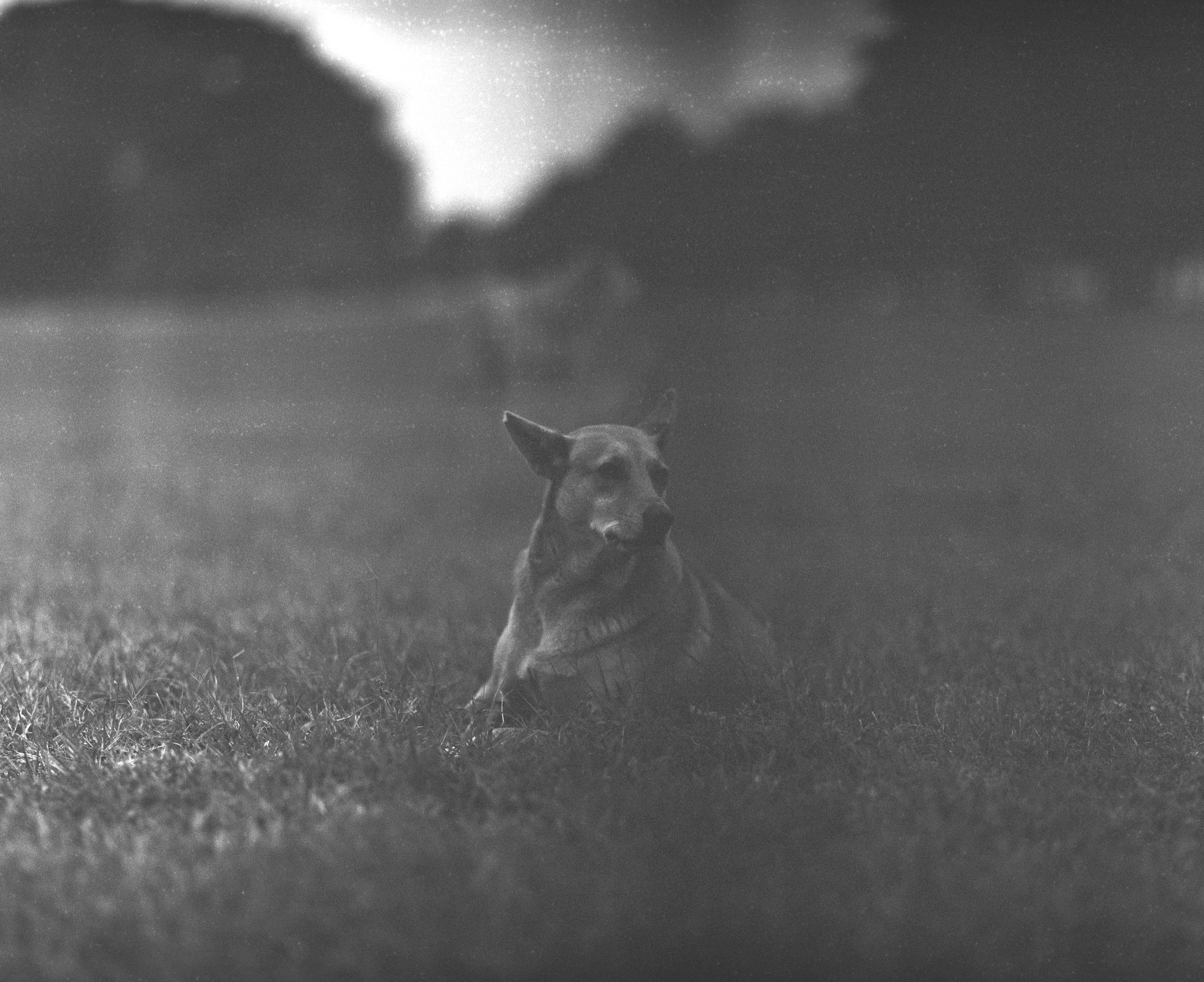 這顆 Pentax 67 165mm f2.8 鏡頭的最近對焦距離非常近,可以到 1.6 公尺,差不多就是一個人的距離而已。近到如果這隻狗想要咬我,我應該會來不及逃跑。