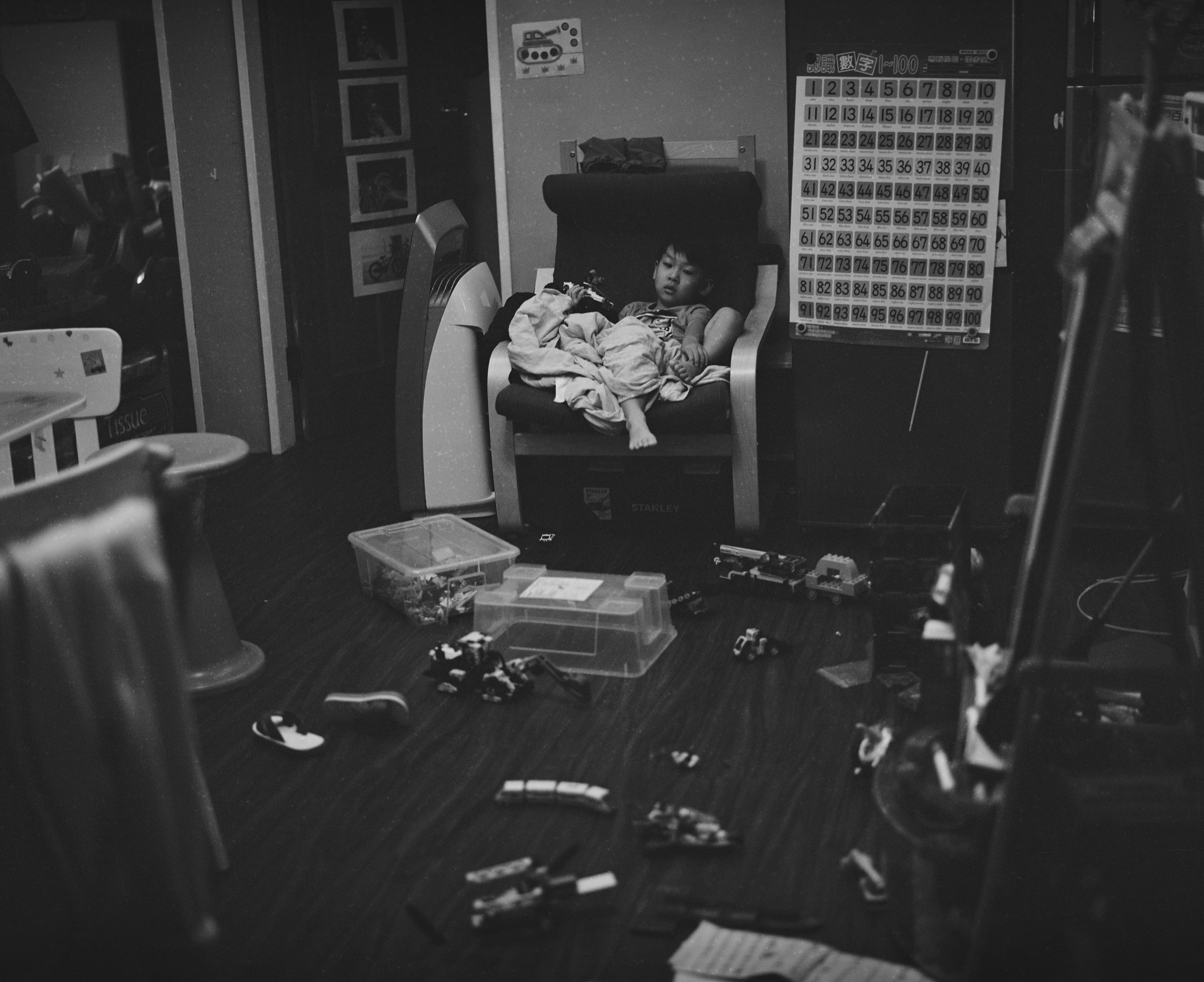 晨跑結束回到家看到的第一幕,兒子醒了,但他的母親還在睡,沒人陪他玩,於是他就一個人坐在客廳發呆。