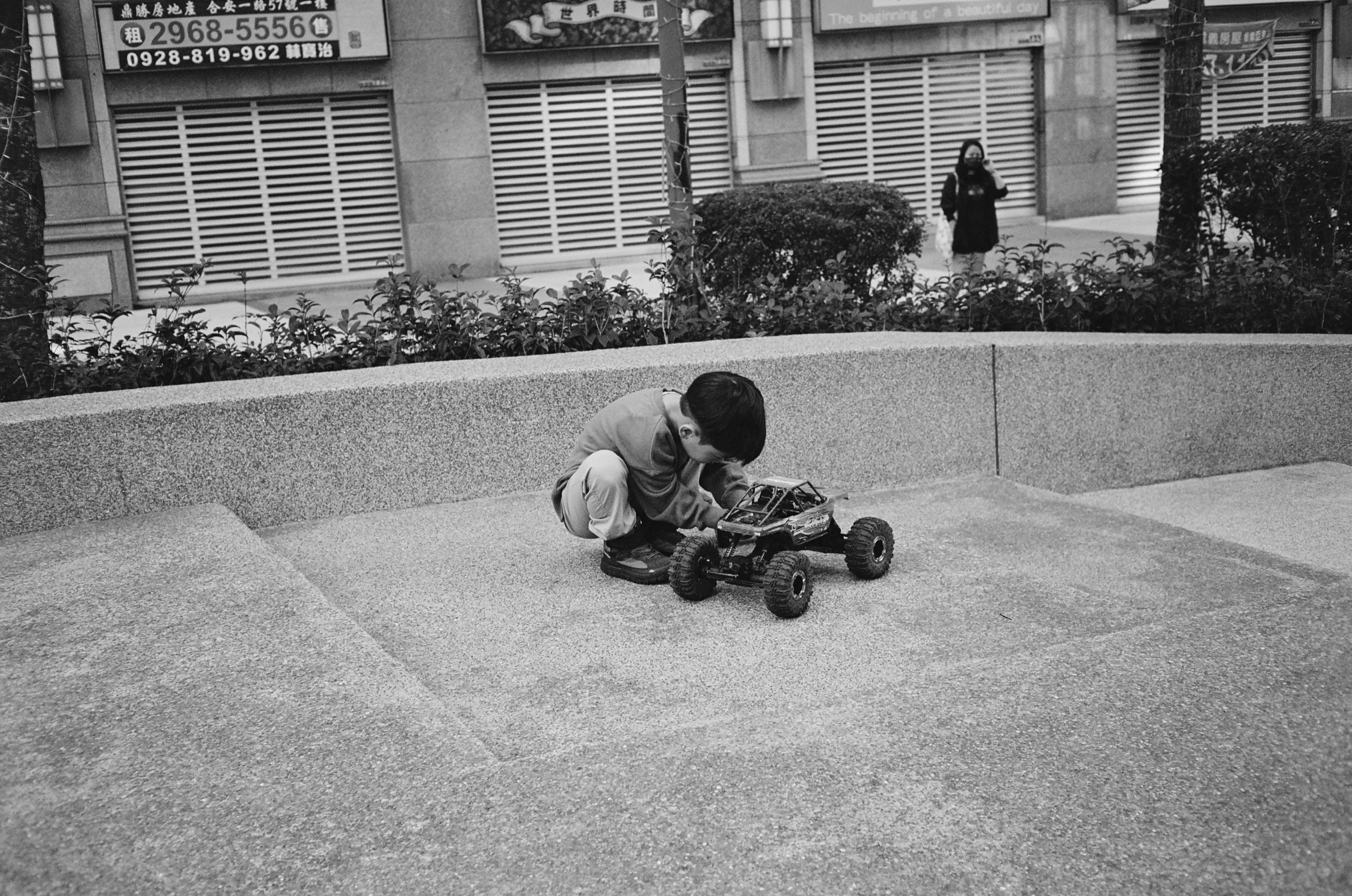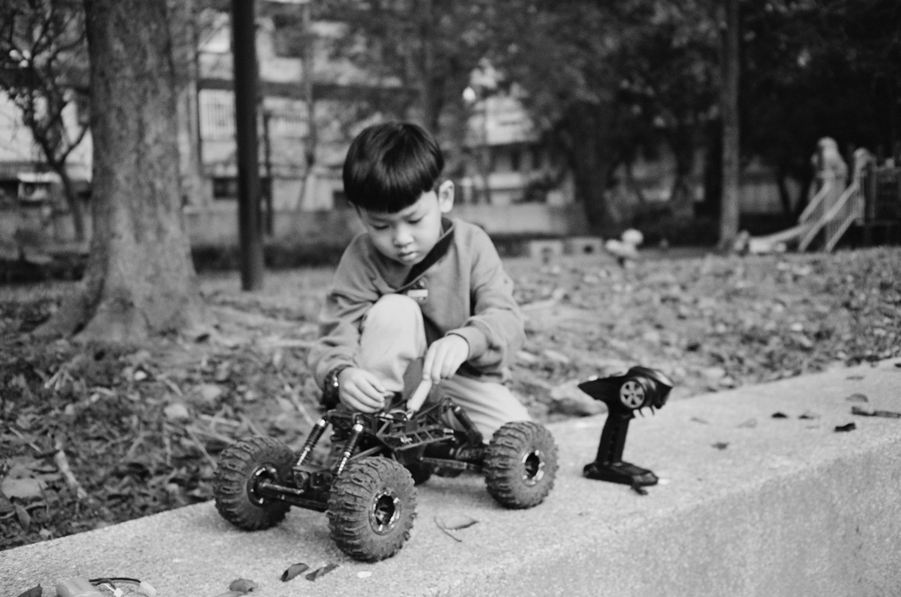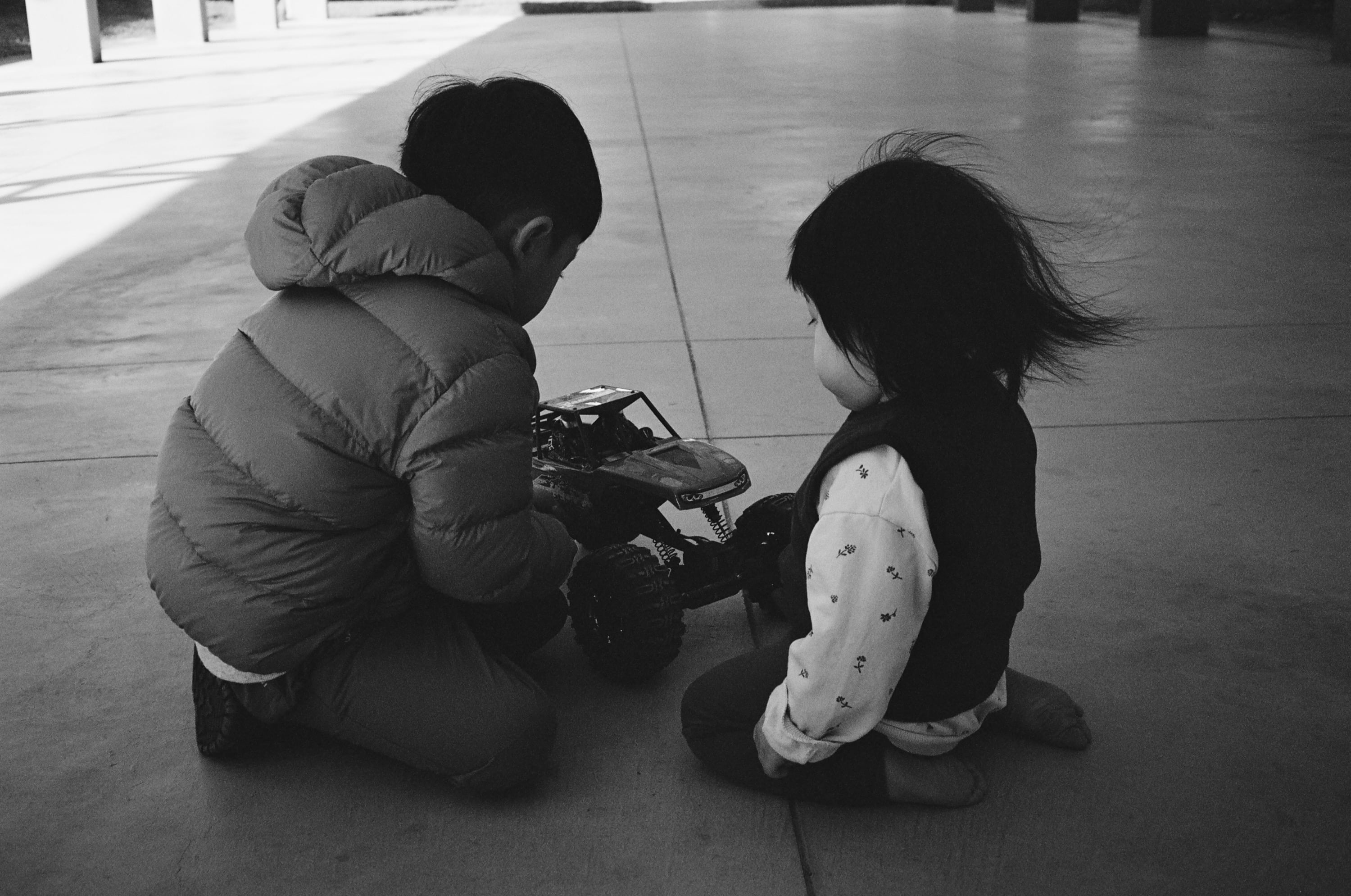 在公園巧遇好友的女兒,當時她給她阿嬤帶著。兒子看起來很像在跟她介紹搖控車。