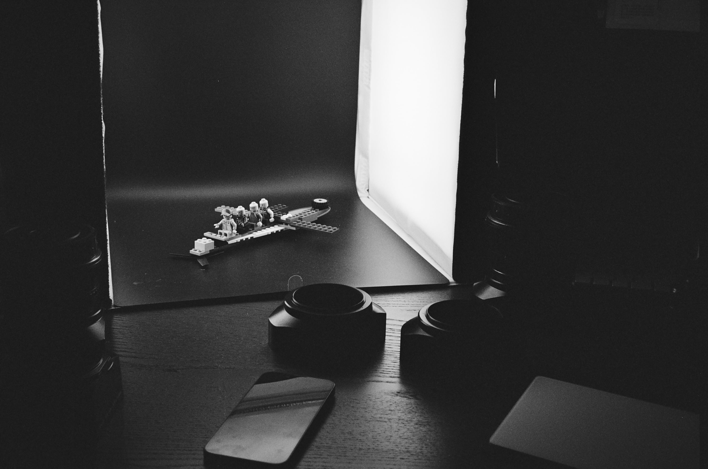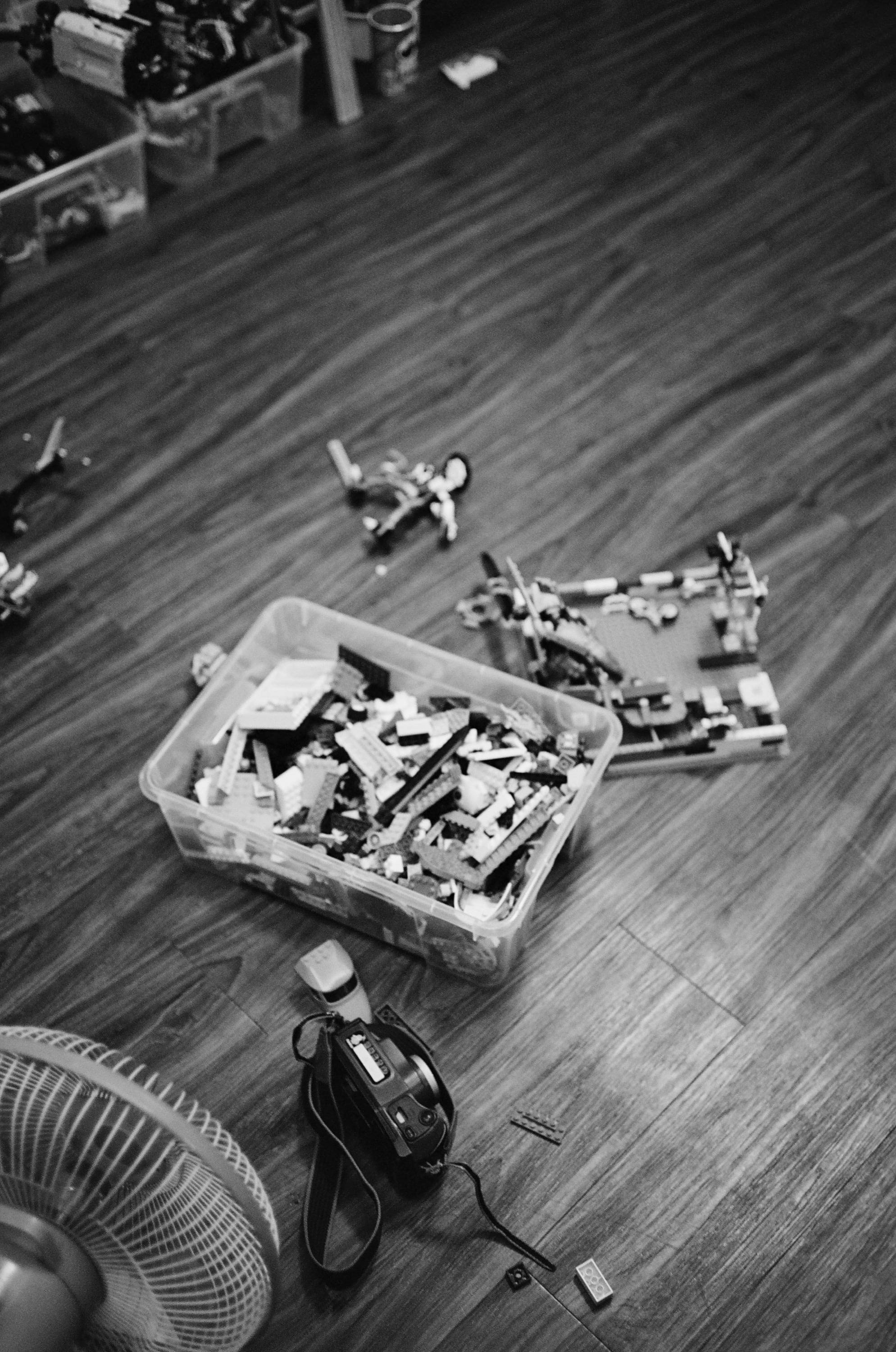 散落在客廳地上的玩具與相機。40mm f1.9 的景深真的很淺,因為我的對焦是對在畫面下方的相機上。