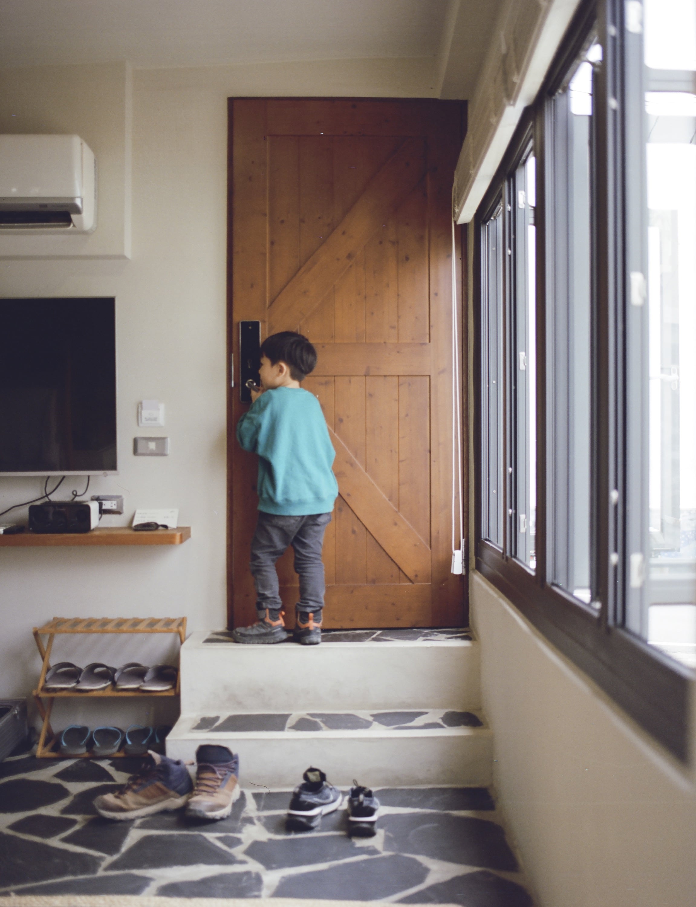 離開墾丁覓覓山丘之後,大夥其他人各自回程,我們家獨自在墾丁多留了一天,為的是要前往有寄居蟹的沙灘尋找寄居蟹們。這是我們訂的位於萬里桐海邊的「聽著海聲 迷路旅居」民宿,超愛,愛到會想念的那種。圖為兒子準備出門去海邊探險了。