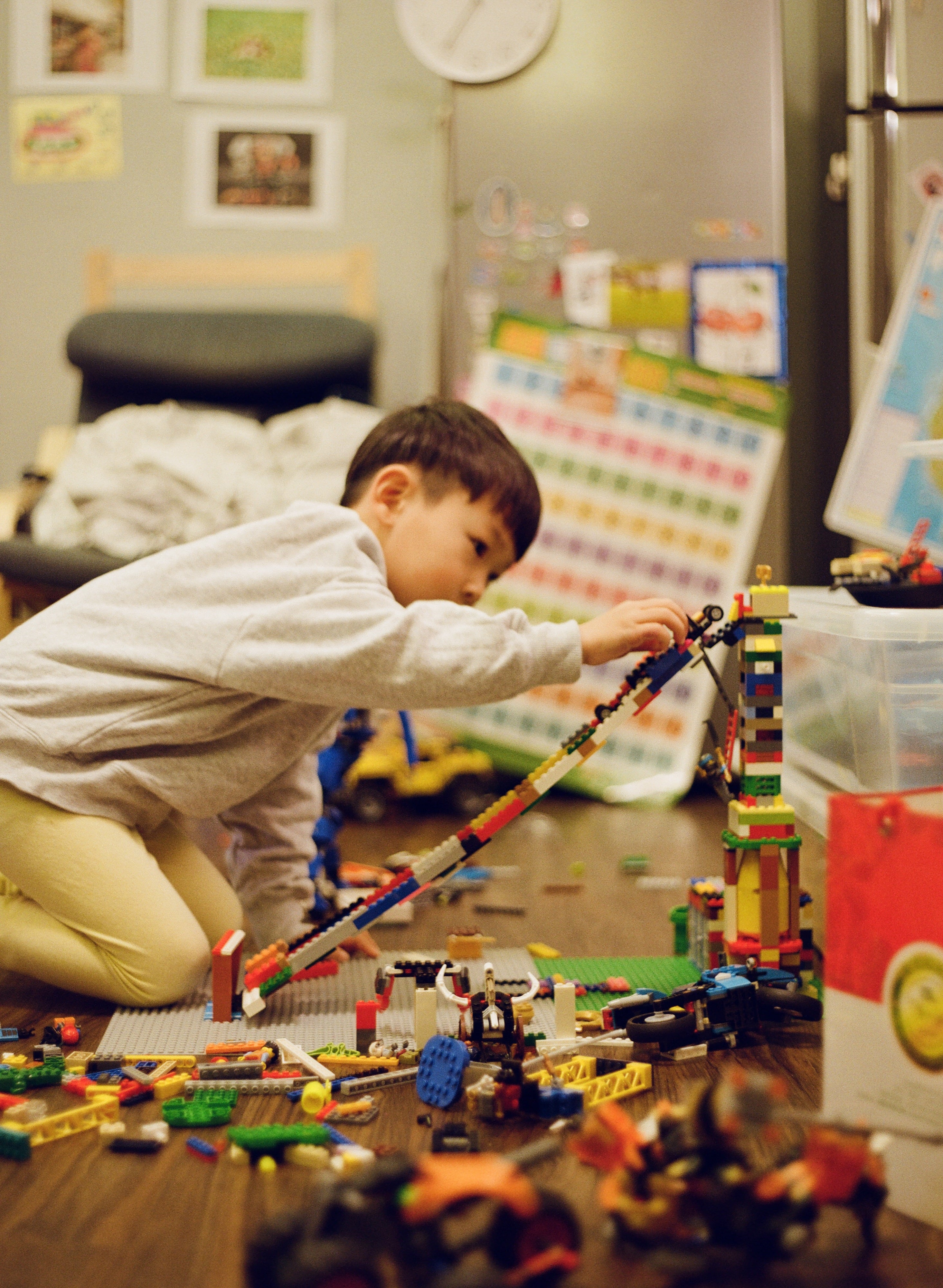 過年放假最後一天的兒子,正在玩樂高。這是我們最近組的溜滑梯車道,支援四輪車種,用了很多平滑磚。