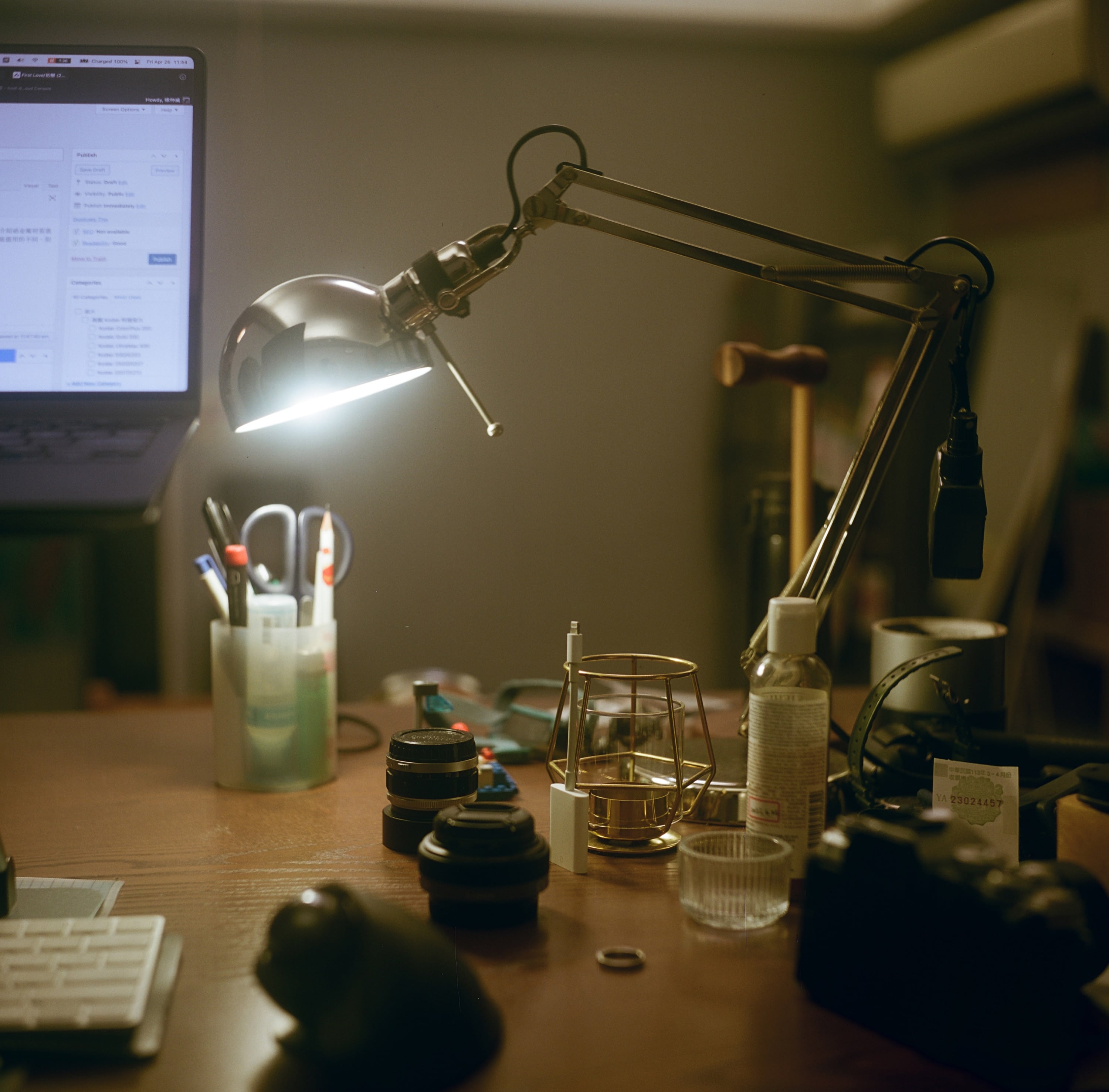 習慣在桌面點一盞光的我,從點煤油燈、瓦斯燈、蠟燭,一路朝現代化邁進,現在改點燈泡了。這張照片主要是測試鏡頭霧化對光線的反應,前陣子剛好 Ricoh 發表的 GR IIIx HDF 內建柔焦鏡的功能,起初我一開始看到非常心動,但是看了許多實拍之後,又覺得有點太誇張了,我自己還是比較喜歡這種天生的柔焦,就是,看著光,你會真的在照片面前感受到刺眼而看不太清楚的感覺。