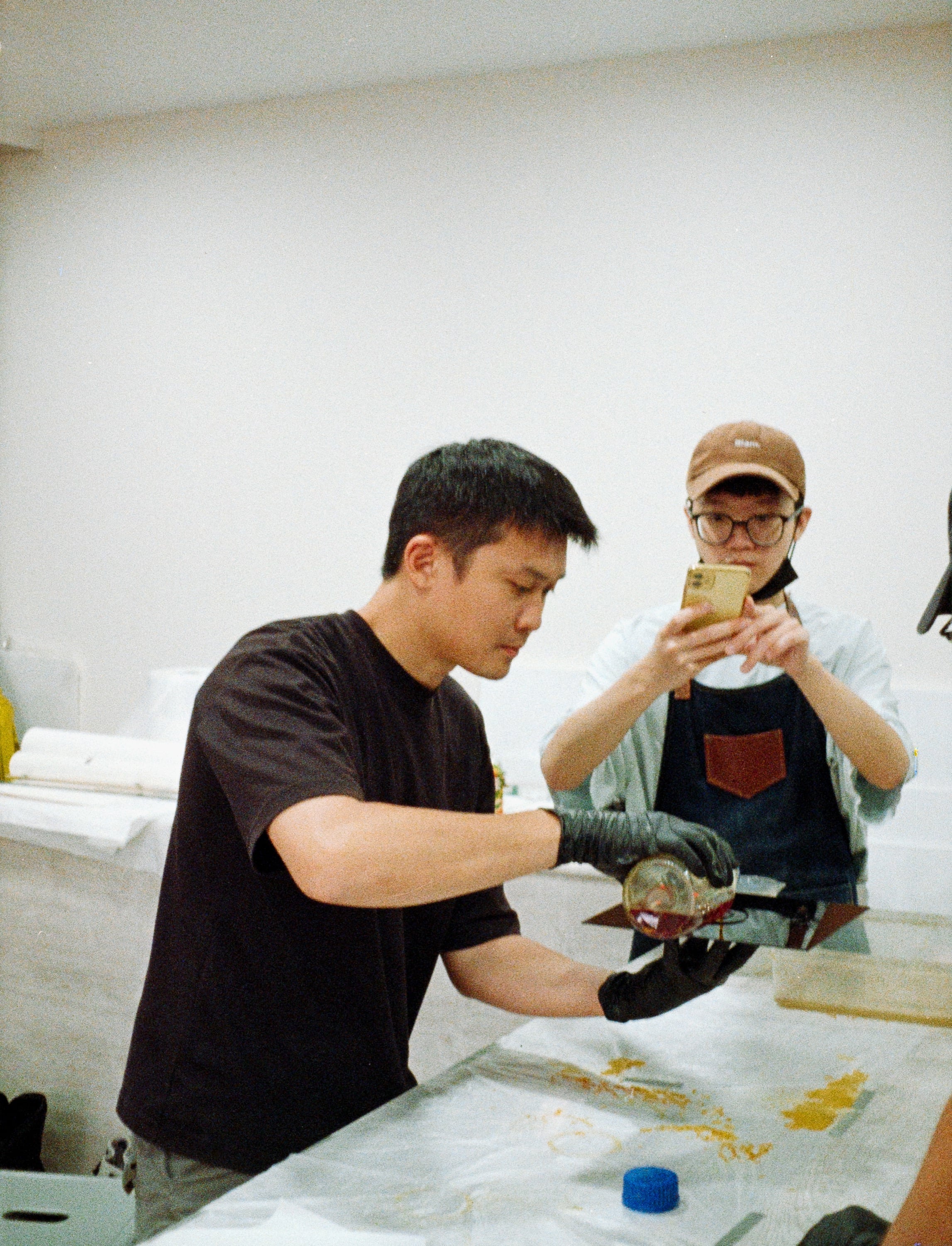 正在倒火棉膠,覺得困難重重的我。本張照片由泰宏進行拍攝。