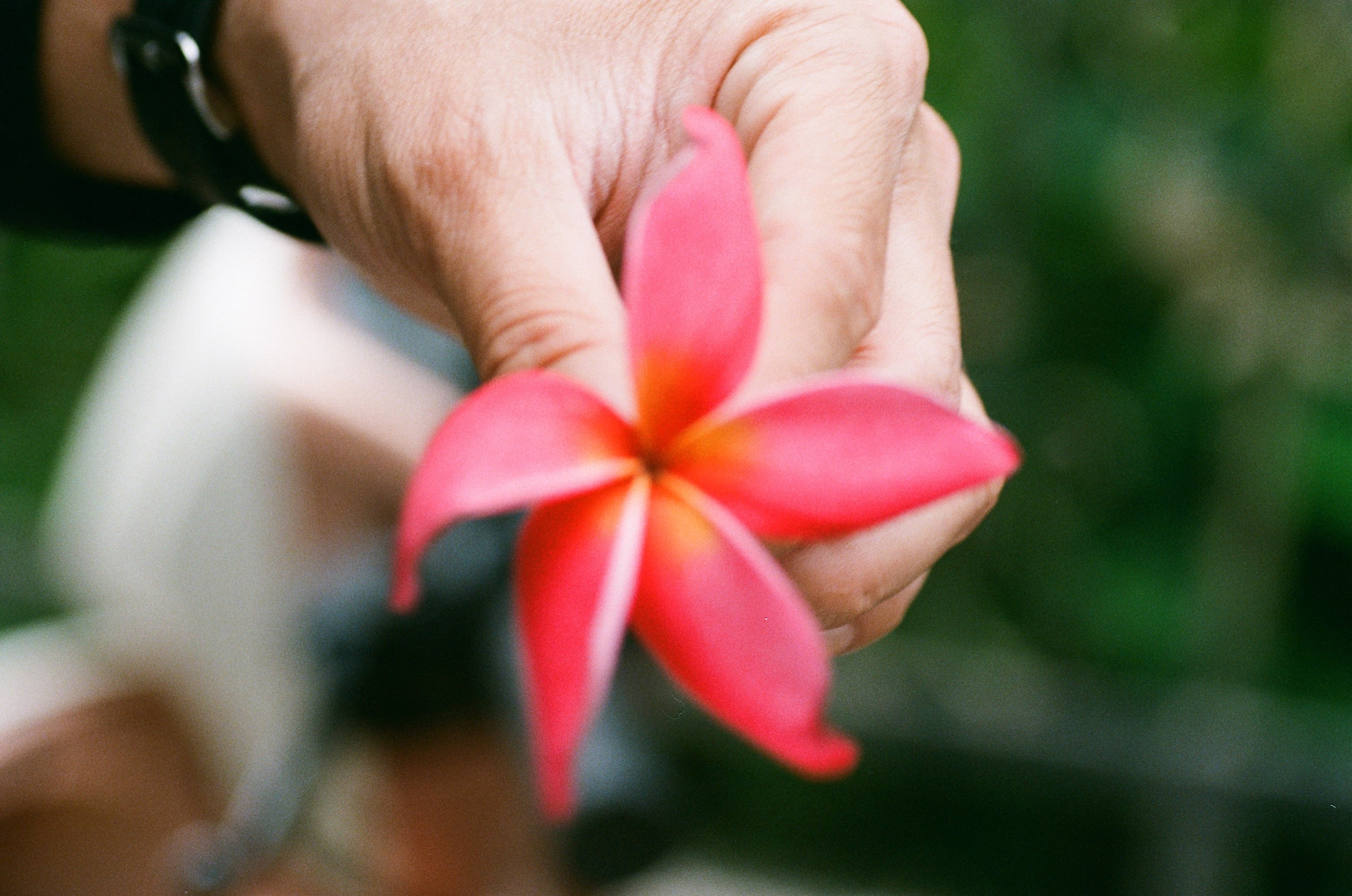 兒子說這叫做雞蛋花。這張照片是我請兒子拍的,我拿花,他對焦並按下快門。