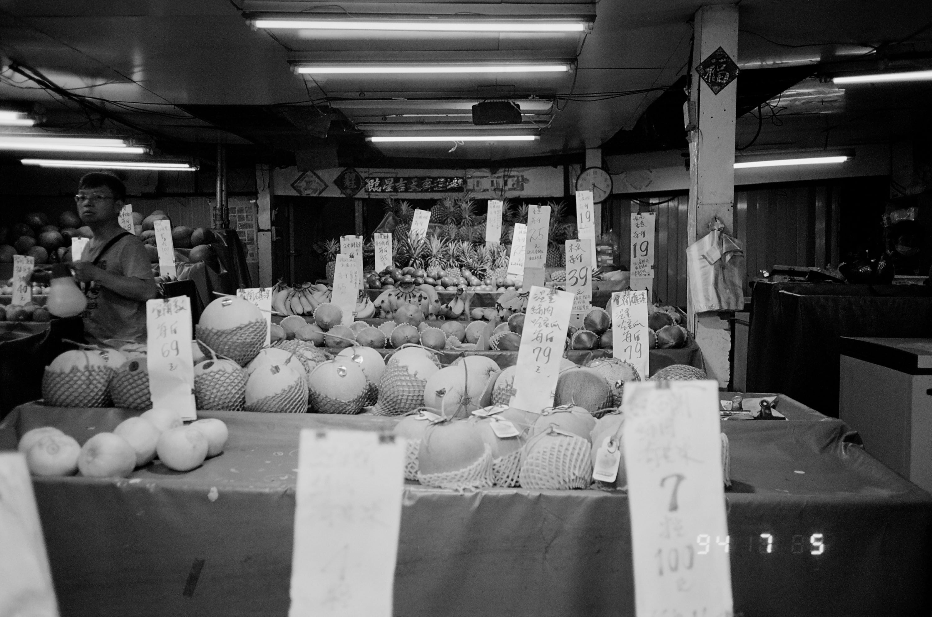 身高 168 公分的父親,正在拍攝水果攤老闆的工作檯面。
