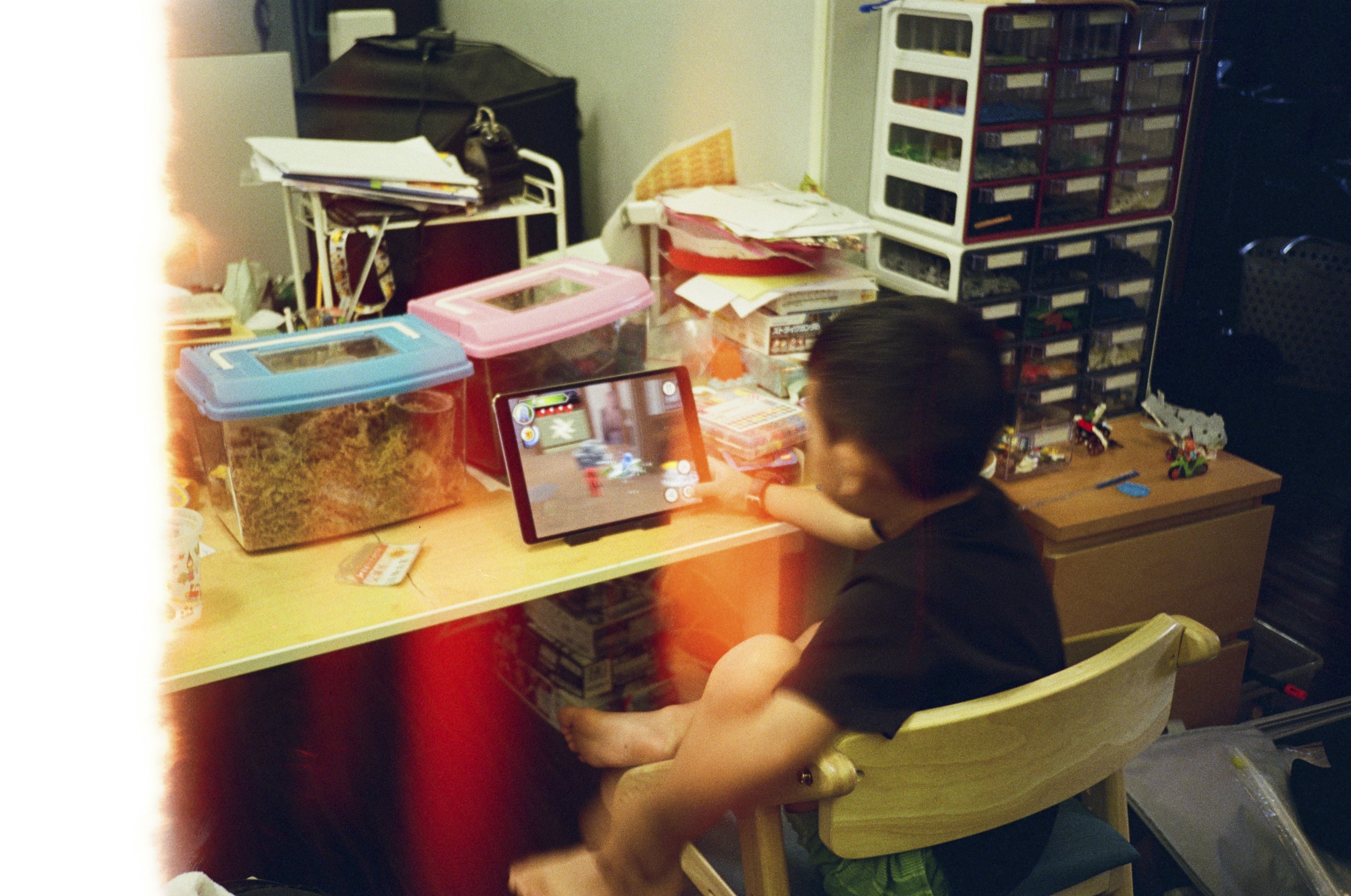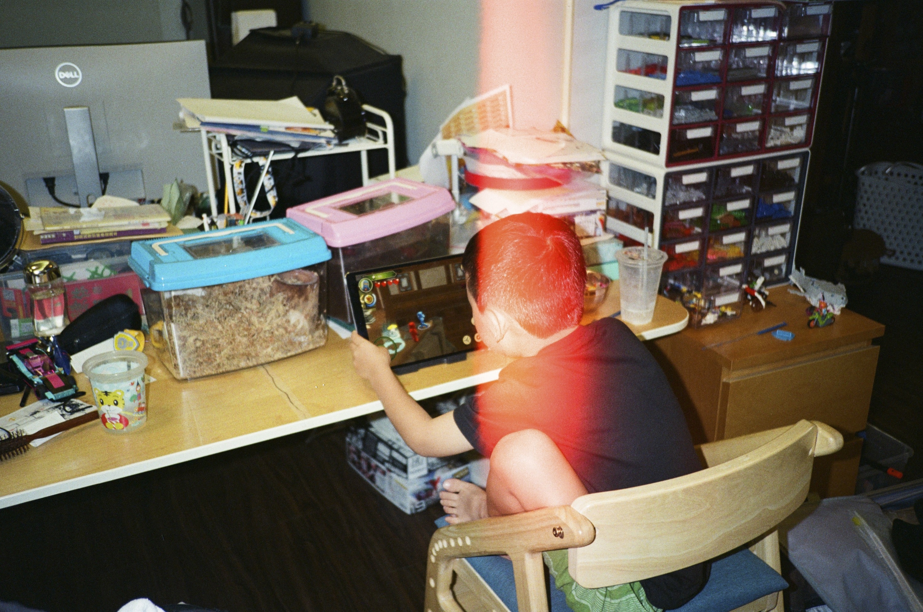 順便測試一下 A11 閃光燈,還真的會閃。順道一提,兒子桌子上的兩個昆蟲箱,裡頭是兩隻獨角仙,一公一母,母的已住進產房,生產中。