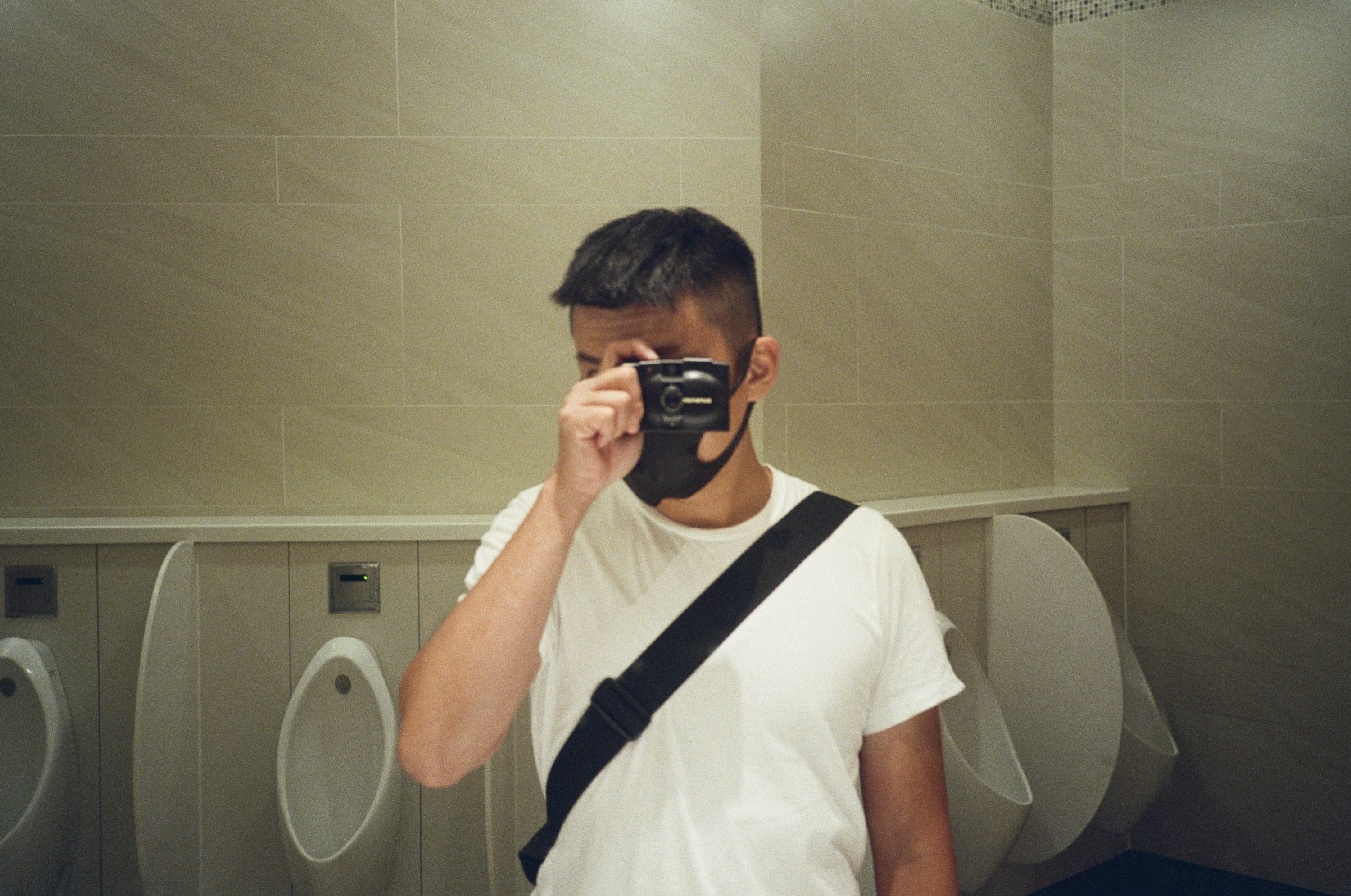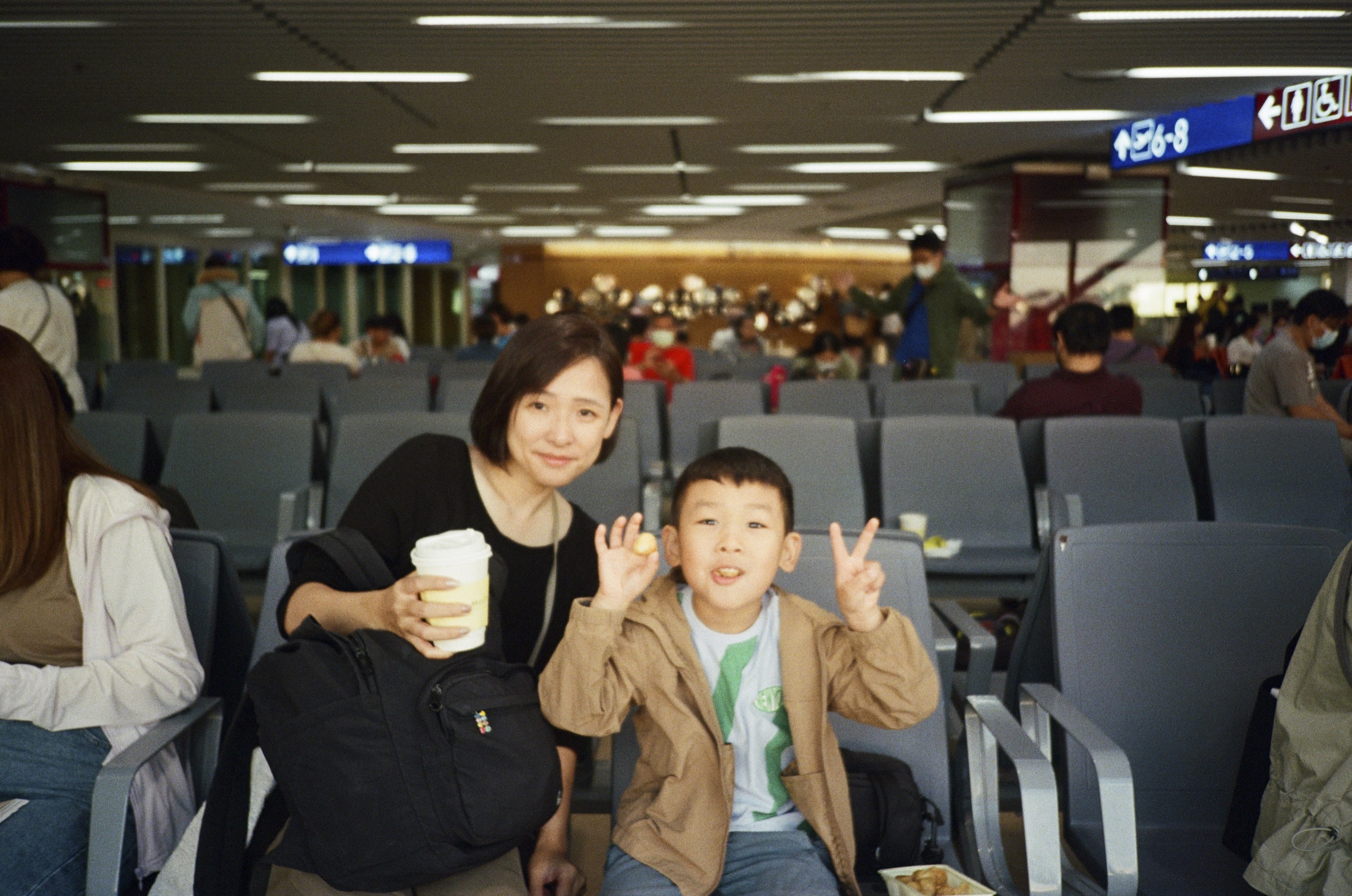 時間快轉到隔天的星期日早餐,我們已經抵達桃園機場,準備搭機前往熊本了,這是機場裡的廁所。我將估焦區間設定為「雙人半身」,可以看到,實際對焦的距離是在我身後一些,因為 Olympus XA2 的最近對焦範圍是「雙人半身」,而不是「單人半身」。