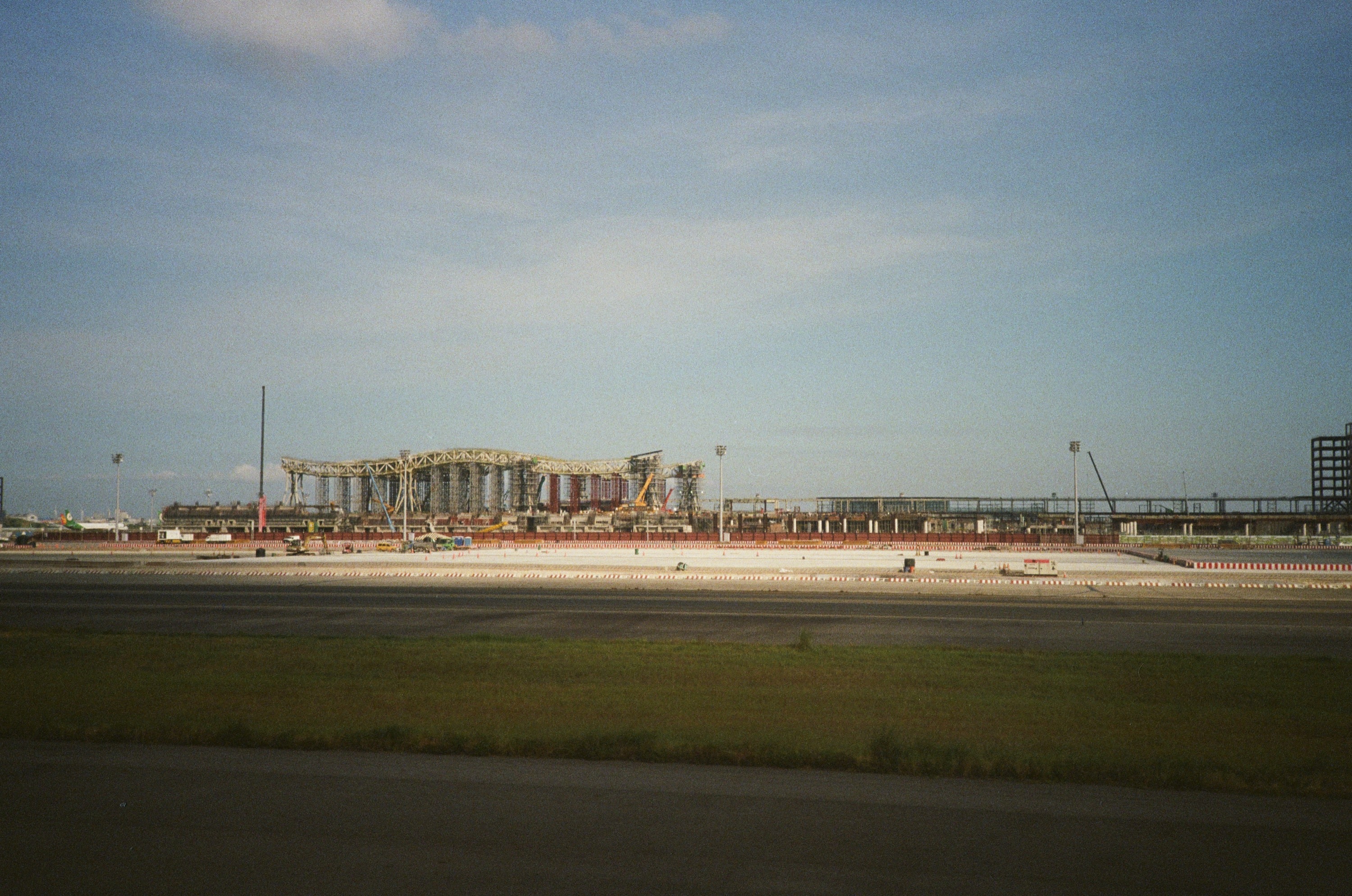 飛機跑道上,可以看到遠方正在興建的桃園機場第三航廈,查了一下是預計 2027 年完工。