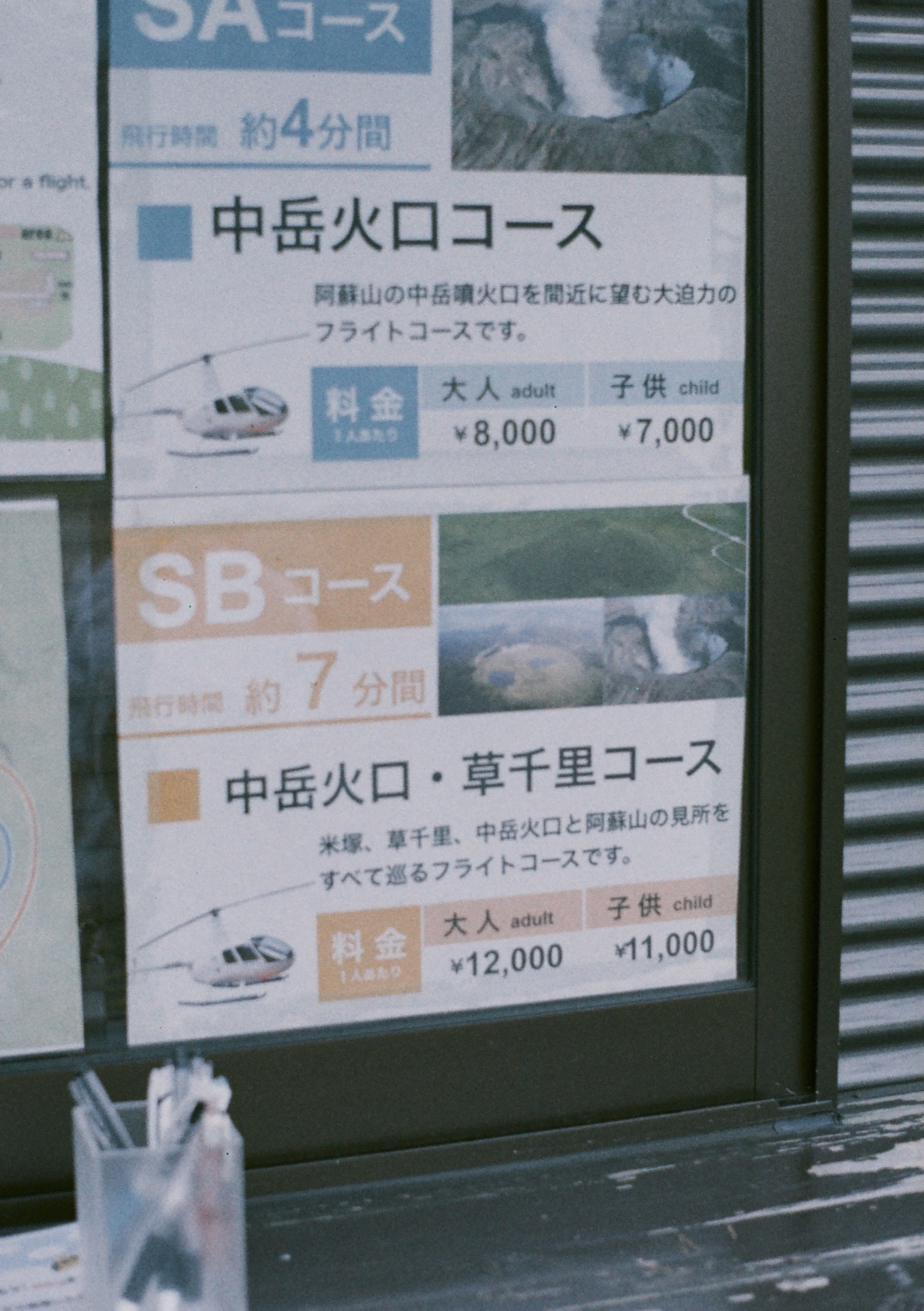 在阿蘇火山搭直升機的價目表,根據路線的不同,價格也有所差異。