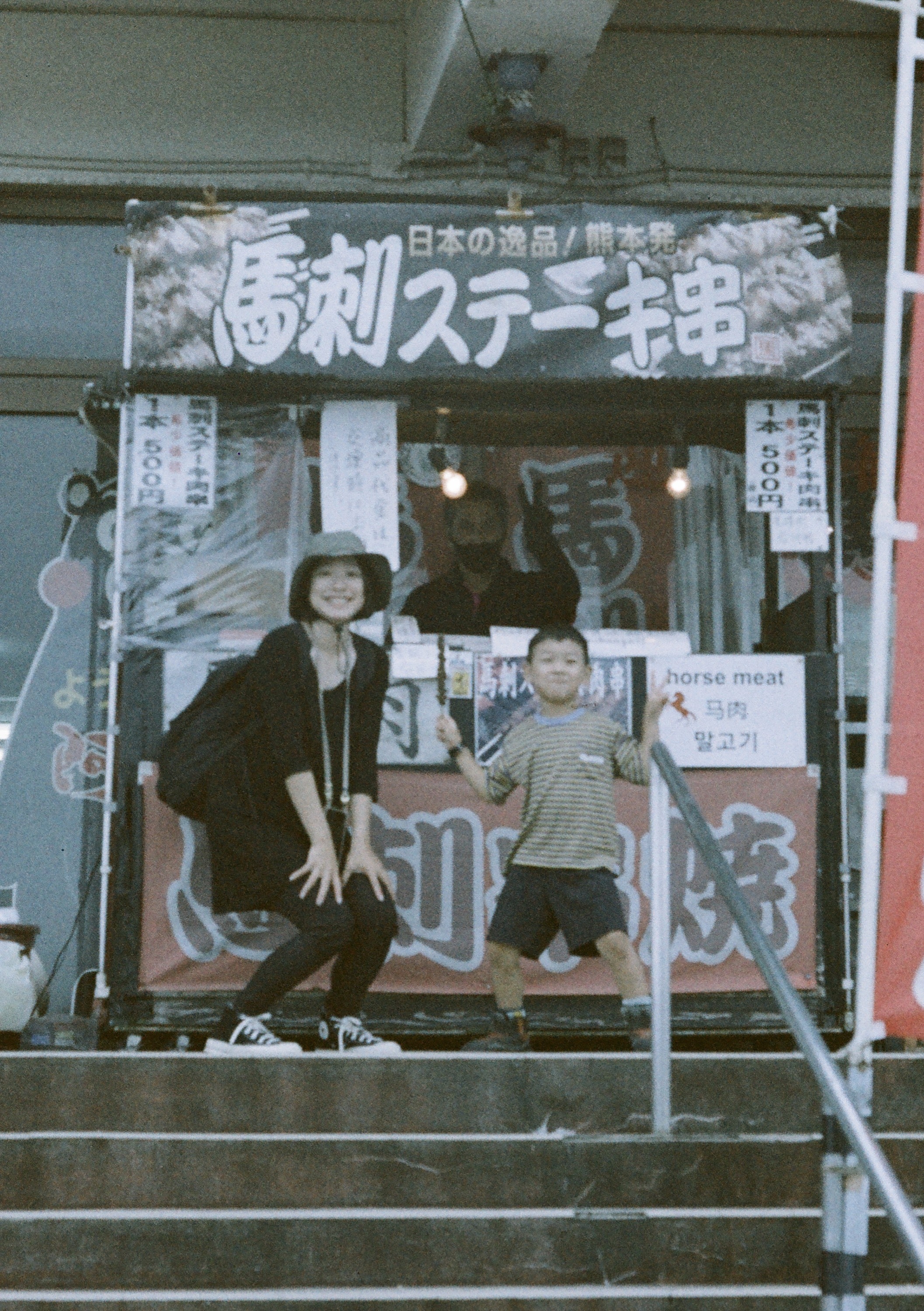 真的是馬肉,一開始看到,我們有點害怕味道,結果吃起來很特別,算是好吃的。幫太太和兒子拍照前,我先問過了小販老闆,老闆說 OK,還很大方地一起合照。