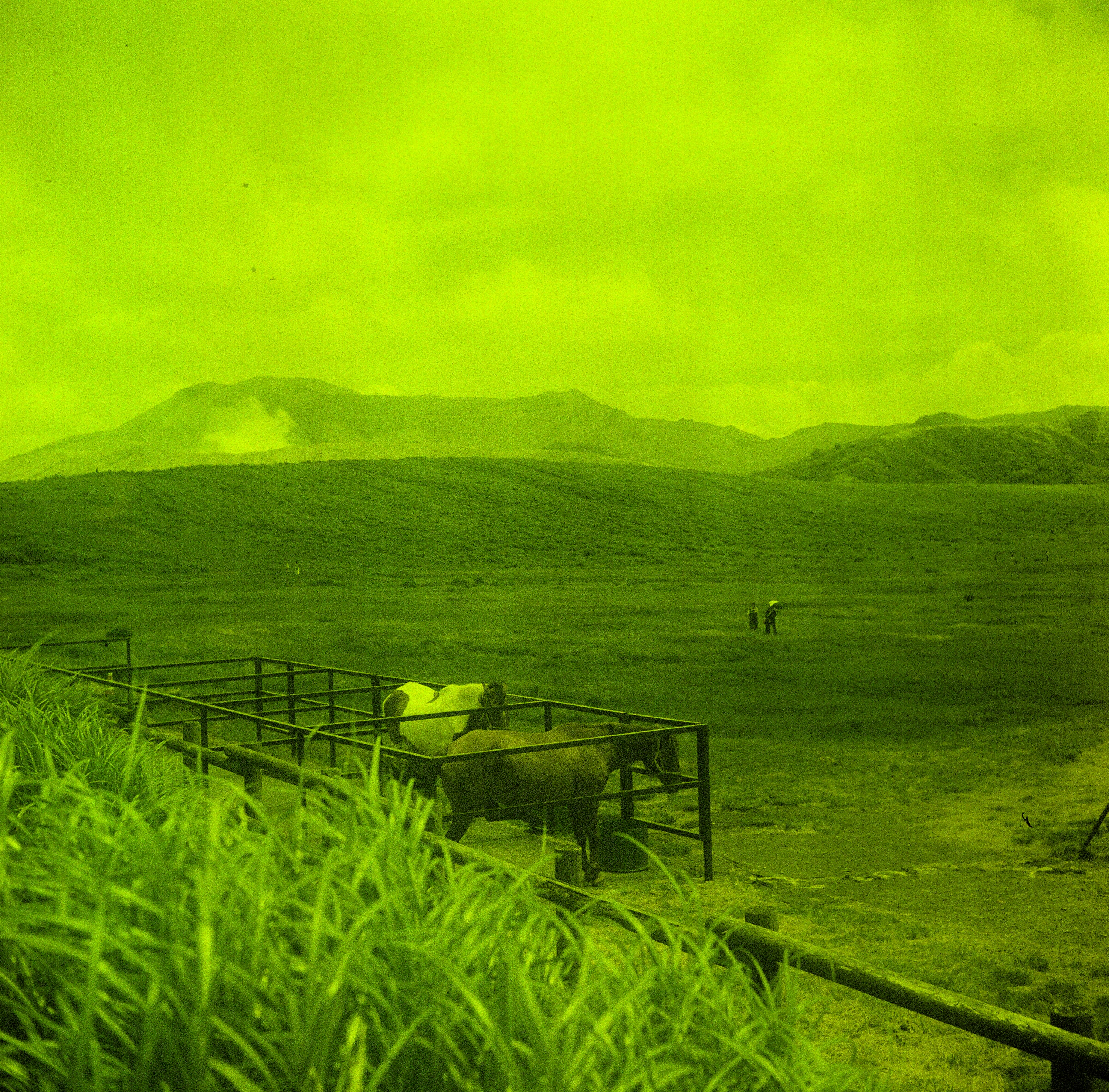 接續著上一卷底片,我們在阿蘇草千里騎馬時,我將 Olympus Pen-F 的底片拍完了,接著就請 Olympus Flex B II 出場,這時我們剛騎完馬,很興奮地在這裡拍照。