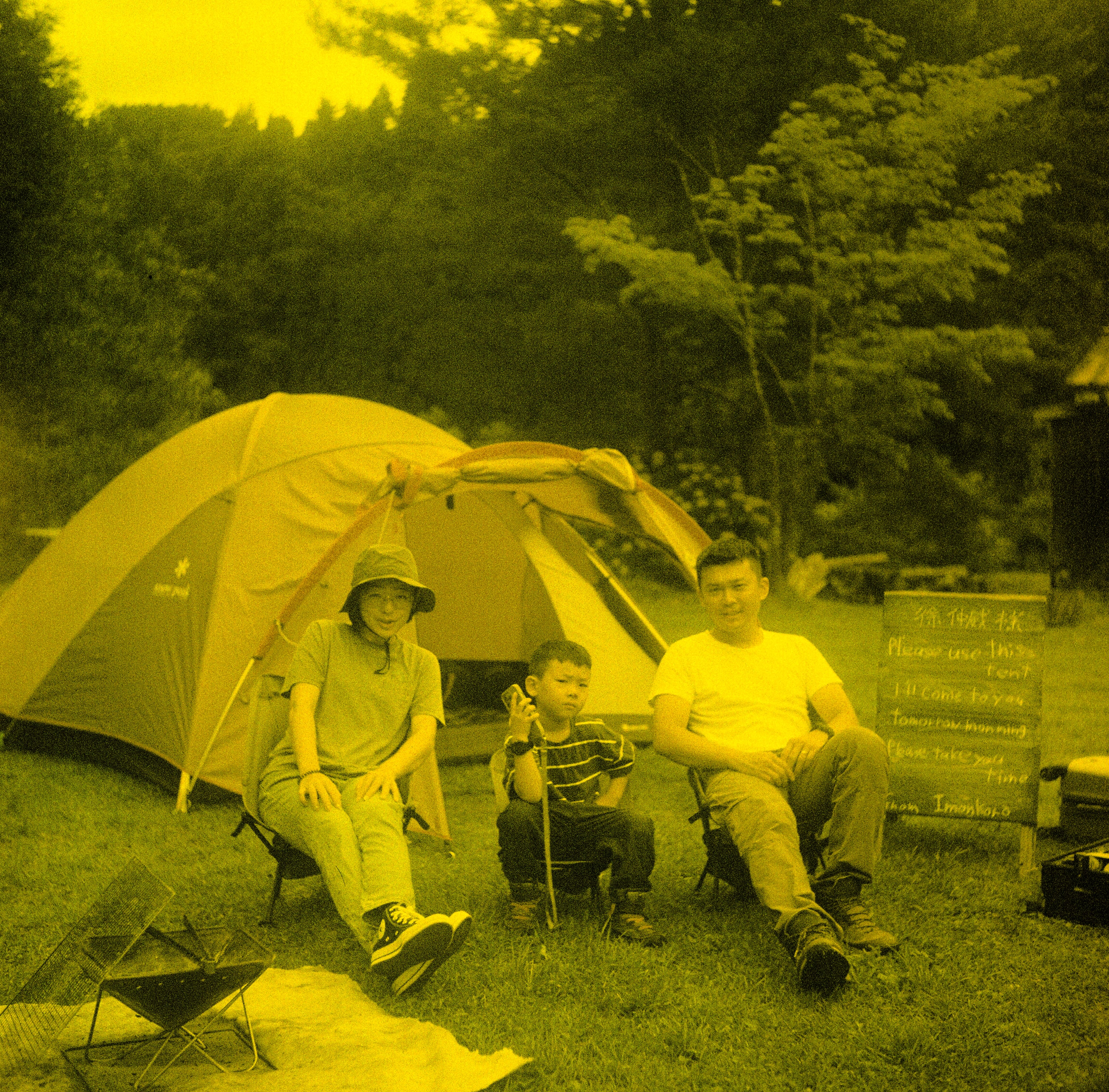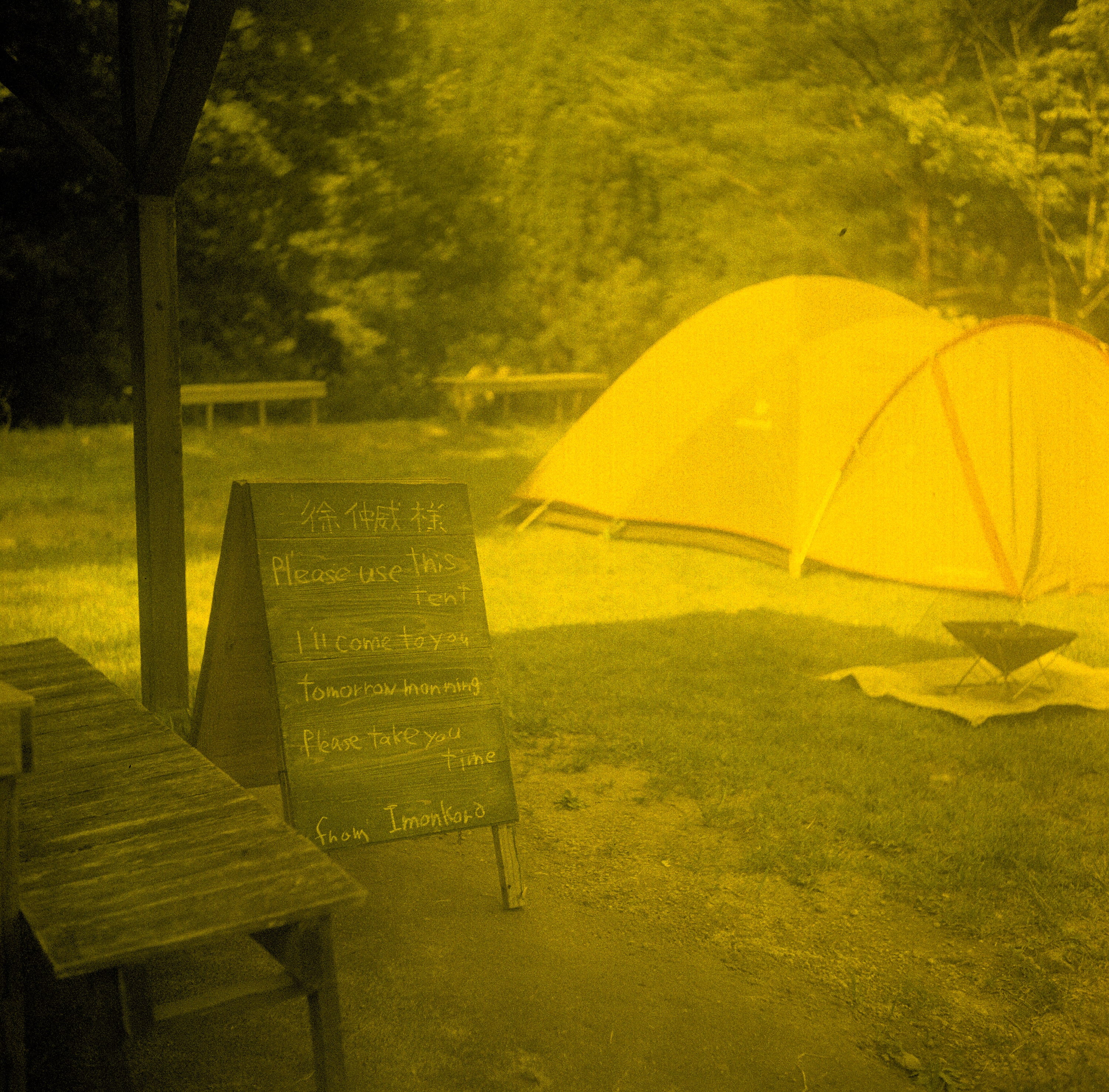 抵達露營區,整個營區沒有半個人,包括營主也不在,不過營主寫了一塊板子,上頭寫著我的大名「徐仲威」,歡迎我們過來。日本人真的是很貼心,而且營主連我們需要的所有設備都準備好了,包含帳篷、焚火台那些,非常特別的體驗。