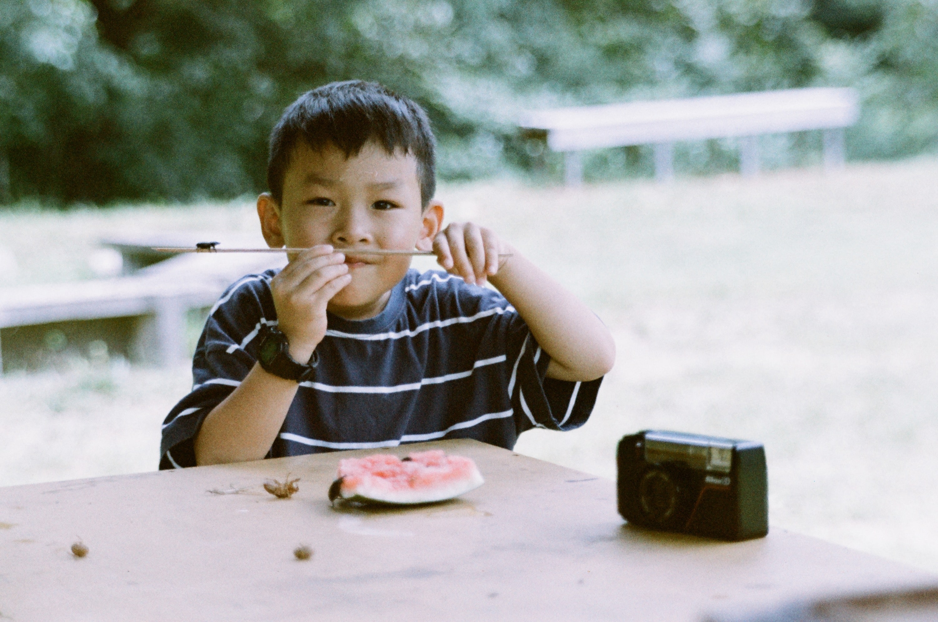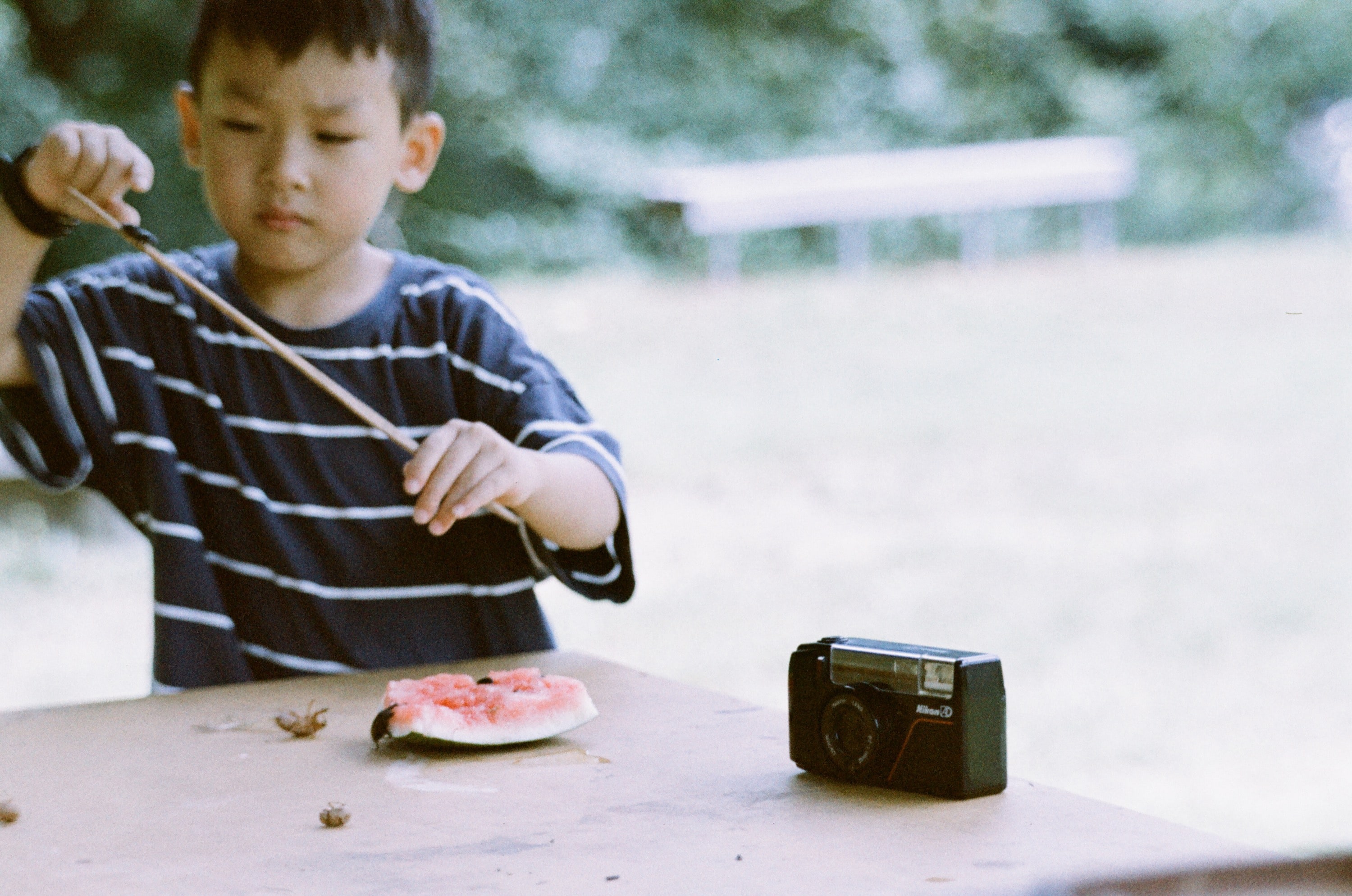 正在用西瓜餵食營區鍬形蟲的兒子。
