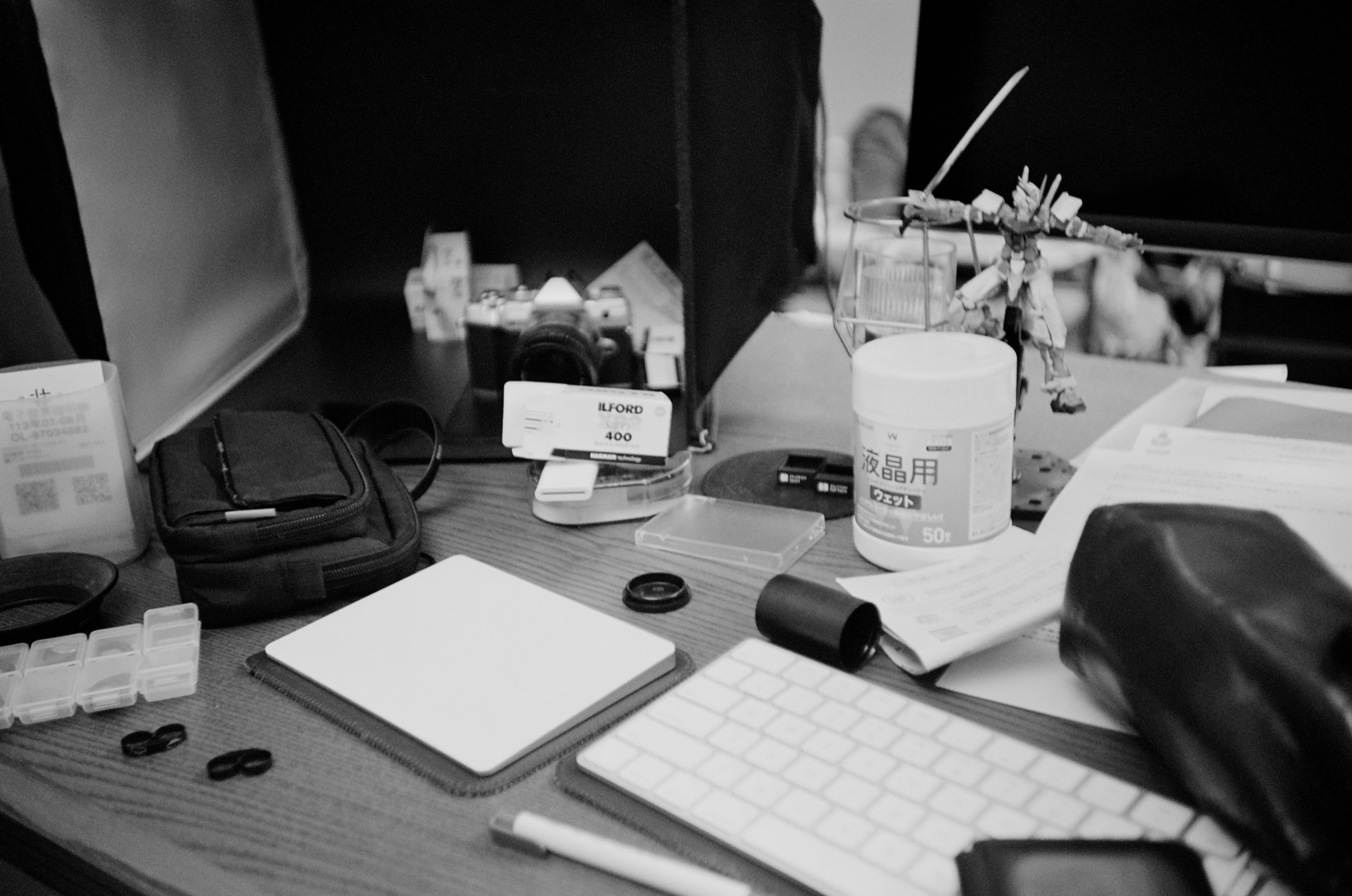 我桌子每個禮拜的樣子都不太一樣,我剛在這台相機上裝了一卷 XP2,因此拍了一張它的盒子。