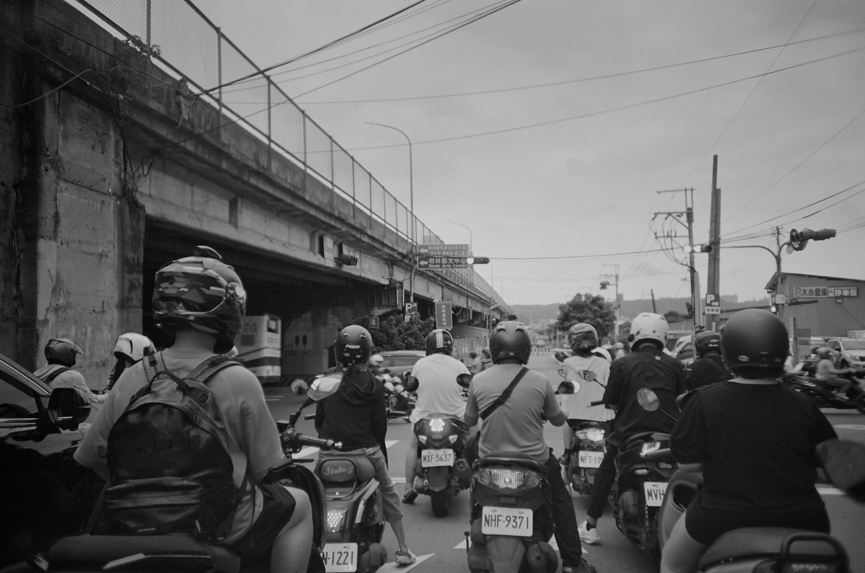 雖然是黑白照片,但是從畫面中的任何蛛絲馬跡,車多,有開車燈,猜測畫面的拍攝時間是傍晚時分。