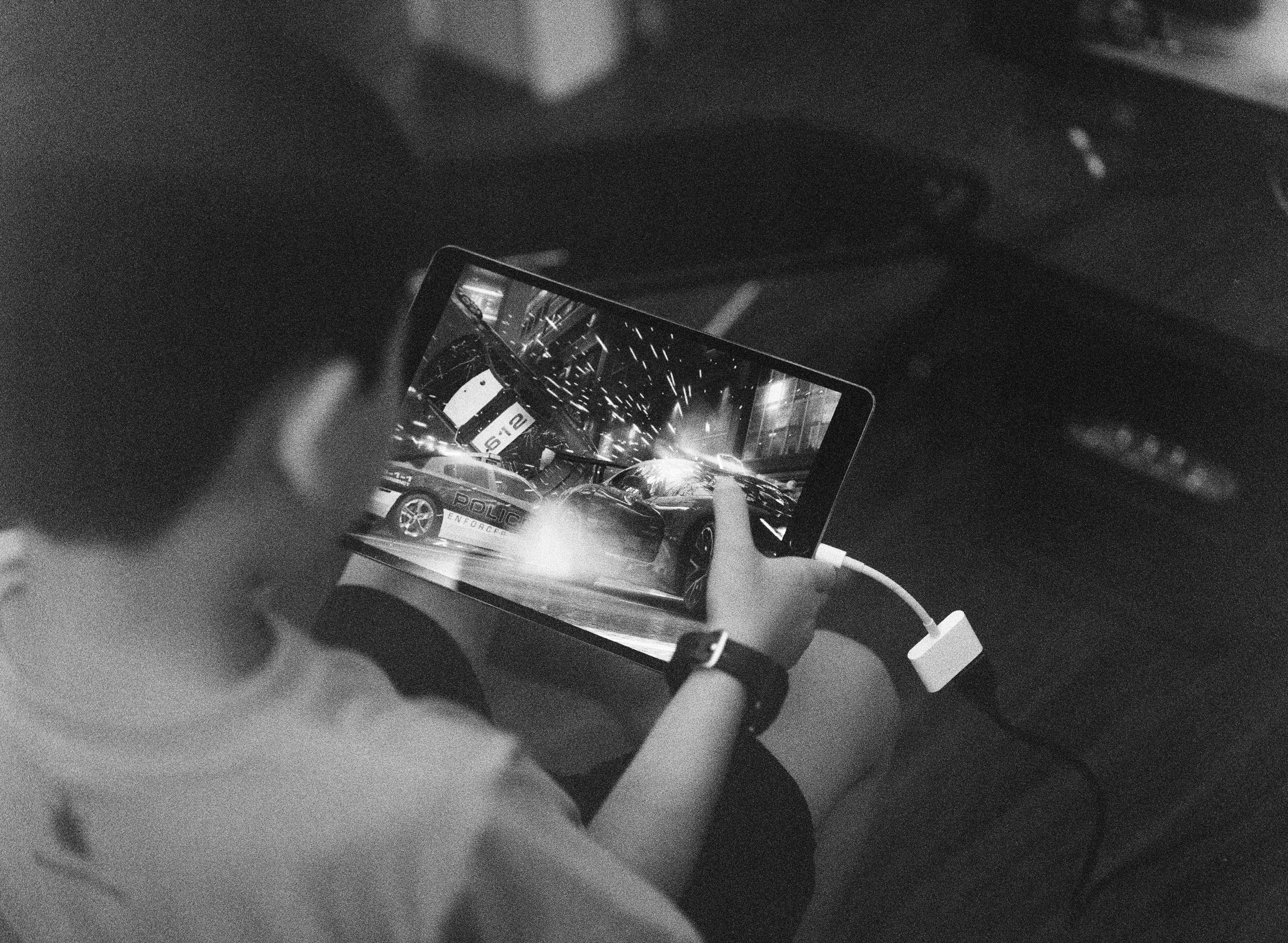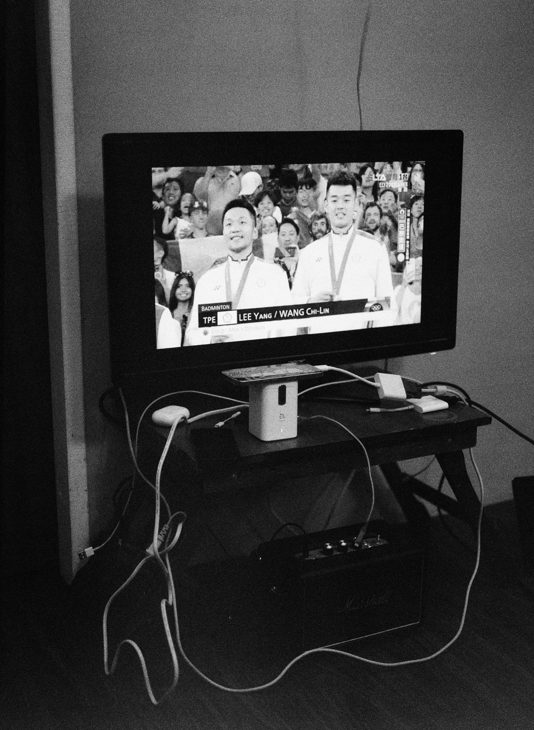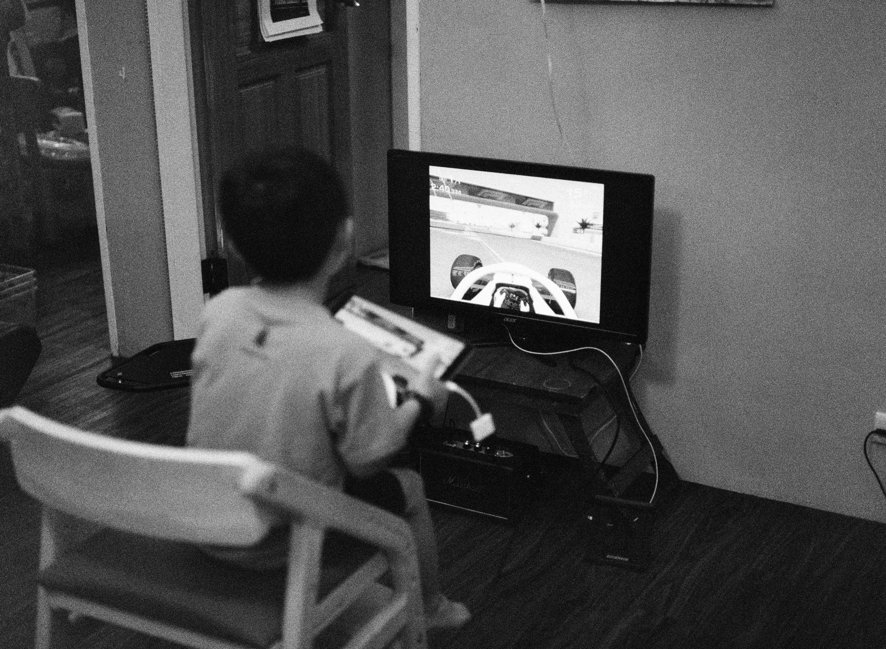 家裡那陣子架起了小電視,因為我們要在家裡看巴黎奧運,螢幕架好之後,讓兒子玩個賽車電動,測試一下效果。