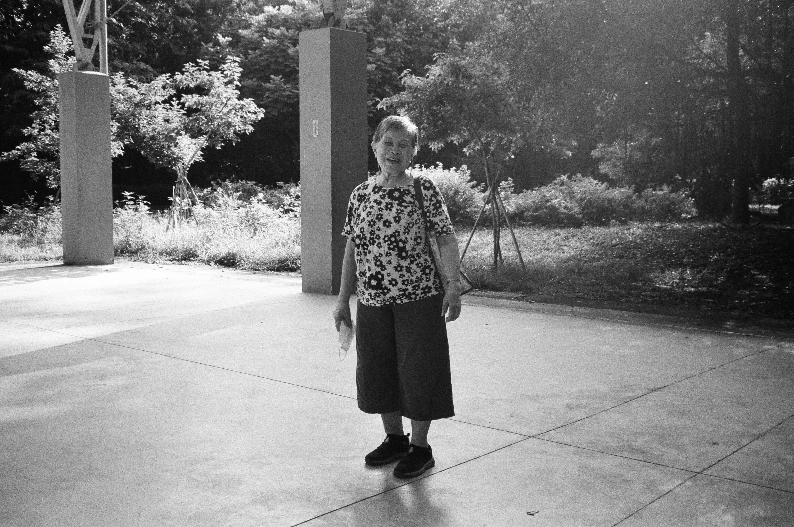 在公園偶遇我爸的姊姊,我要叫姑姑。當時我正要去跑步,戴著耳機,手上抓著 Contax T2,我跟姑姑比了比拍照手勢,沒有說話,然後姑姑很快速地拿下口罩,然後擺了個微笑給我。