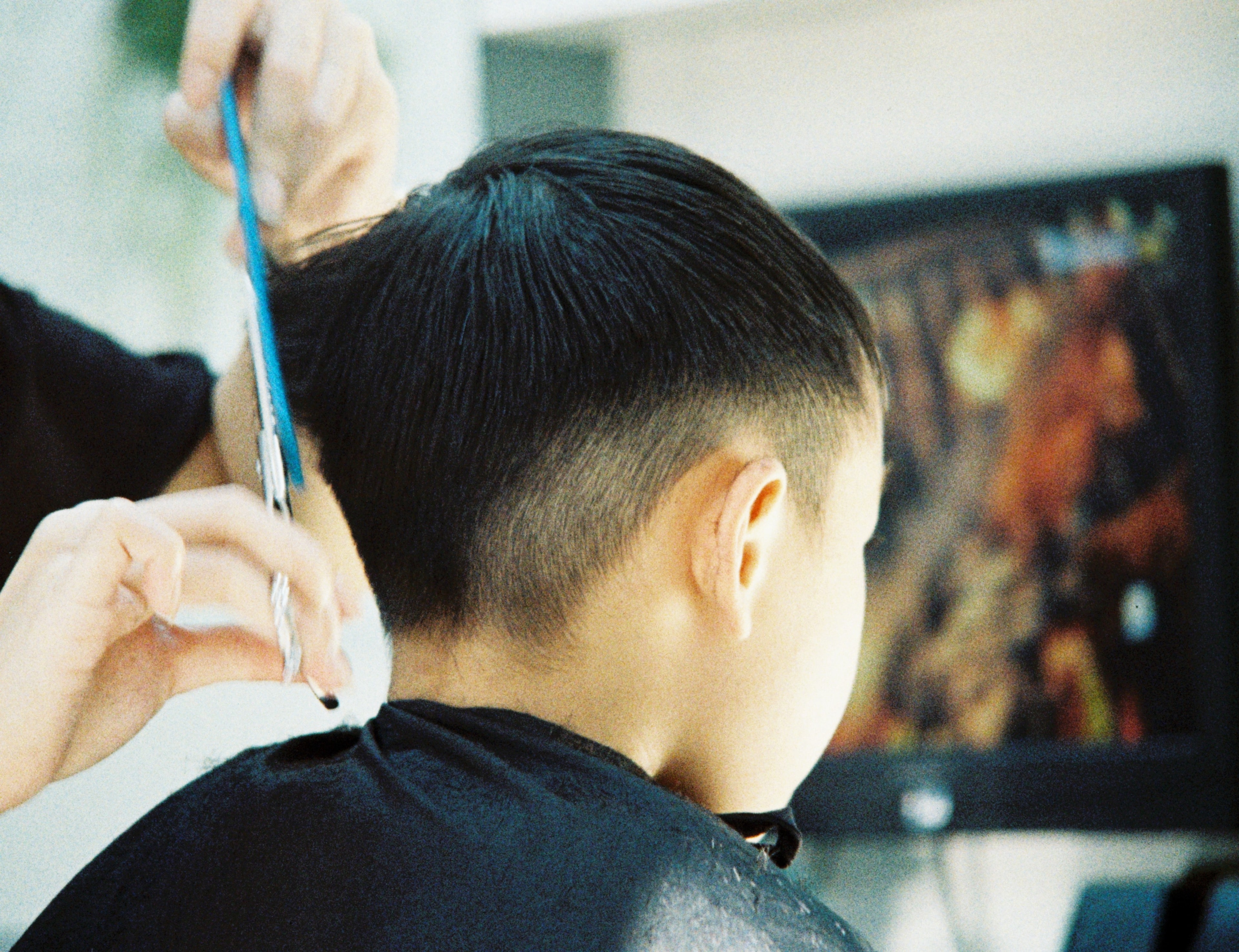 剛剪完頭髮獲得一顆糖果的五歲小孩。
