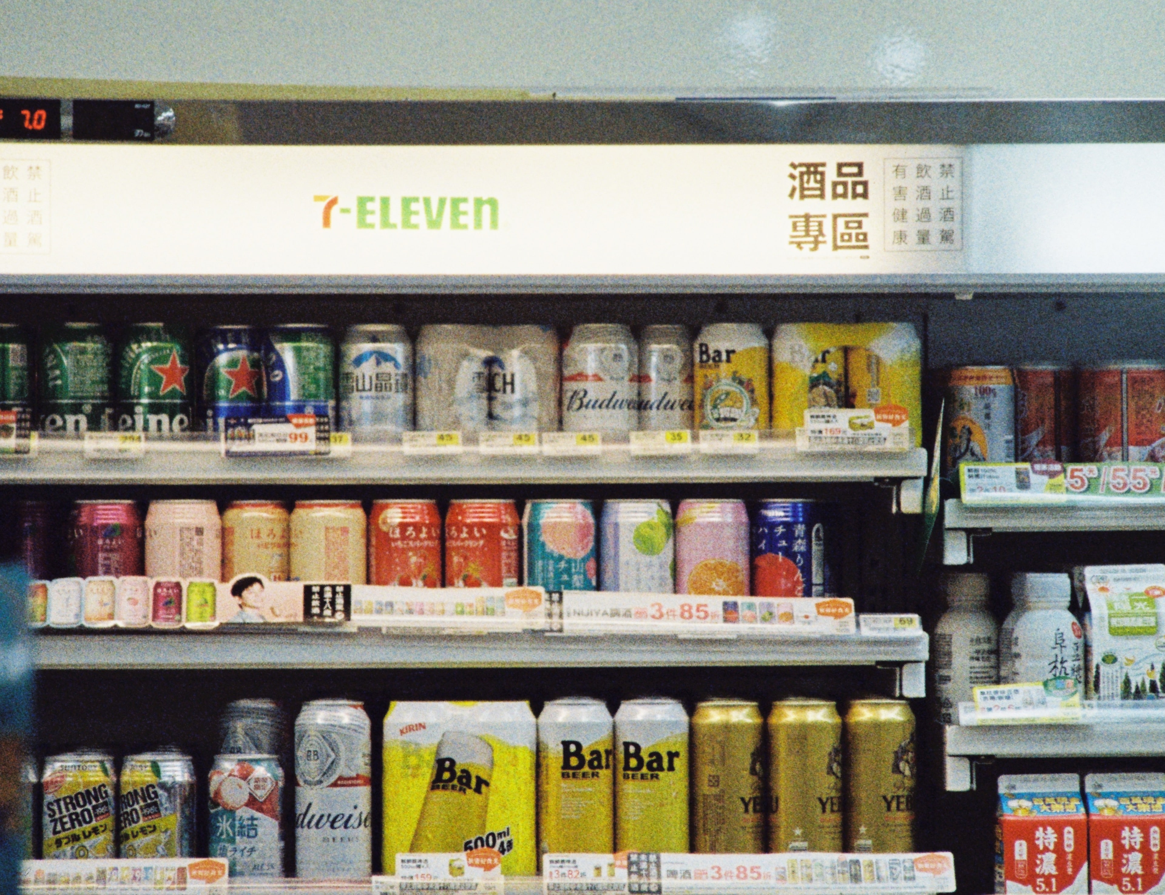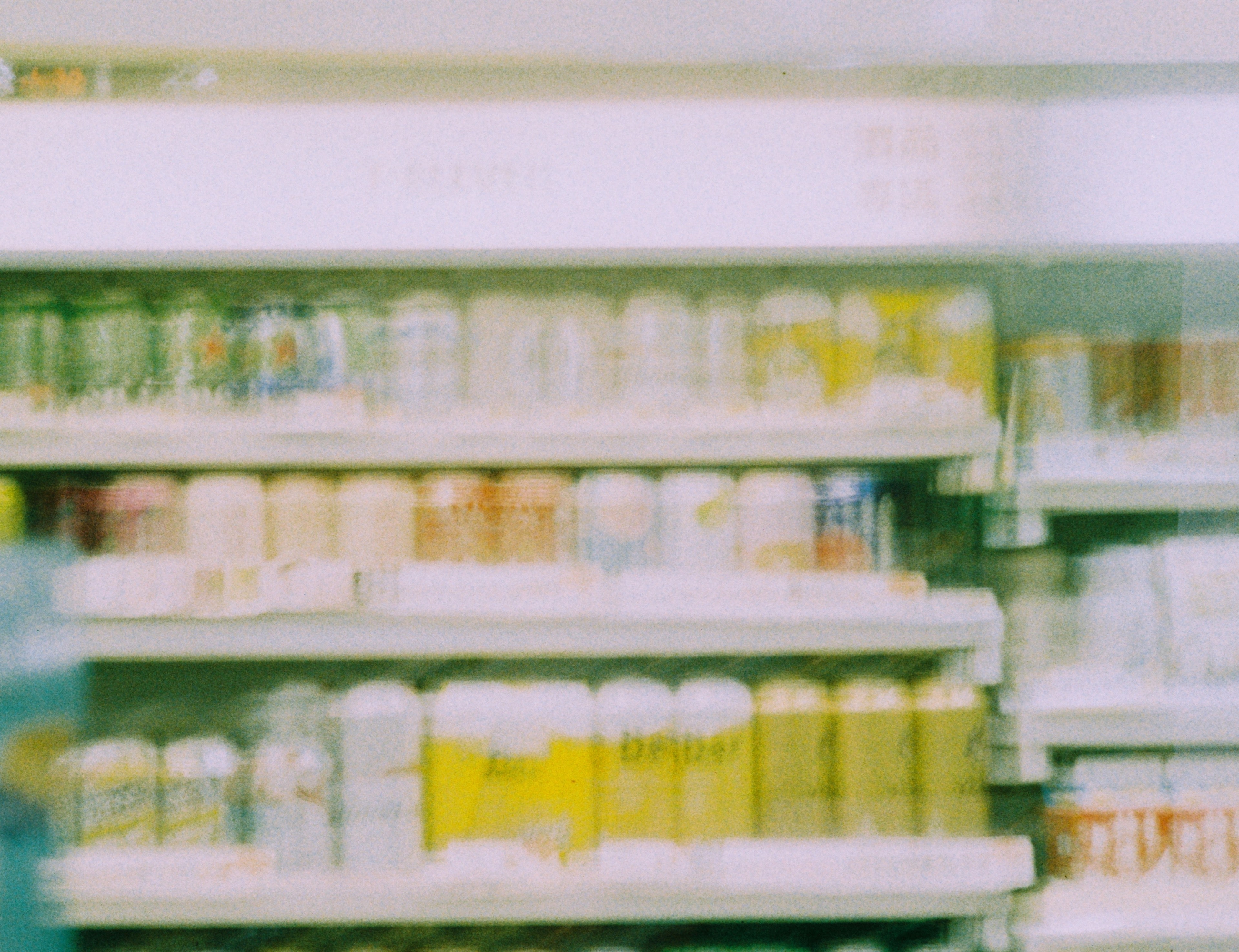 人在便利商店,本來想拍一下貨架上的瓶罐,但忘記用安全快門了。