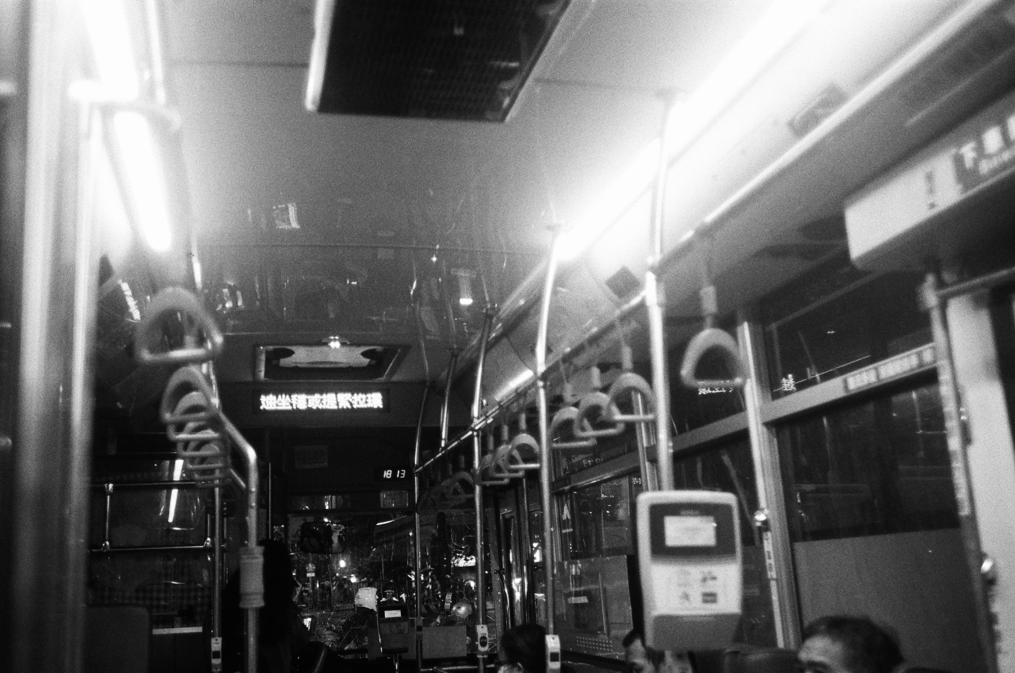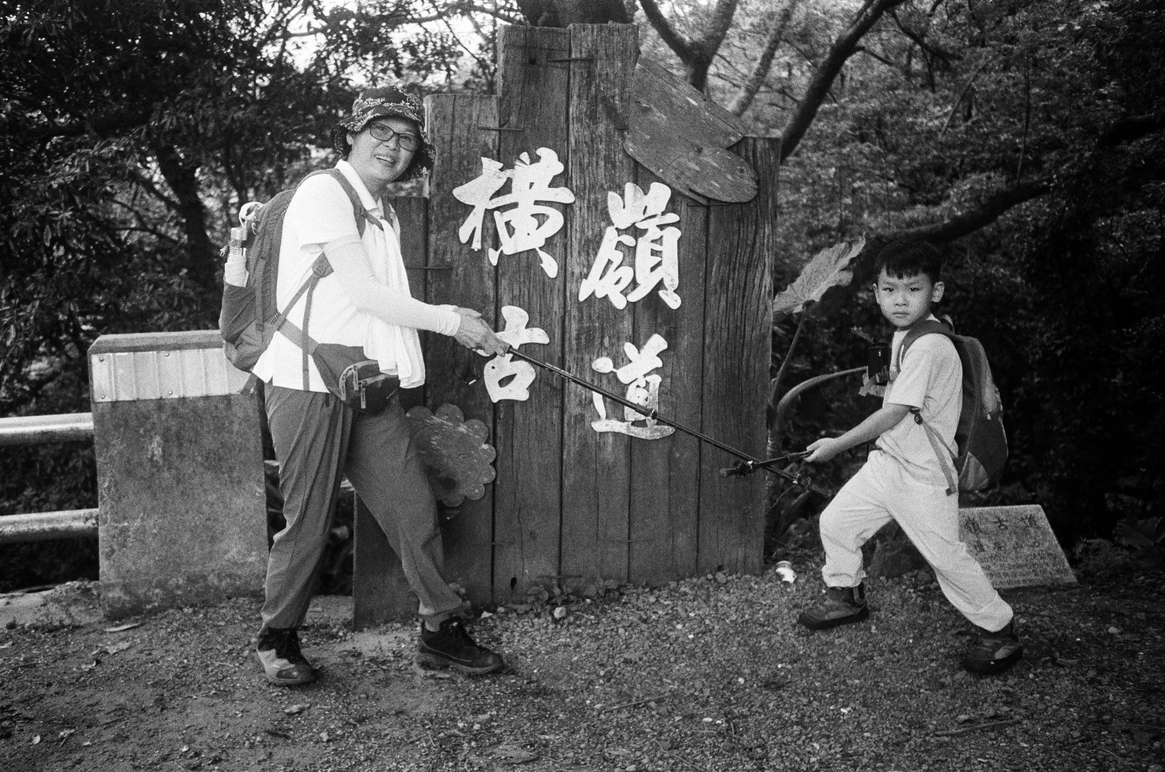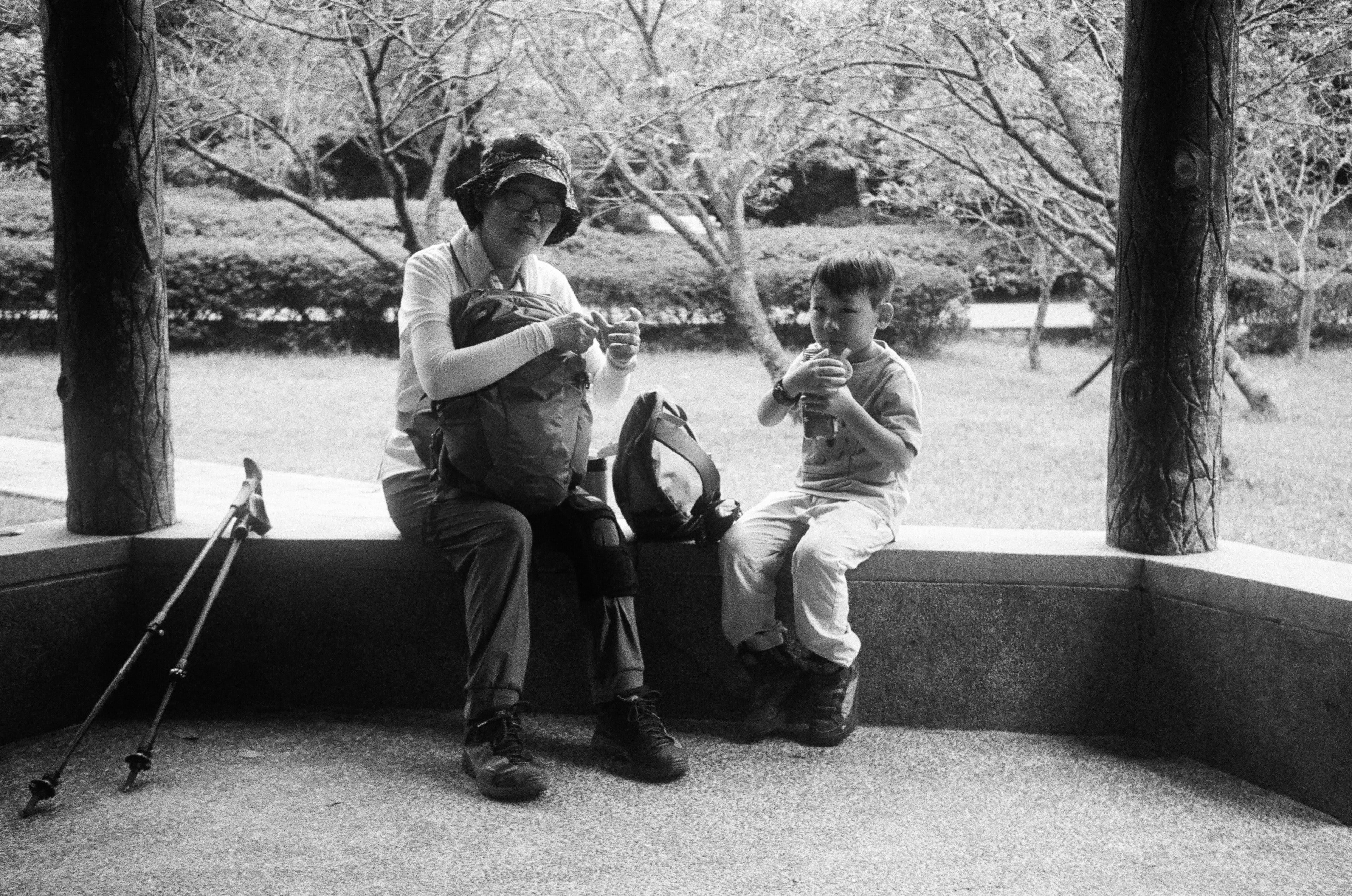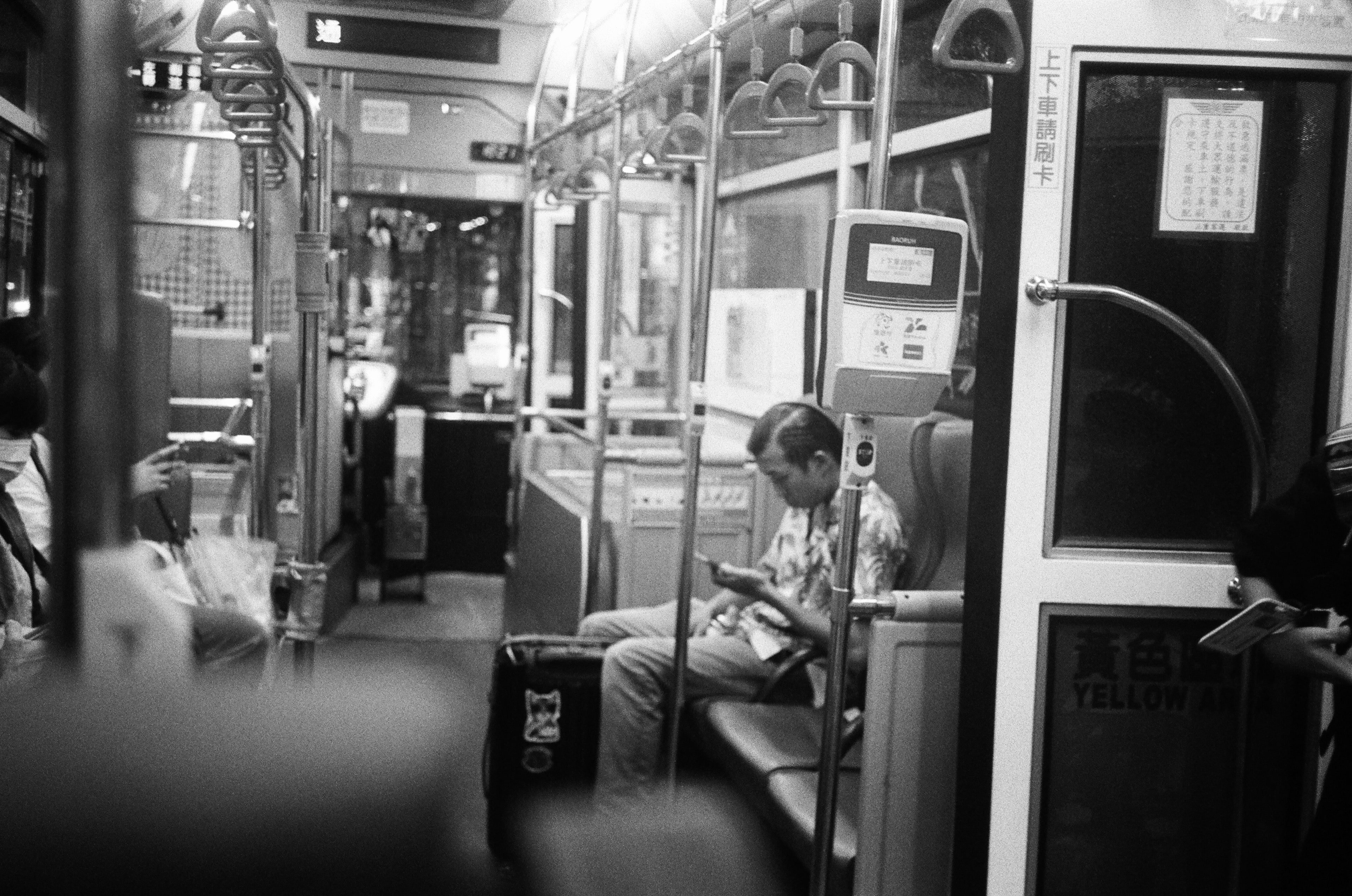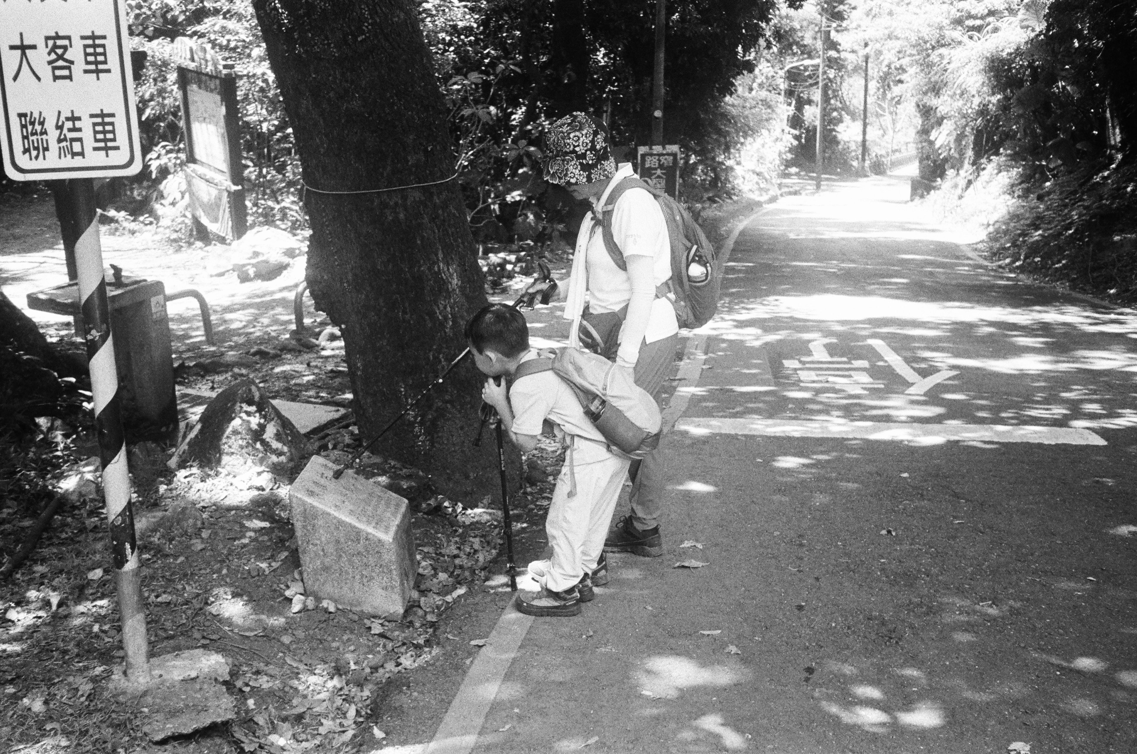 這台,我帶兒子去看電影,我提議可以搭公車去,這張照片是在公車站,我請兒子幫我拍的。可以看到這顆 Konica C35 AF 的鏡頭有點霧化(或產生了黴菌)造成了畫面中出現了朦朧感。