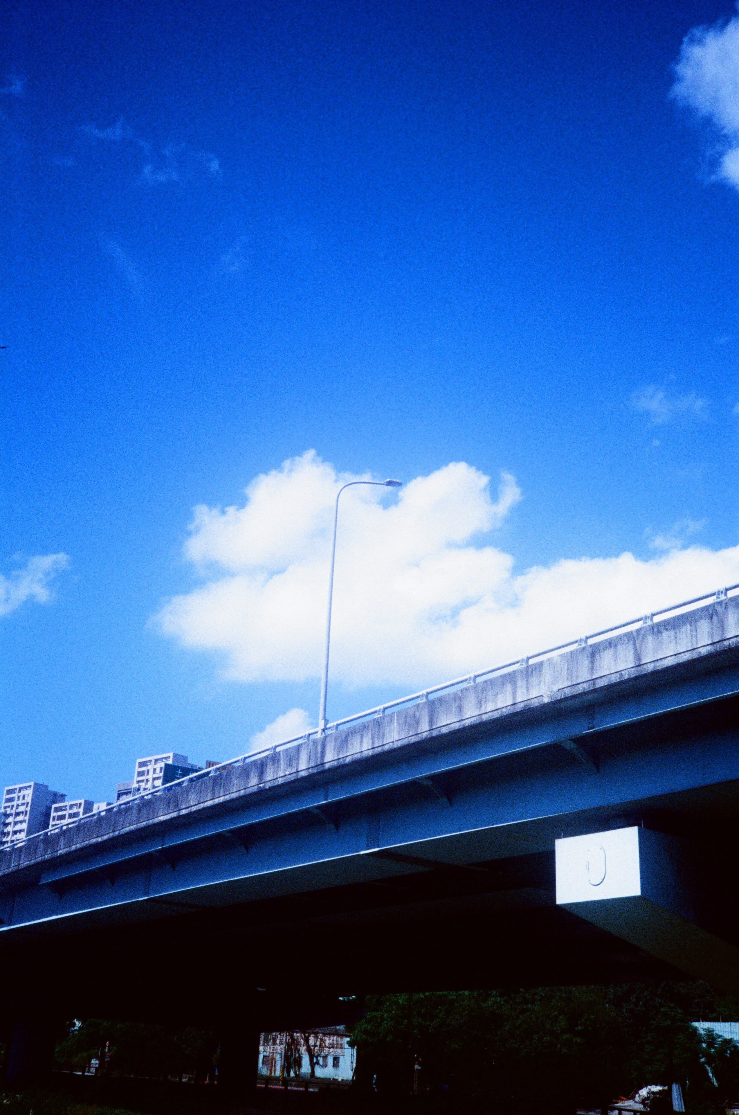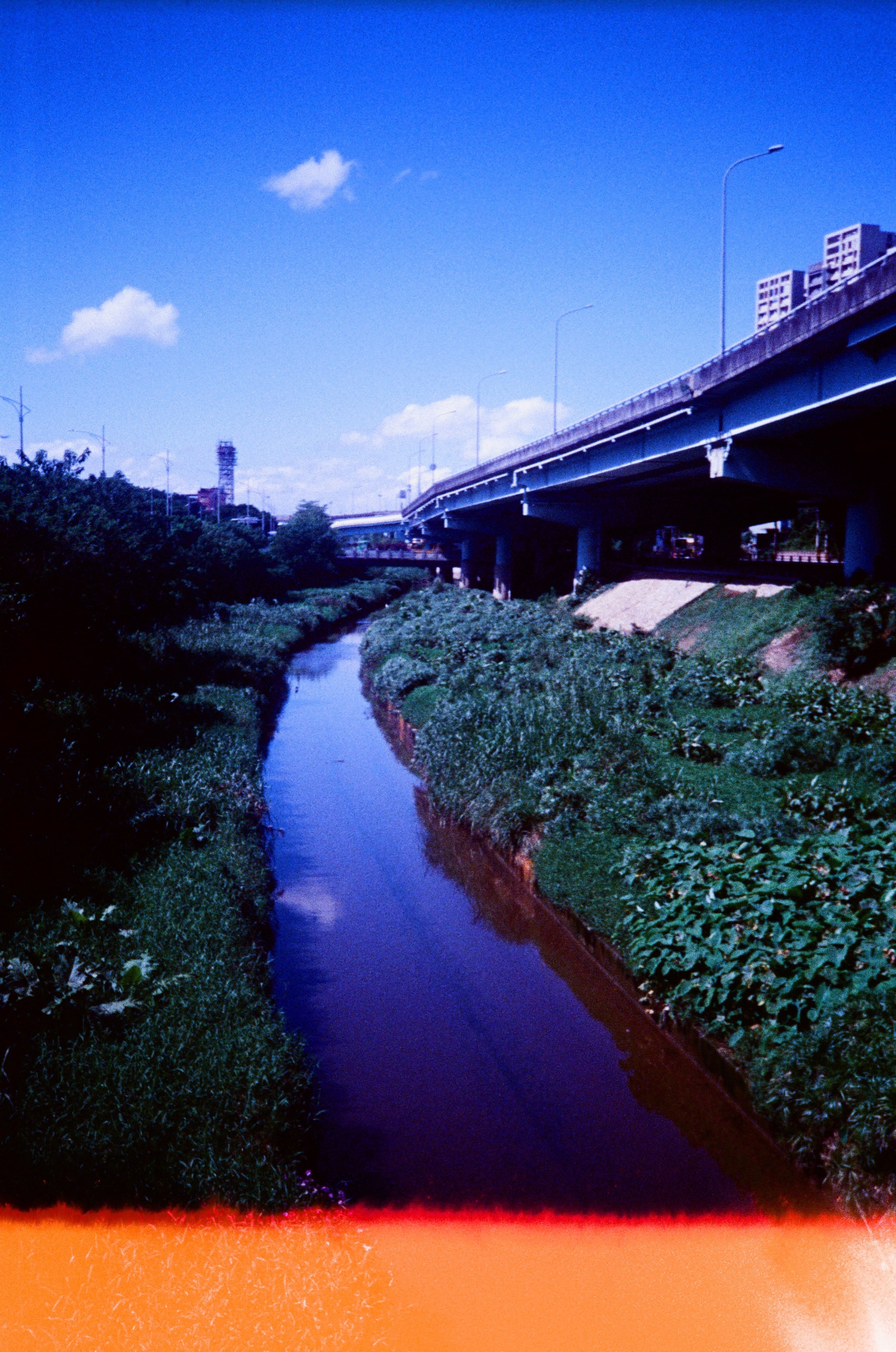 水面的湛藍倒影,在城市中,恐怕只有正片負沖能記錄下這樣的色彩。聽鄰居大哥說,這條小溪的水,在 50 年前可是很清澈的,當時他們都會在這條小溪玩,「摸蜊仔兼洗褲」是真的。