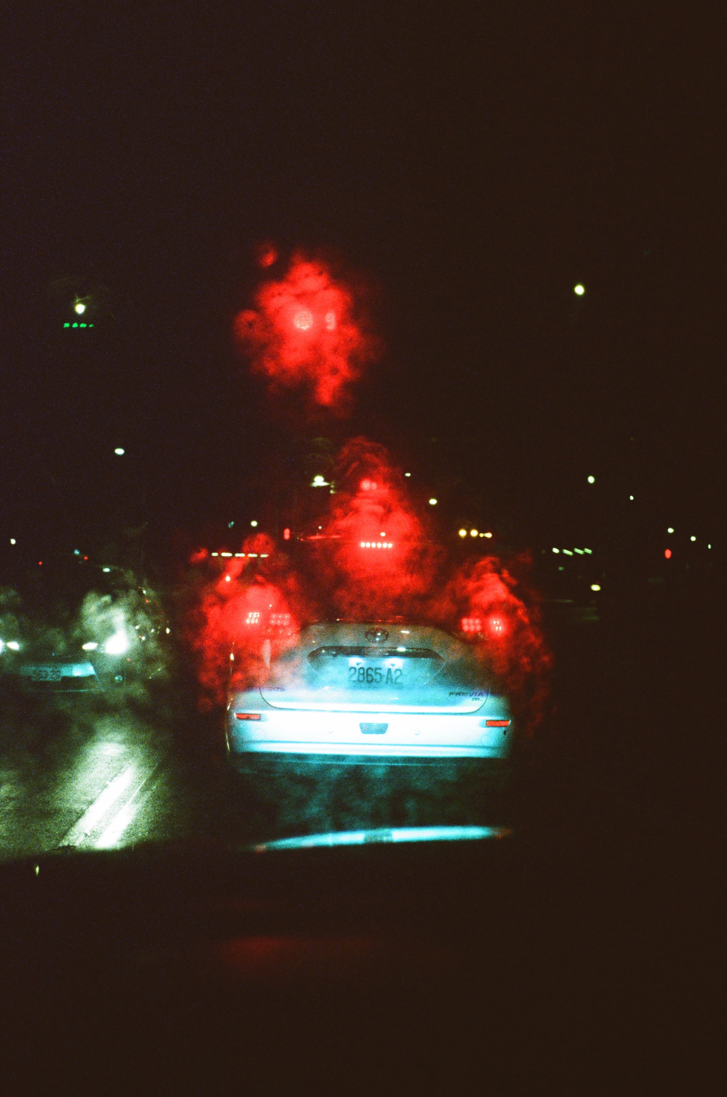 隔著汽車擋風玻璃的雨滴,光線燒起來了。