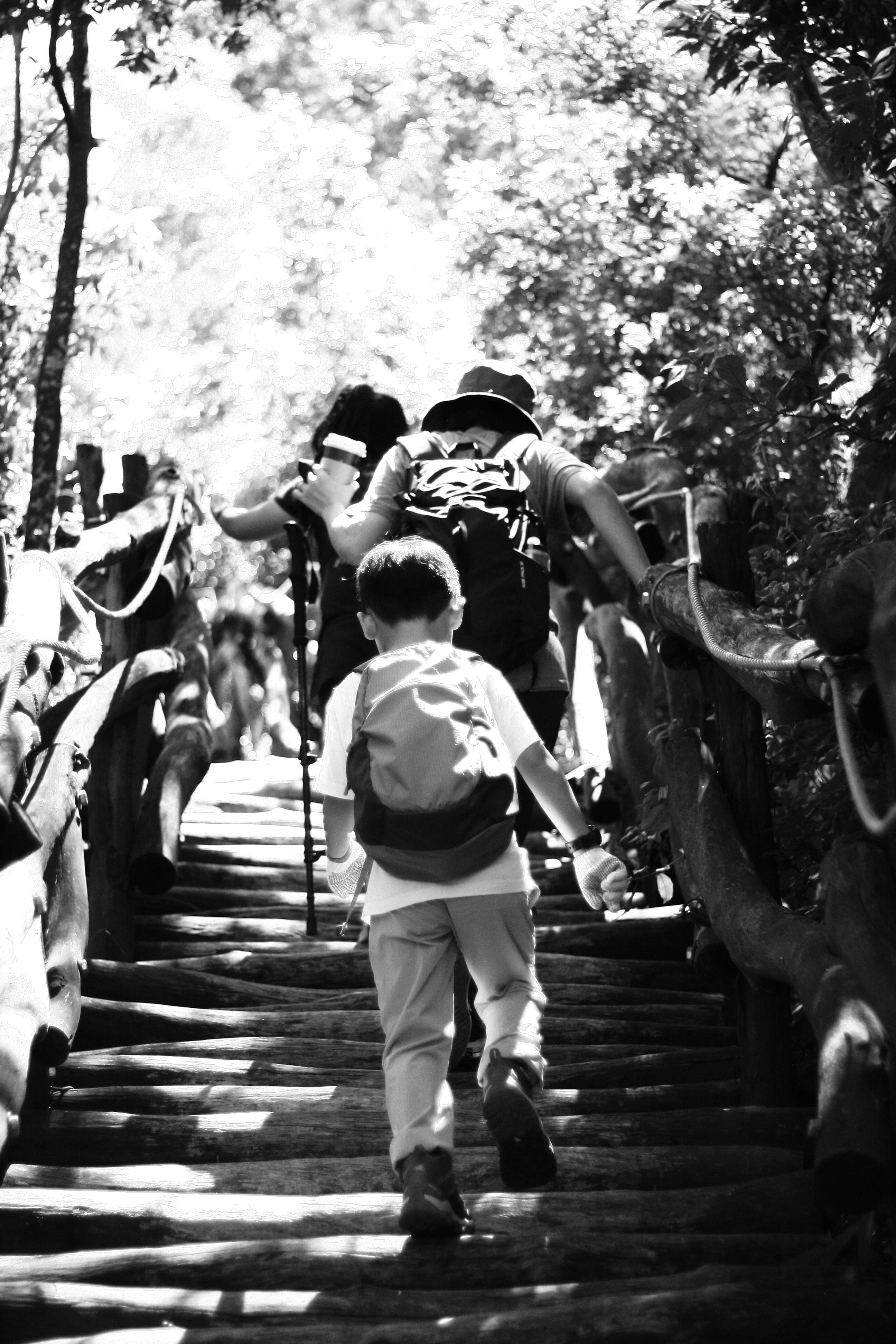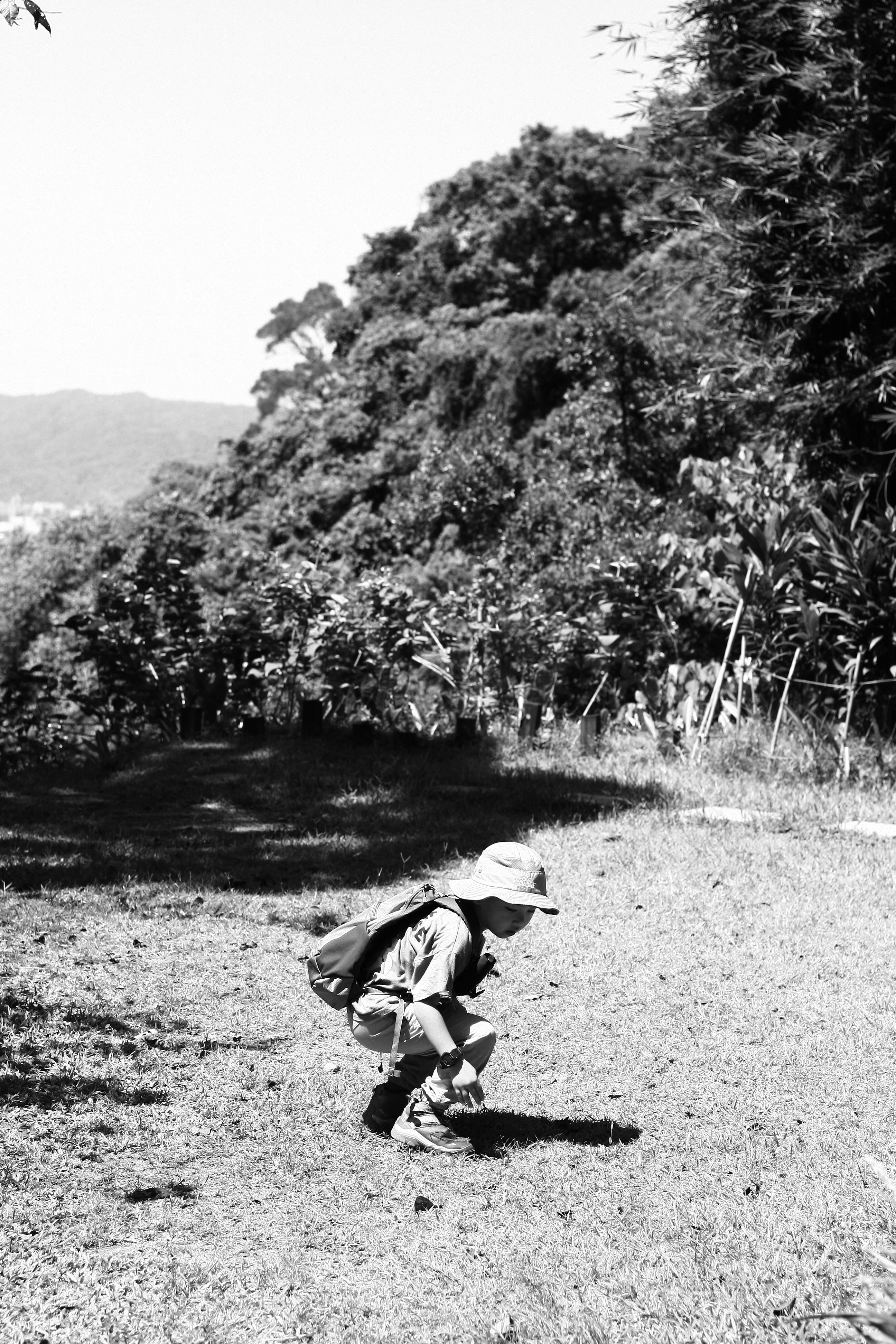 和兒子爬山中,兒子正想徒手抓一隻蚱蜢。