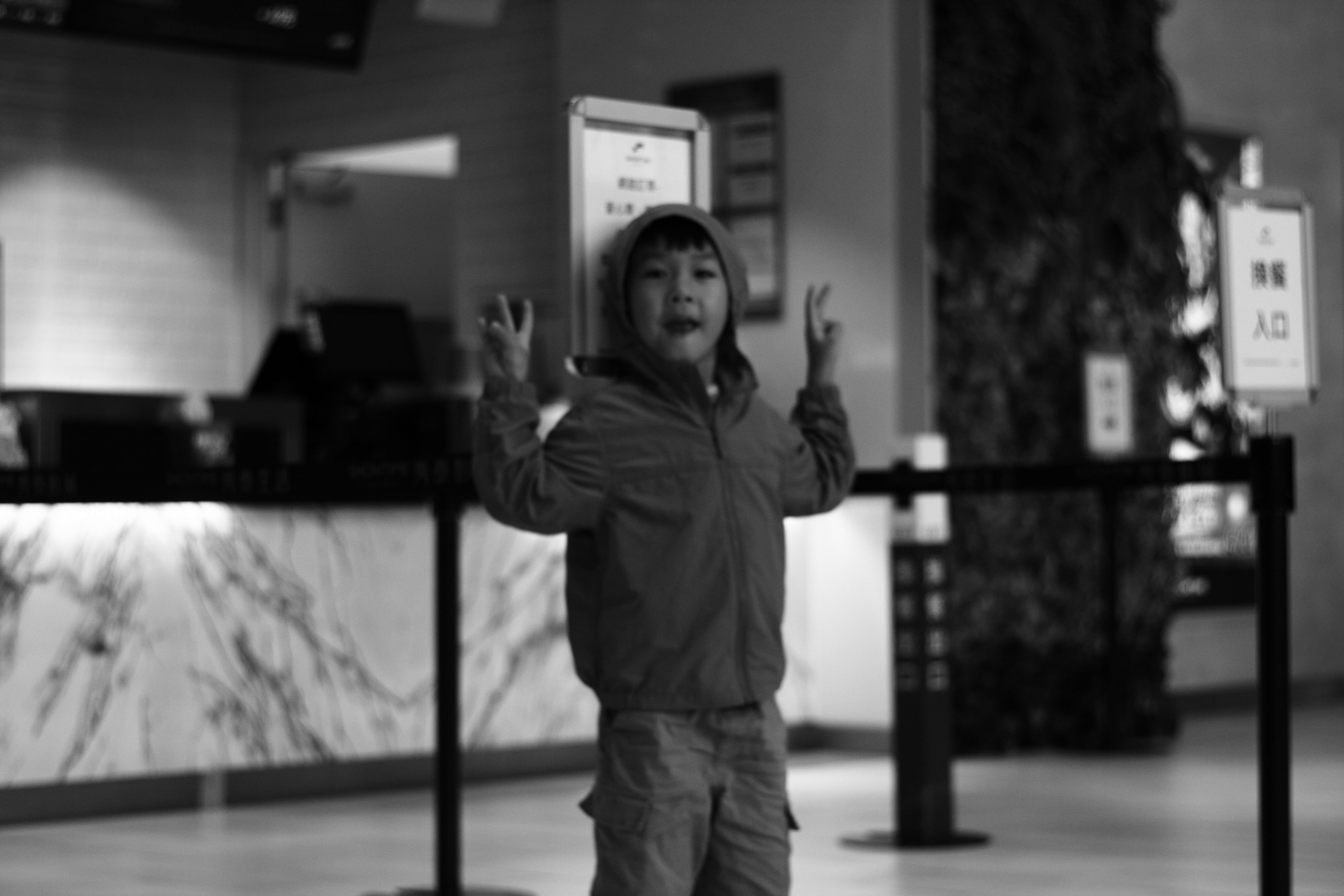 手動對焦的困難,體現在快速拍攝的照片上。這張照片是某天帶兒子去看電影,難得的父子時光。我們家帶小孩看電影,都必須要看英文的才行,算是我們自己的規定吧!