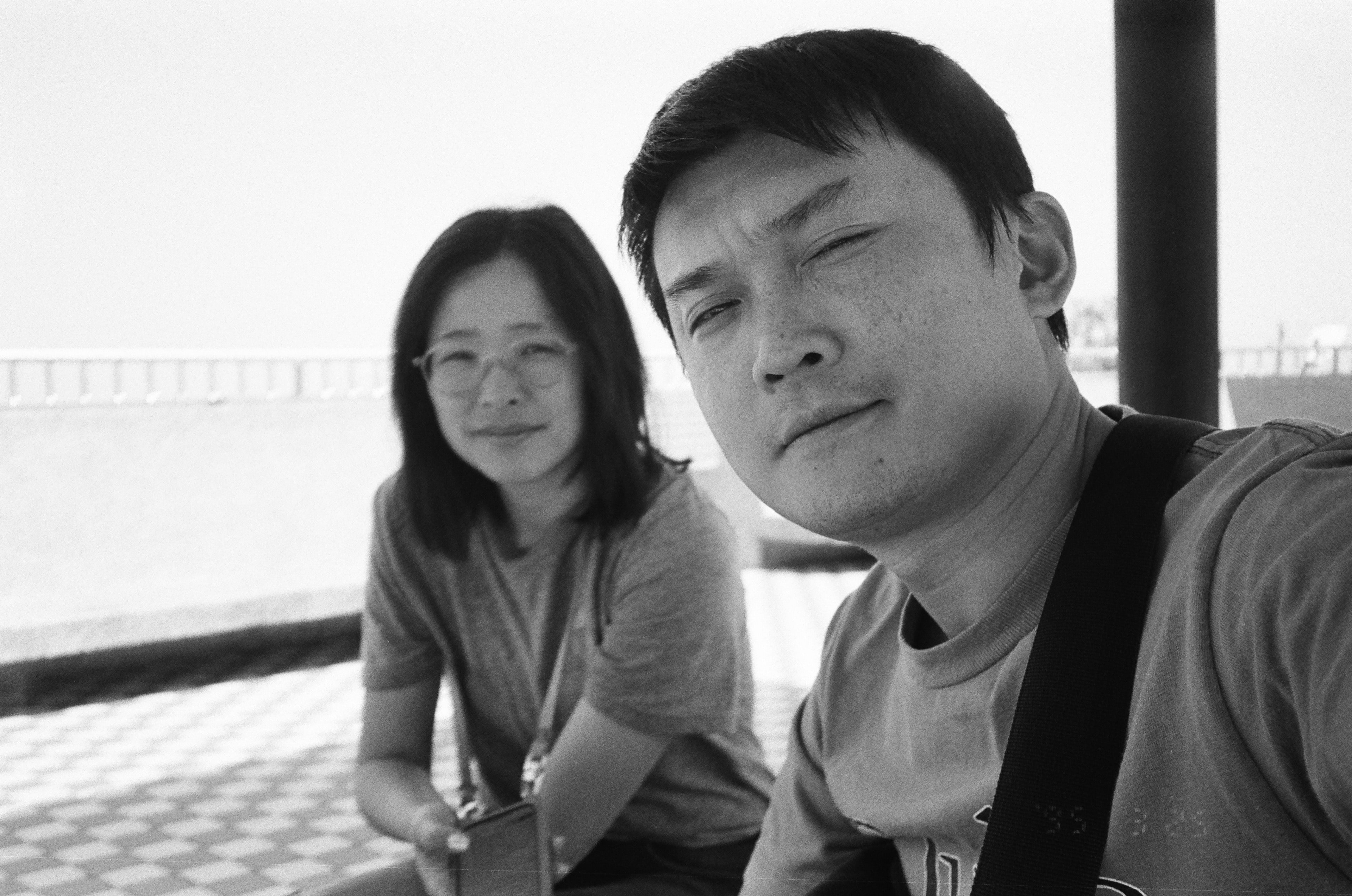 這一天,我和太太去烘爐地拜拜,因為要幫我媽求個平安符。這張照片拍攝的位置,是在烘爐地上面的涼亭,當天天氣晴朗,陽光很強,看得出來 Mju I 的設定,是優先把快門速度推到最快,然後才縮小光圈 ,因此,這張我們兩人的自拍照,位於後方的太太影像就模糊了(全片幅容易造成淺景深的宿命)。