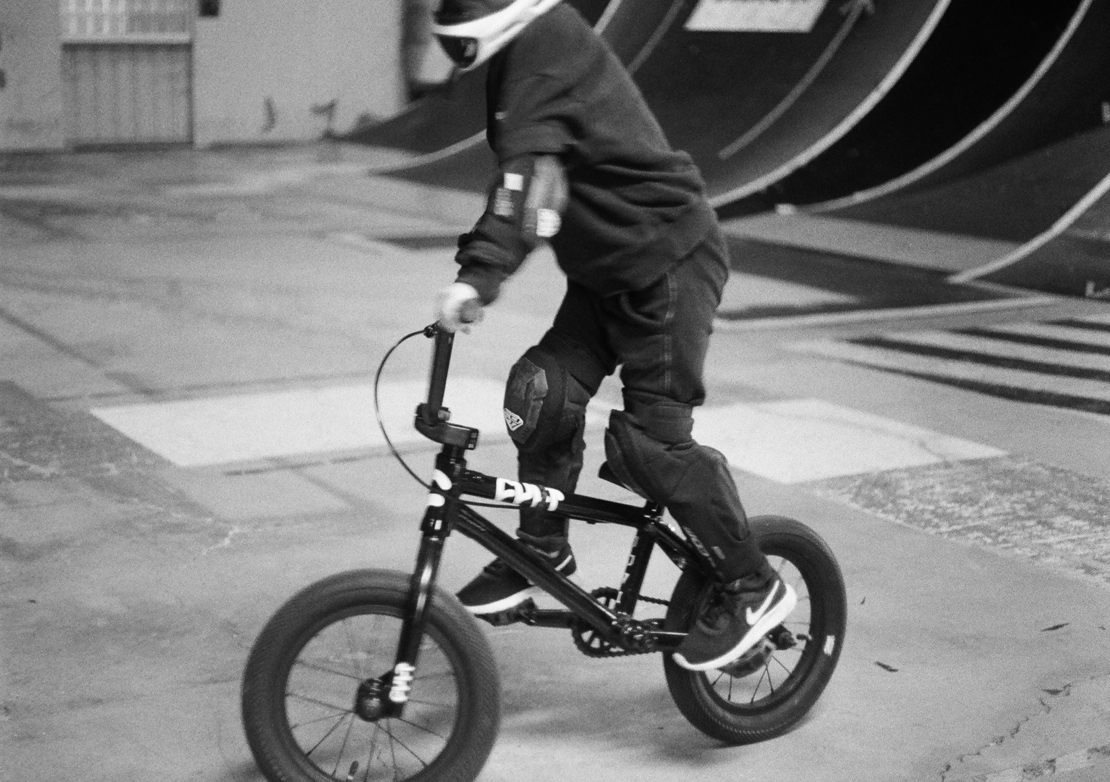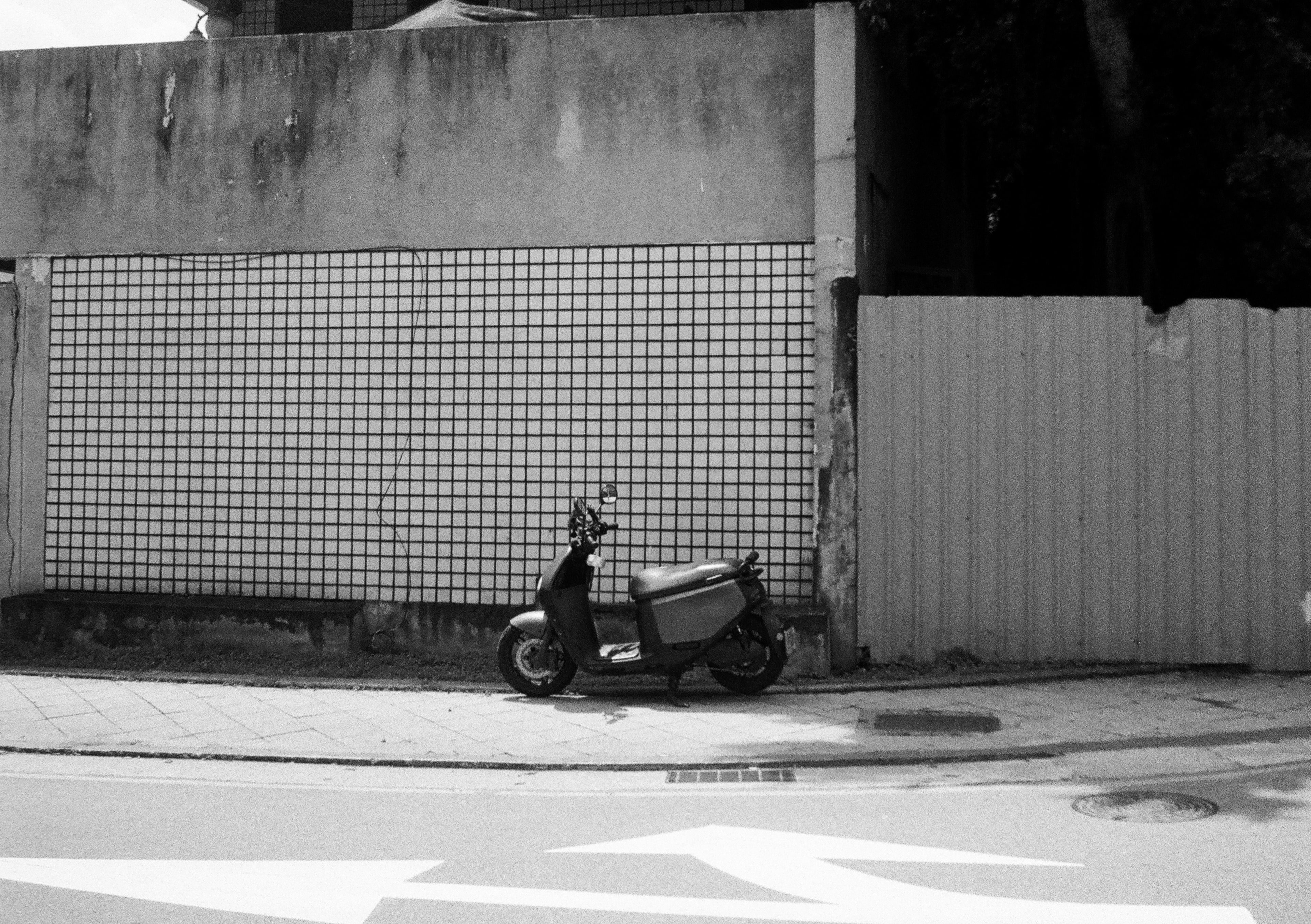 這張照片實際上是 +1.5 EV,Ilford Delta 400 雖然對過曝的寬容度沒有比 Ilford HP5 Plus 400 來得好,不過對於欠曝的寬容度確實一流的,是就我所知的黑白底片中表現最好的。我之所以會在這卷 Pen F 搭配使用 Ilford Delta 400,是因為我用的這顆輕量化 25mm f4 鏡頭的最大光圈偏小,我擔心它的低光表現,因此才特別選擇 Delta 400 來使用,如此一來,我在光源不足時,也可以放心的使用 1/30 安全快門進行拍攝。這張照片是我騎我媽的機車到處跑的視角。