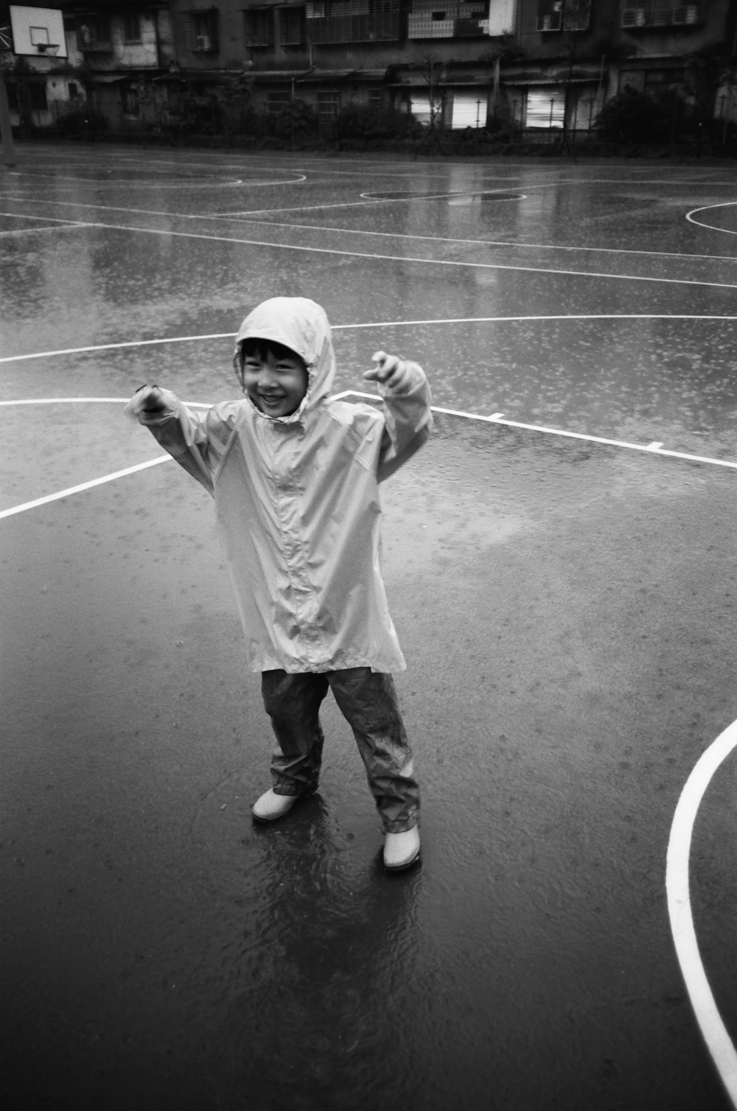 這天帶著兒子去未來他要唸的國小量制服尺寸,當天下著大雨,但兒子因為好奇,所以穿著雨衣在國小的操場中逛逛。