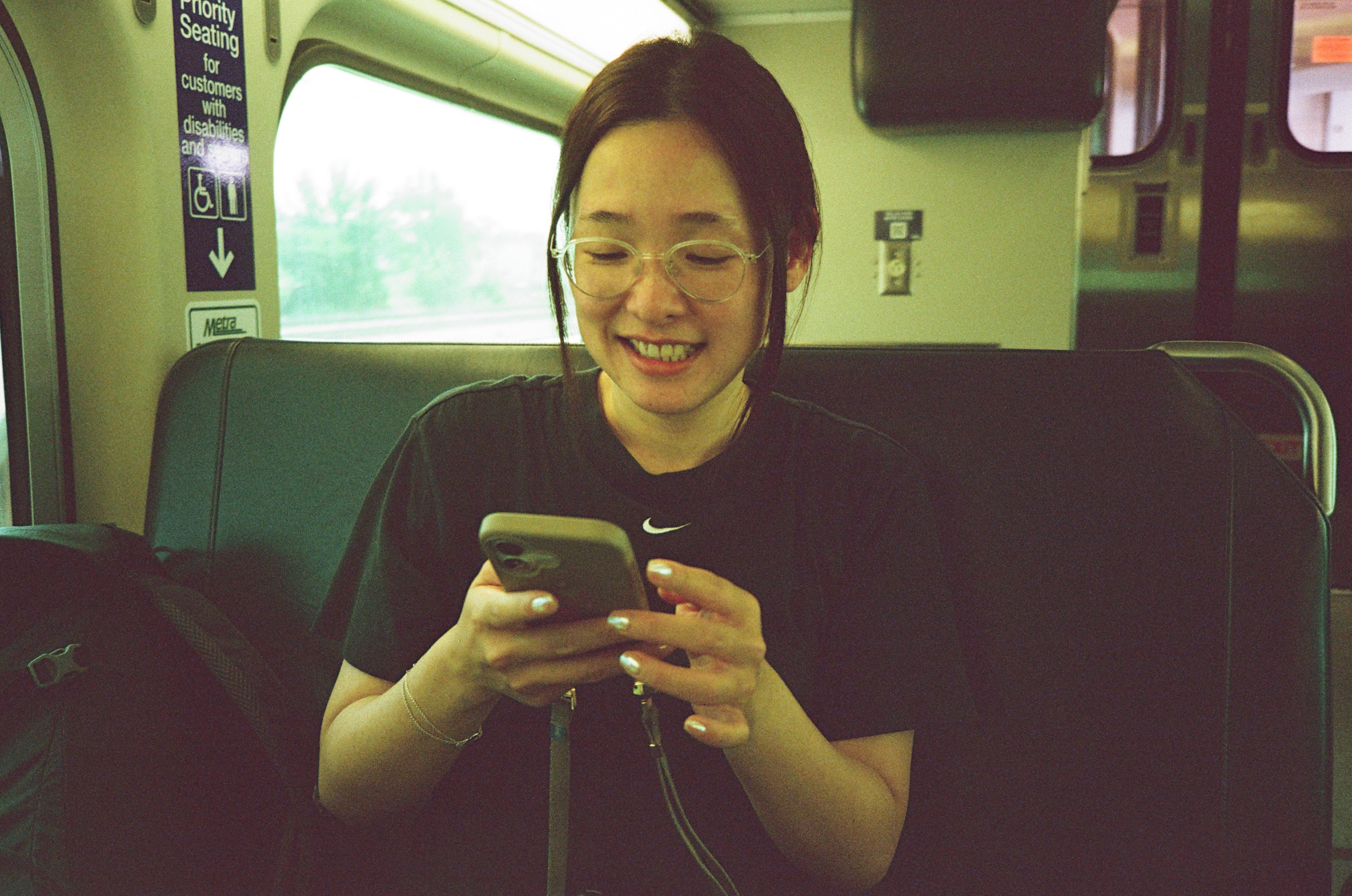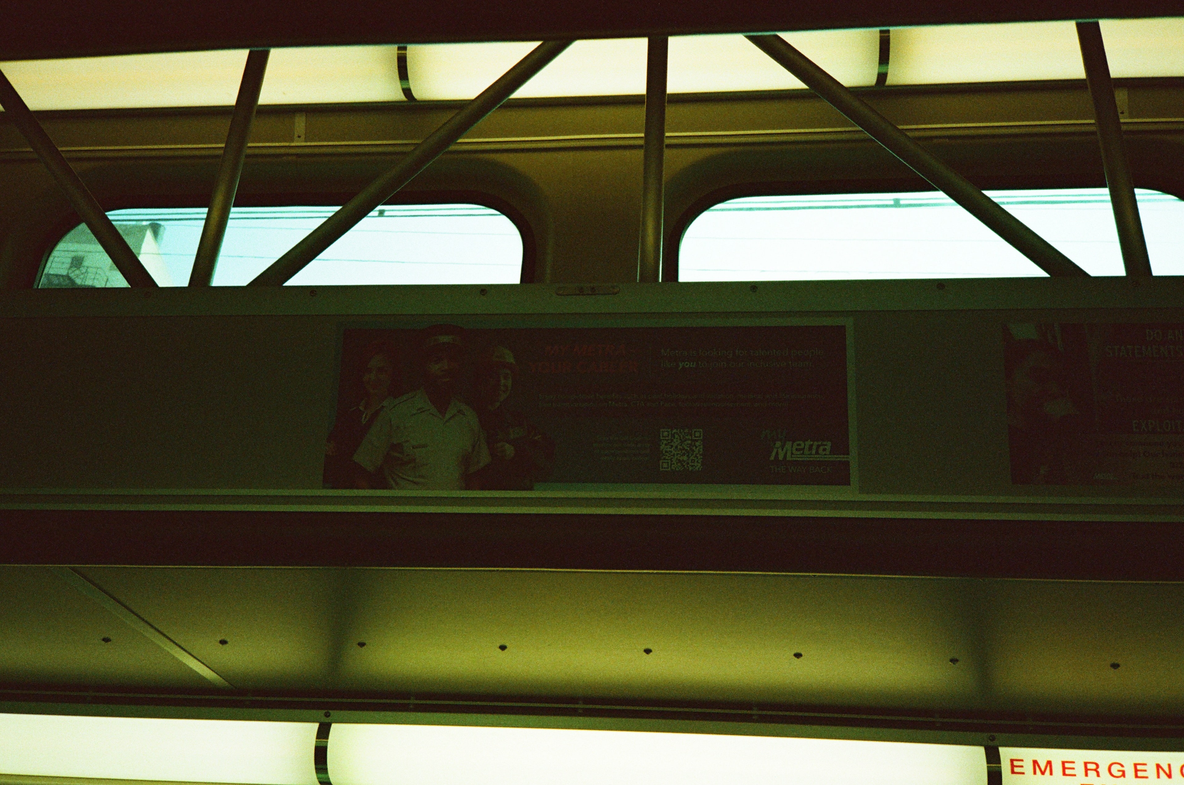 這是車廂內的芝加哥大眾運輸系統招募員工的廣告,雖然拍不清楚,但我是想記錄當時這個廣告用的三位模特兒都不是白人,或許是法規問題,或許是白人真的不會願意做這種基層工作。我們上車時,雖然月台是無人管理的,不過上車後,就有查票人員站在門口,檢查我們的車票,他是一位和善又高大的非裔美國人,很有耐心地指導我們如果正確使用手機 App 中的電子車票,同時也跟我兒子說了幾句話聊天,無論兒子聽不聽得懂,這都讓人覺得在芝加哥搭火車是可以安心的。