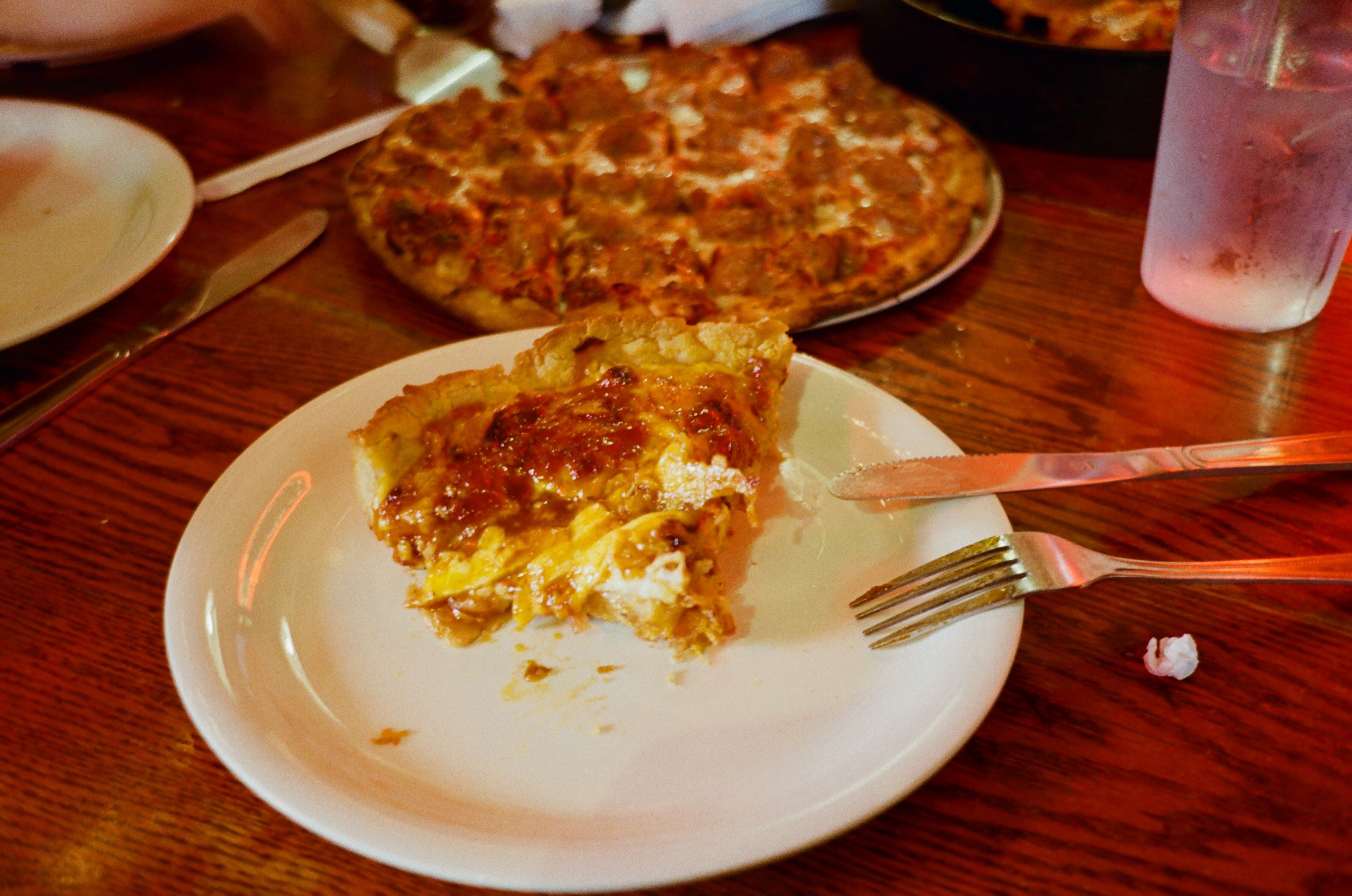 吃到一半的芝加哥深盤披薩(Deep Dish Pizza)。