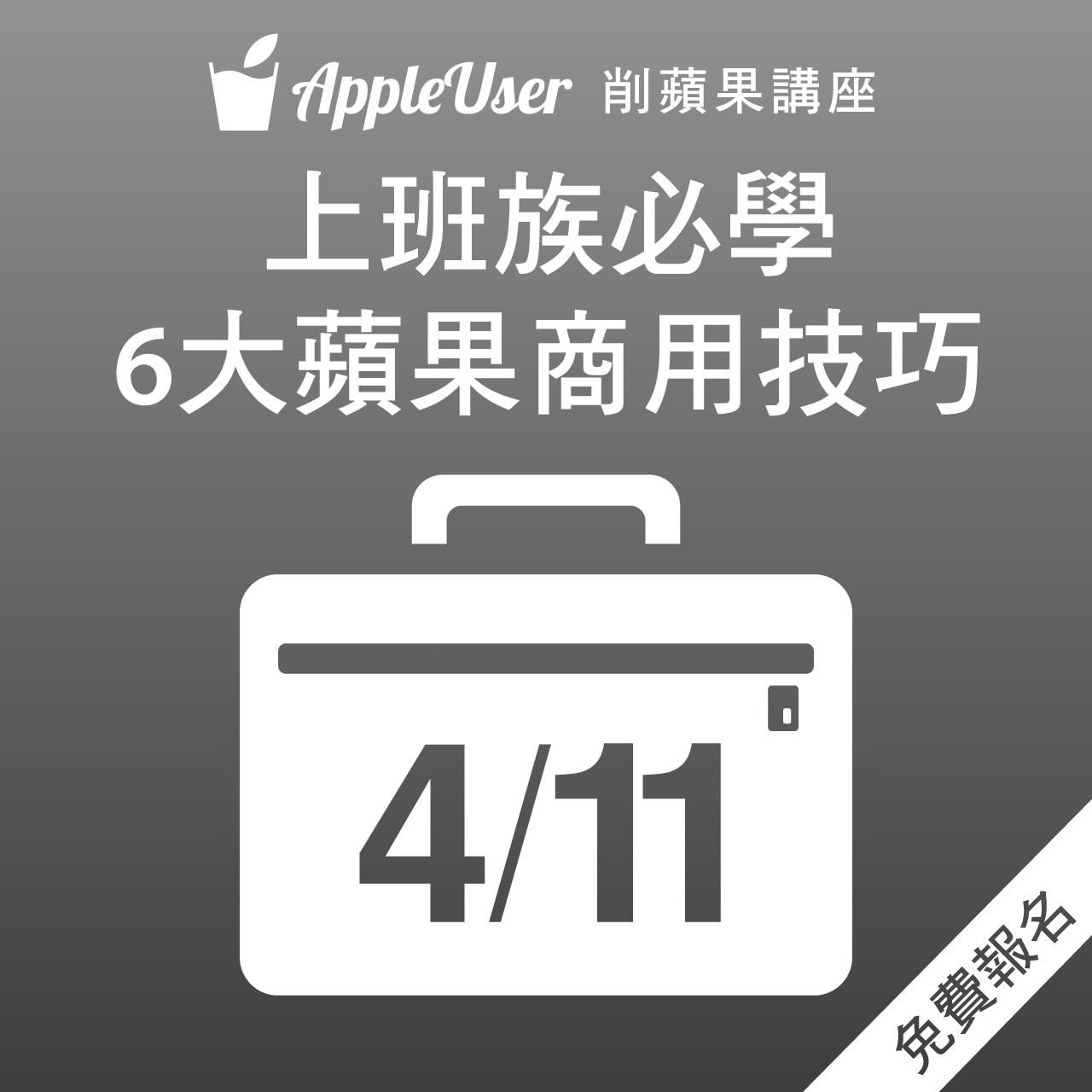 四月份削蘋果講座的主題,我們請到了兩位蘋果圈前輩-Dr.愛瘋站長柏青哥和 TRBlue 站長阿信,幫我們主講蘋果商務應用主題之「上班族必學 6 大蘋果商用技巧」。我們這次的削蘋果講座是免費入場的哦,只要事先報名,當天都有入場贈品可以拿!贈品包括蒙恬名片王Snap2PDFWorldictionary 等付費 App(三抽一,名額有限)。