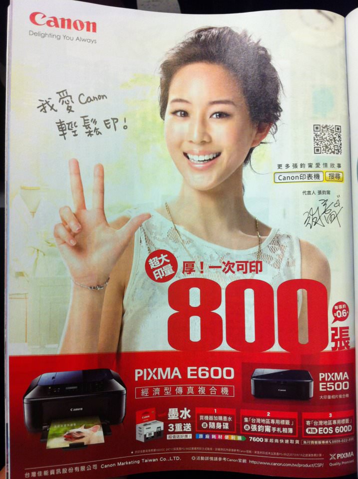 這篇廣告讓我在捷運上翻商周的過程中,不自覺把目光停留下來。仔細想了想自己的眼球順序是:張鈞甯 -> 主標題「800張」 -> 印表機圖片 -> 「墨水3重送」區域。