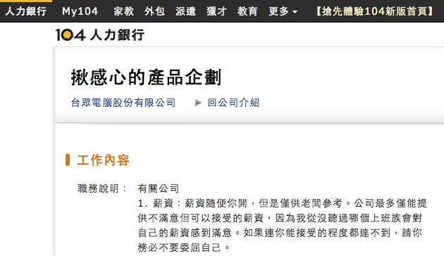 有天在 104 上面看到下面這段工作敘述,覺得裡頭文案超有趣的!雖然我不是他的 TA,但我還是把它看完了!一個徵才啟示能寫到這樣,真的是成功了啊!